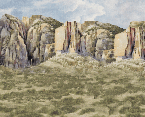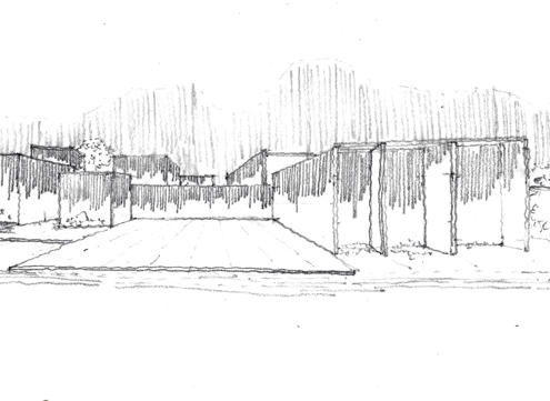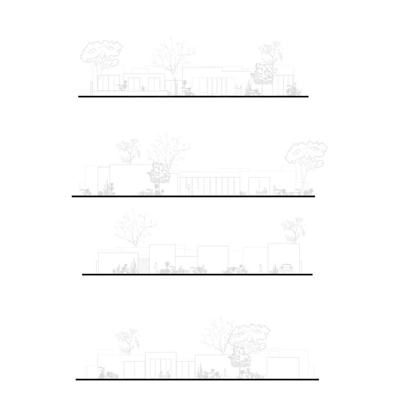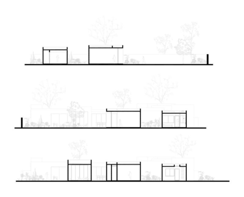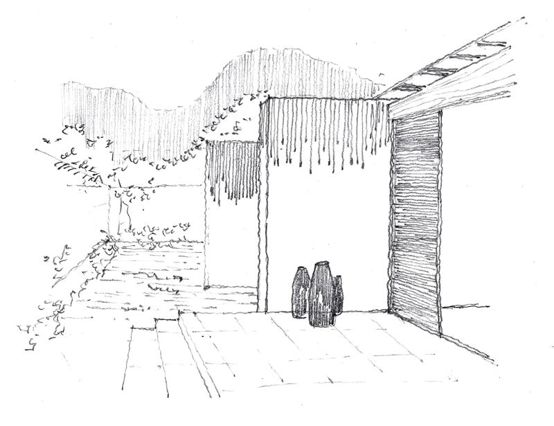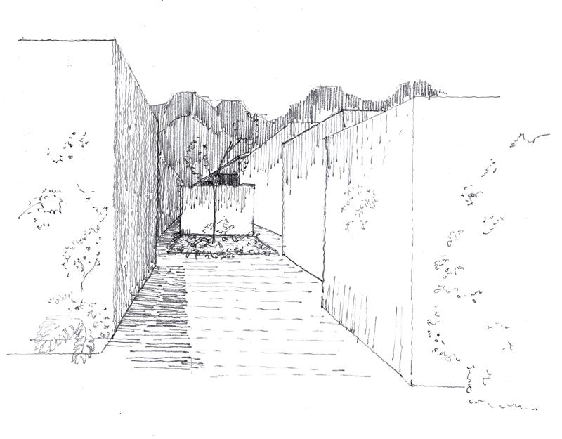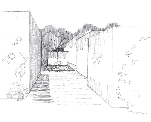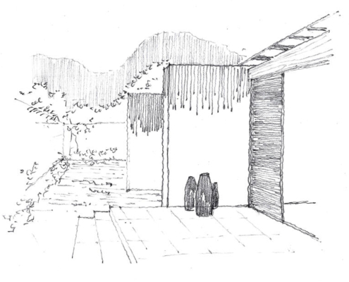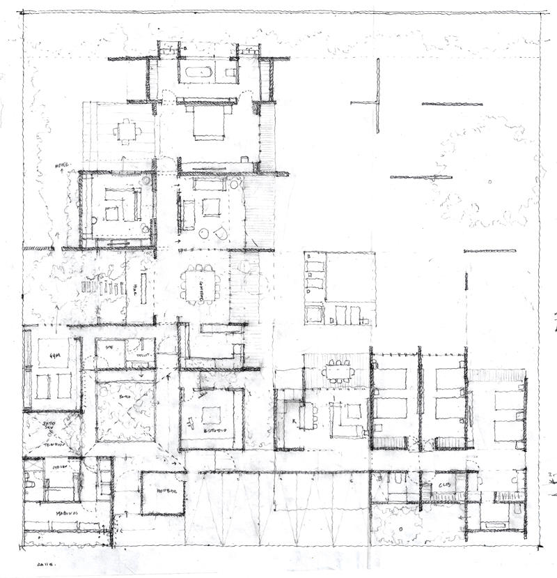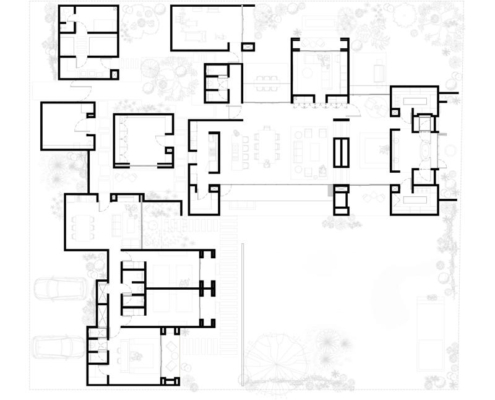 Ana kapıdan girildiğinde, evin iki kanadını birbirine bağlayan, hizmet odası ile sanat stüdyosuna ulaşım sağlayan bir avluya çıkılıyor. Büyük bloklarla çevrili bu avlu, geçiş yollarıyla birlikte keşif duygusu uyandırıyor. Ortadaki stüdyo bloğu ise yalnızca tek bir pencereye sahip ve dolaylı ışıkla aydınlanıyor. Avlunun sol tarafında, mutfağın gizlendiği, geniş oturma odası ile yemek odasının yer aldığı ana kanat bulunuyor. Bu bölümlerdeki geniş pencereler, ön ve arka bahçelere açılıyor. İleride, televizyon odası ve dağ manzarasına bakan ana yatak odası yer alıyor ve her ikisi de bahçeyle doğrudan ilişki kuruyor.