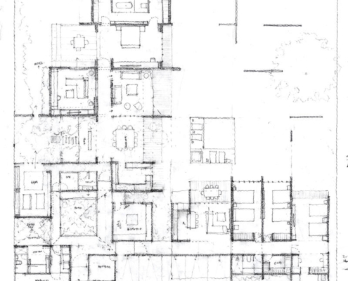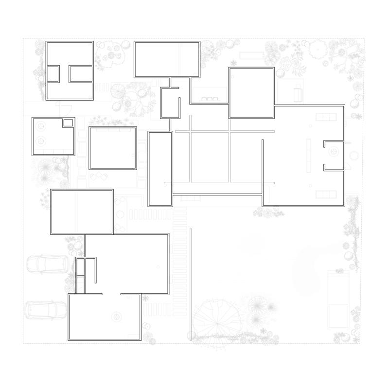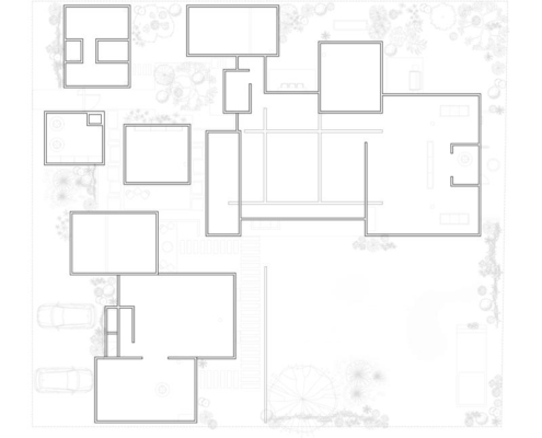 Evin L biçimli planı, iki kanadın manzaraya açılmasını sağlamış ve tepeye doğru geniş bir görüş kazandırmış. Sağ kanatta üç yatak odası, küçük bir mutfak ve bir televizyon odası yer alıyor. Geniş bahçe, oturma alanları ile çevrelenmiş. Dört yatak odası ve oturma odası bu bahçeye açılıyor. Ek bölümler ise yeni avlular ve katmanlı manzaralar oluşturarak doğal ışığın iç mekanlara girmesini sağlıyor.