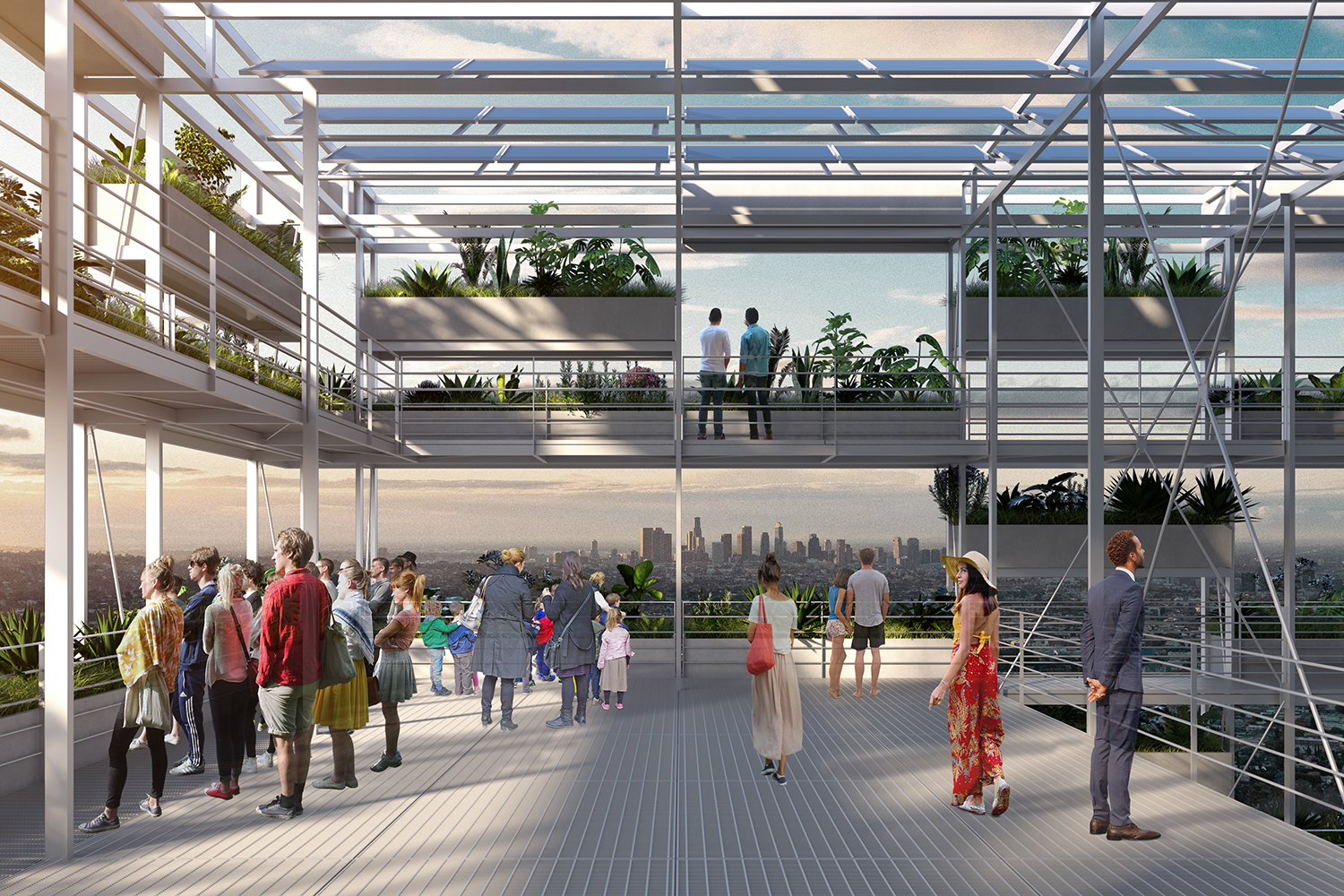 Dikey Tarla – Los Angeles projesinde yarışma şartnamesindeki işlev şeması yeniden yorumlanarak dikey tarım alanı üst katlara taşınmış, böylece bina oturum alanı minimize edilmiş. Yapının arsada güneydoğuya konumlandırılması, gelecekteki büyüme olanağını ve kamusal açık alanların oluşturulmasını sağlamış. Zemin kat, toplama, işleme, laboratuvarlar ve ofisler gibi temel işlevlere ayrılırken, bu katta cadde ile ilintili halka açık yeme içme alanları da konumlandırılmış. Havalandırmayı iyileştirmek ve bitki raflarına erişimi kolaylaştırmak amacıyla dikey tarım hacimleri iki kata bölünmüş. Yapının görsel etkisini yumuşatmak, ayrıca cepheye ve açık alanlara gelen güneş ışığını gölgelemek için çelik taşıyıcılar ve saksılardan oluşan geçirgen bir dış kabuk tasarlanmış, bitki yetiştirme temasını sergileyen yeşil cephe ve kentsel tarım yapılan açık alan peyzajı ile bütüncül bir “bitkilendirilmiş mimari” elde edilmiş. Ayrıca çatıdaki güneş panelleri, atık yönetimi için kompost alanı, yağmur suyu depolama ve kullanımı gibi sürdürülebilir çözümler önerilerek yapının işlevi kadar kendisinin de sürdürülebilir olması hedeflenmiş.