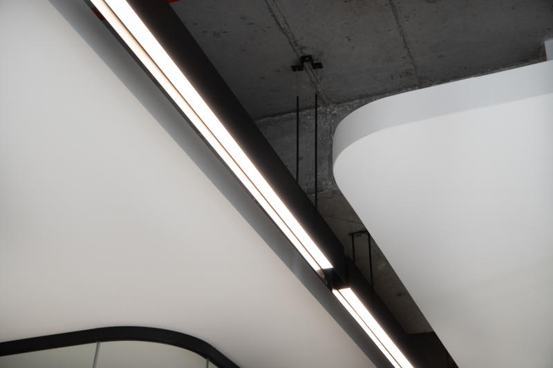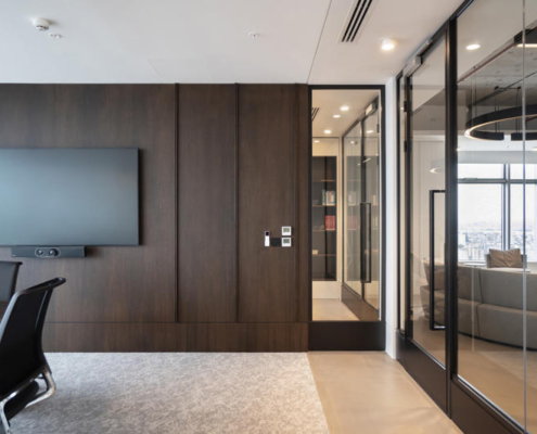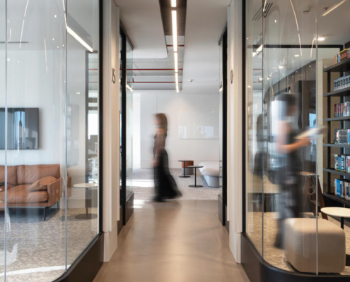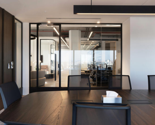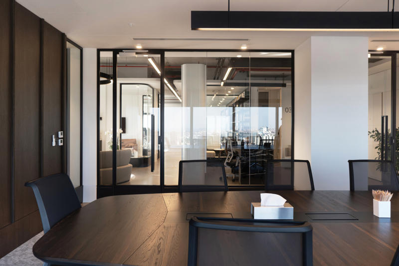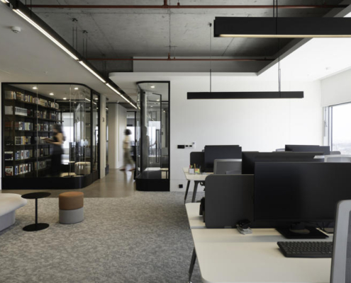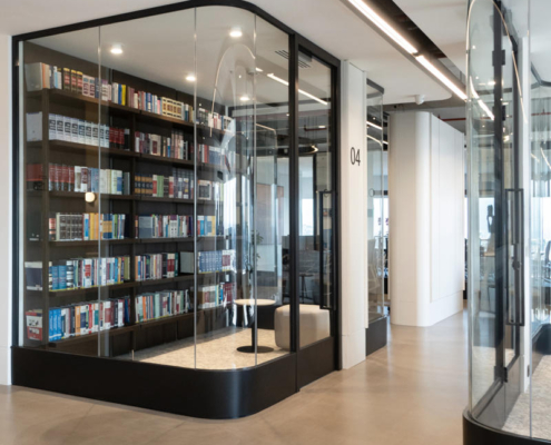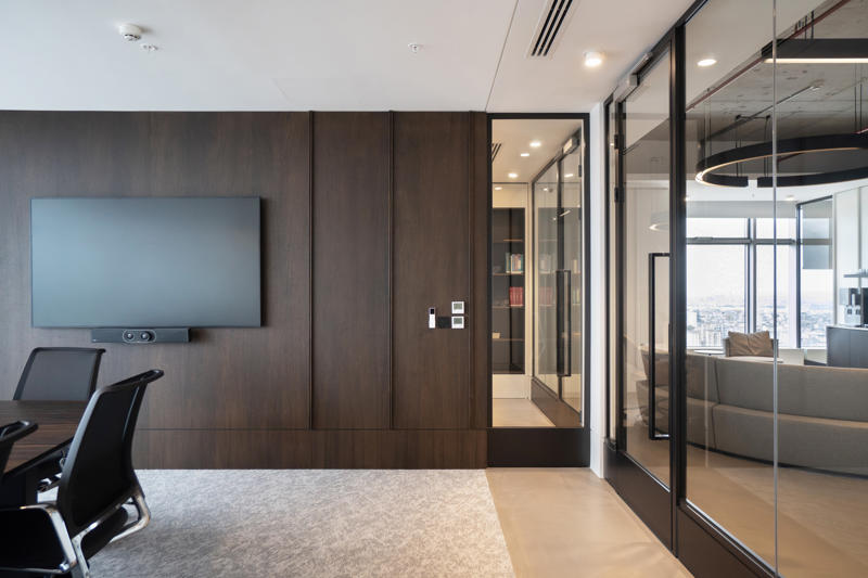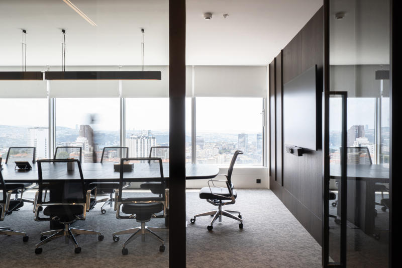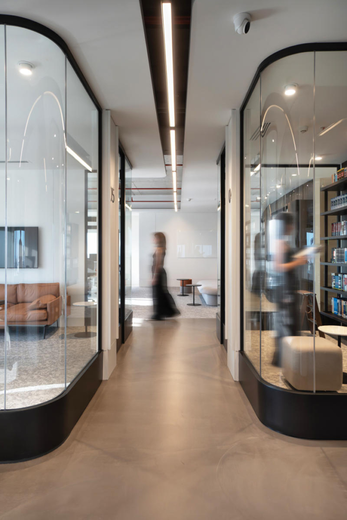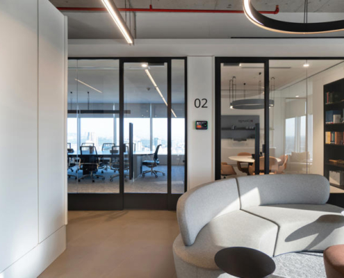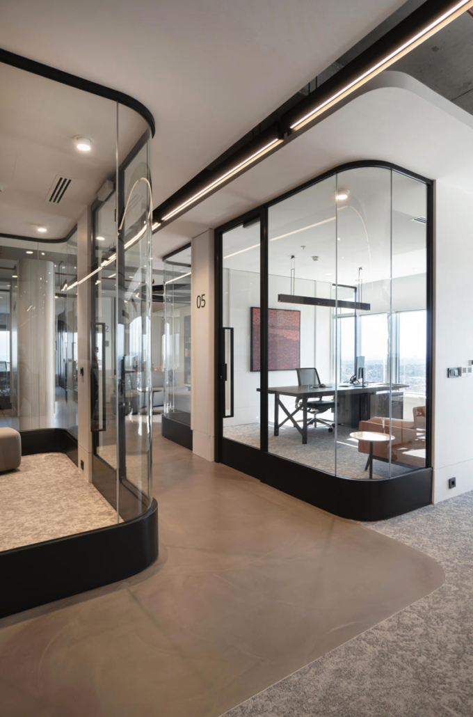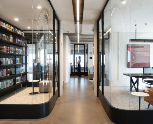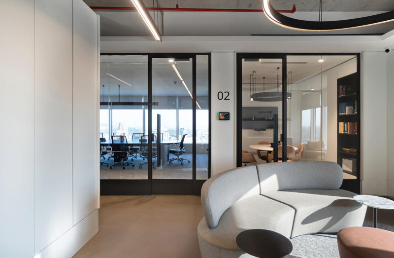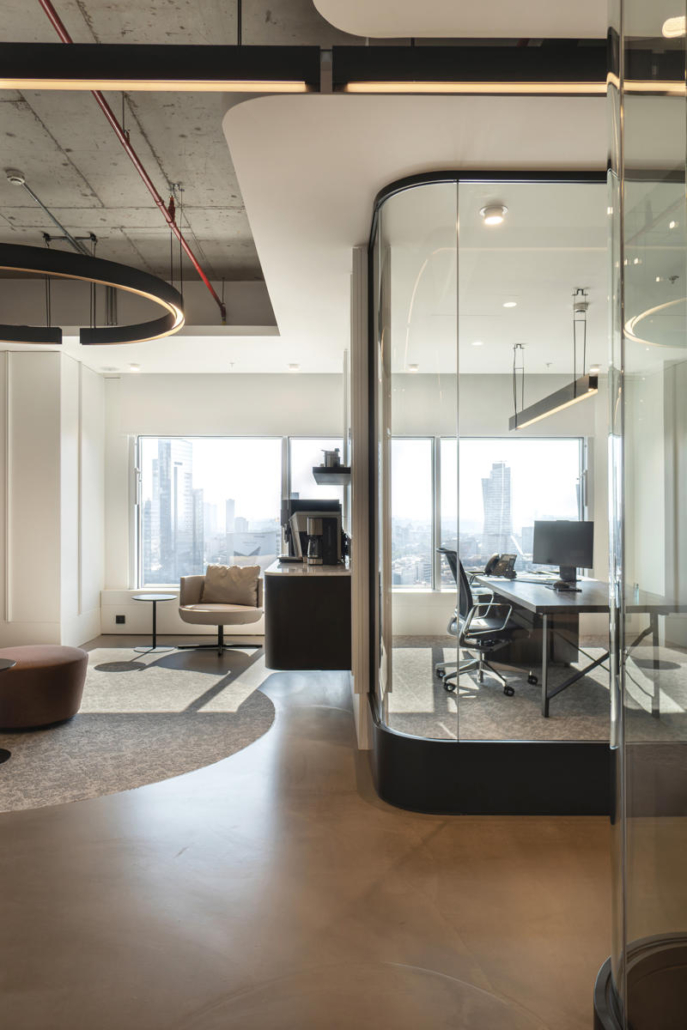 Mekanlar arası ilişkilerin şeffaflığının sağlanması amacıyla kullanılan cam bölücü duvarlar, birimlerin ortak alana bakan cephelerinin yanı sıra komşu birimlerle arasına da yerleştirilerek, şeffaflığın ve ışık geçiriminin artırılması amaçlanmış. Böylece hem aydınlık bir ofis alanı sağlanmış hem de ofisin birçok noktası arasında kesintisiz görsel ilişki imkanı yaratılmış.