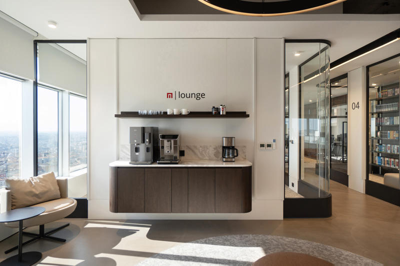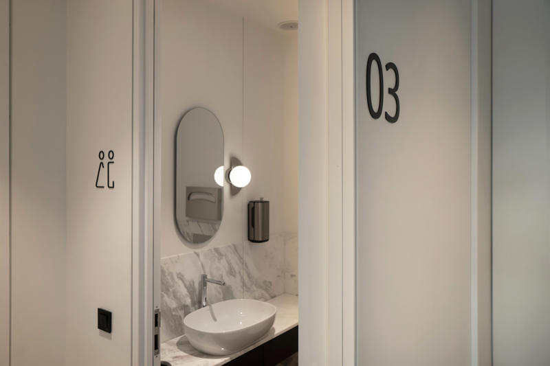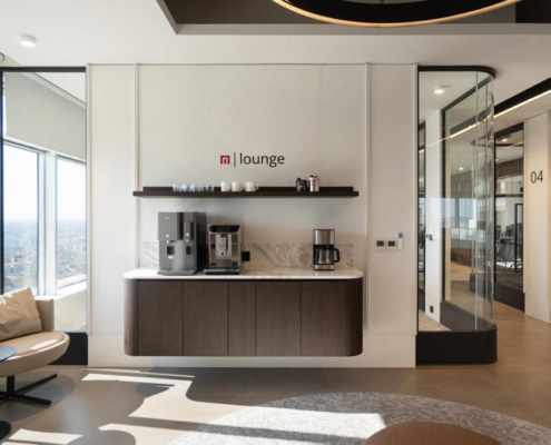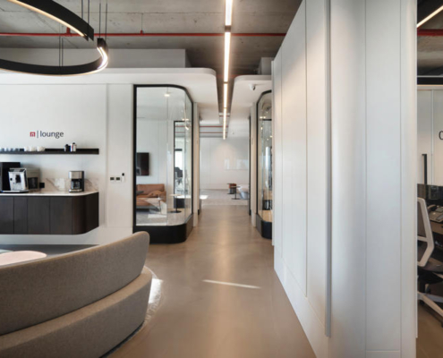 Ofis genelinde seçilen malzemeler, sürdürülebilir ve uyumlu olacak şekilde özenle seçilmiş; tüm ortak alanlarda brüt beton zemin, bölmelerde cam, duvar panellerinde ahşap ve çalışma alanlarında halı kullanılmış.