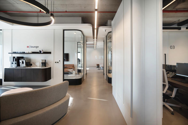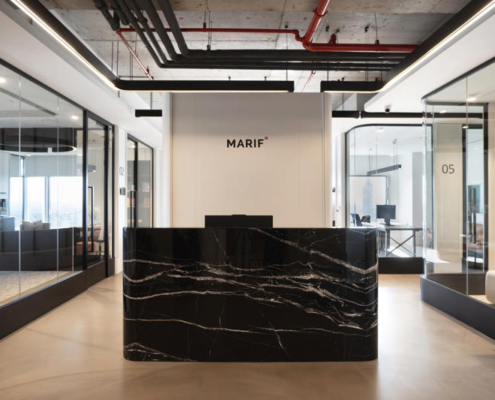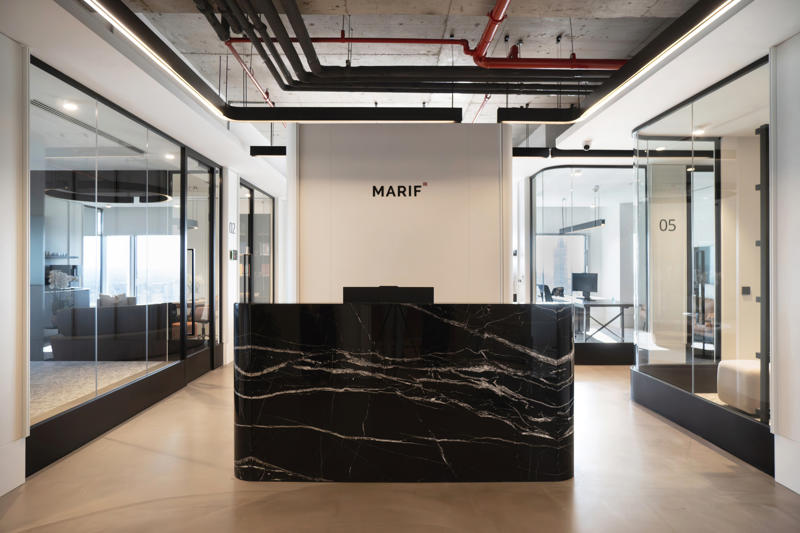 The | work tarafından tasarlanan Marif Hukuk Bürosu Ofisi, mevcut konut planını dönüştürerek şeffaf bölücü duvarları, brüt beton dokusu ve manzarayla kurduğu güçlü mekansal ilişkisiyle çağdaş, açık ve dengeli bir çalışma atmosferi oluşturuyor.