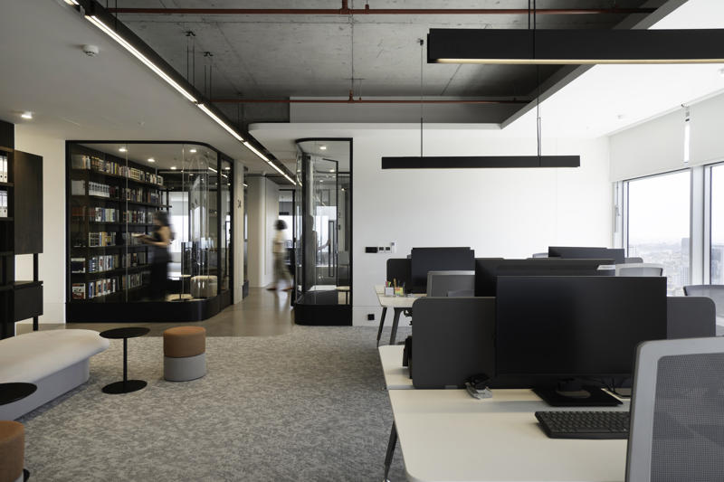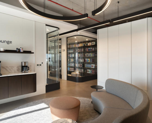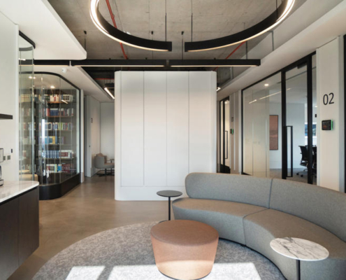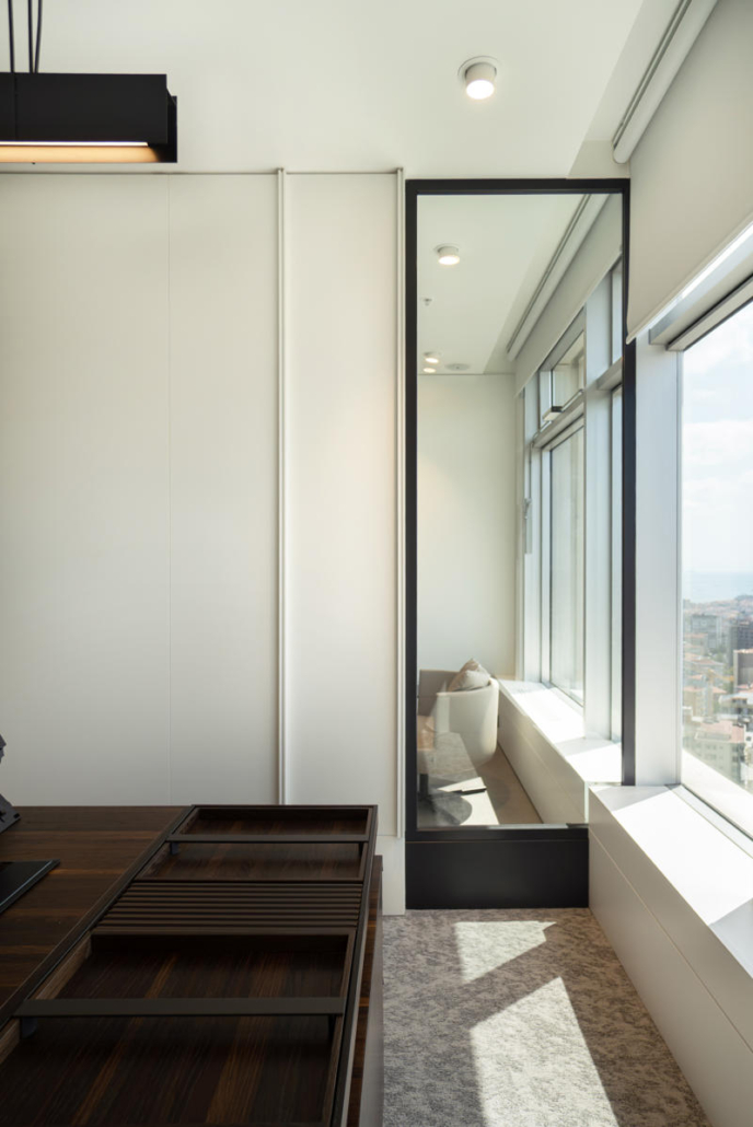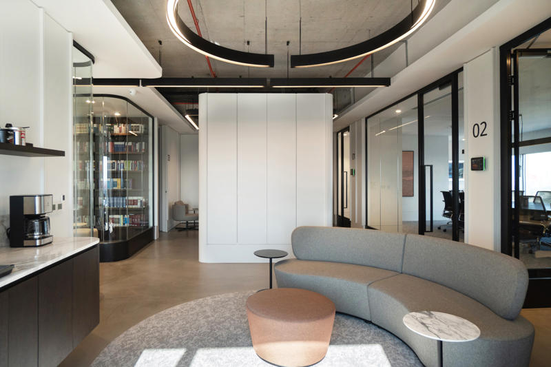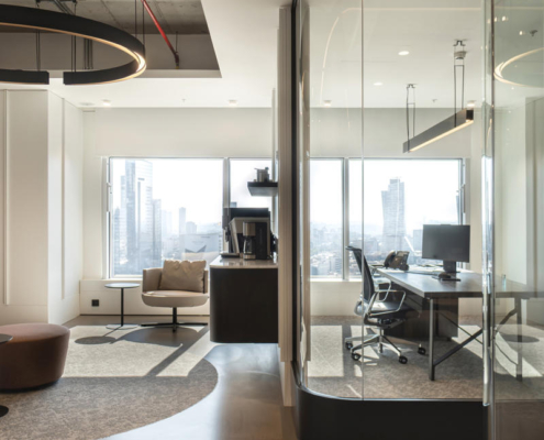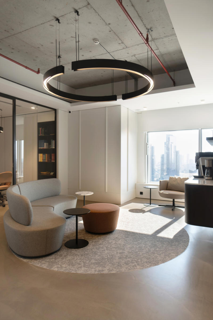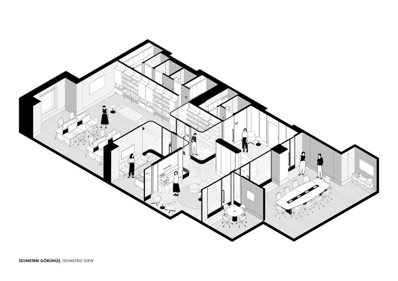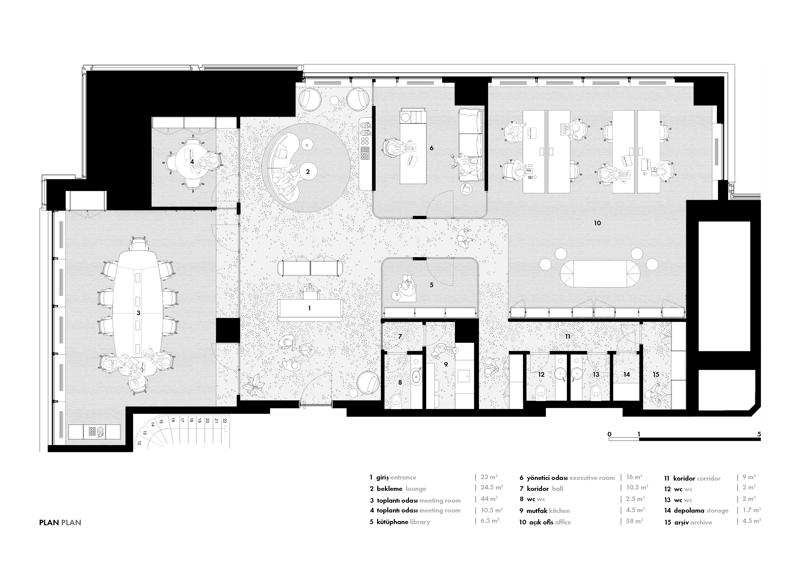 Giriş hacminin maksimize edilmesi amacıyla, karşılama ve lounge alanı bir bütün olarak konumlandırılmış; İstanbul manzarası yönünde toplantı alanları, diğer cephelerde yönetici ve açık çalışma alanları ile çekirdek çevresinde ıslak hacimler, depolama ve açık kütüphane alanları tanımlanmış. Oluşturulan bu yeni plan şemasına uygun olarak mekanların hacim farklılıkları, ortak alanlarda halihazırdaki betonarme döşemelerin tavanda açığa çıkarılması ile sağlanmış. Brüt beton döşemeler, ortak alanlardaki beton zemin ve aydınlatma seçimlerinin; hem sirkülasyon rotalarını tanımlaması hem de tavan ile zemin arasında tutarlı bir uyum yaratarak, ofis tasarımına genel olarak yön vermesi hedeflenmiş.