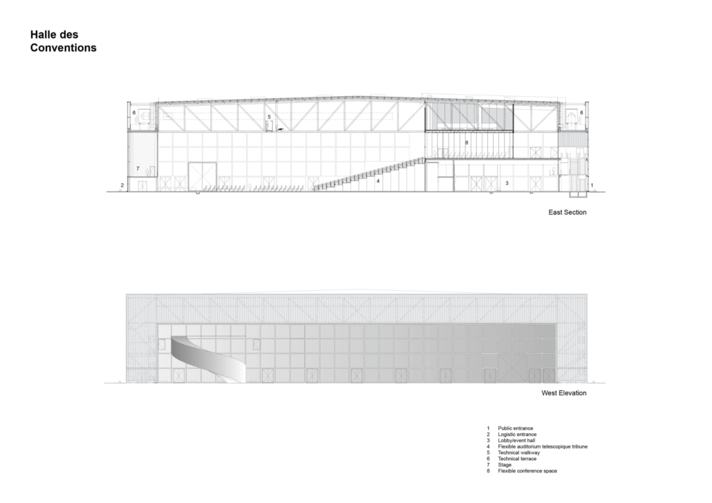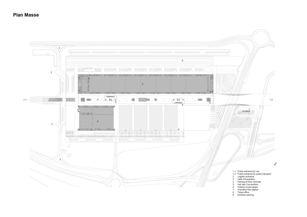 MEETT’nin güney şeridini oluşturan Etkinlik Salonu ve Kongre Merkezi’ne Rue Centrale’den doğrudan erişilebiliyor. Bina, hareketli perdeler ve yatay bölmeler ile kısa sürede birçok mekansal konfigürasyona olanak sağlıyor. Etkinlik salonunun doğu cephesindeki 13 m yüksekliğinde kayar cephe sayesinde zaman zaman iç etkinlikler dışarıya taşıyor.