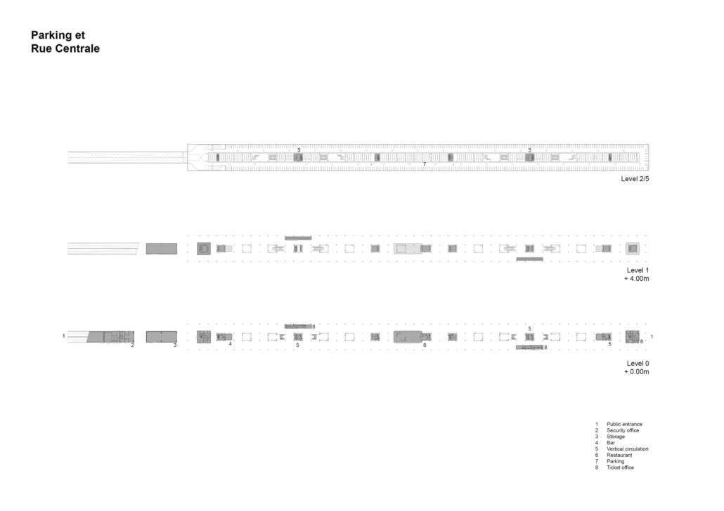 Projenin merkezinde, zemin katta 32.700 m²’lik karşılama alanı yer alıyor. Rue Centrale olarak adlandırılan bu cadde bilgi merkezleri, bilet gişeleri, kafe-restoranlara ev sahipliği yapıyor. Rue Centrale’in üzerinde dört katlı bir otopark bulunuyor. Araçları yerin altına veya çevreyle hiçbir ilişkisi bulunmayan çeperlere ötelemek yerine, bu otoparka, mekanlara erişimi sağlayan, omurga olarak nitelendirilebilecek bir konumda yer verilmiş.