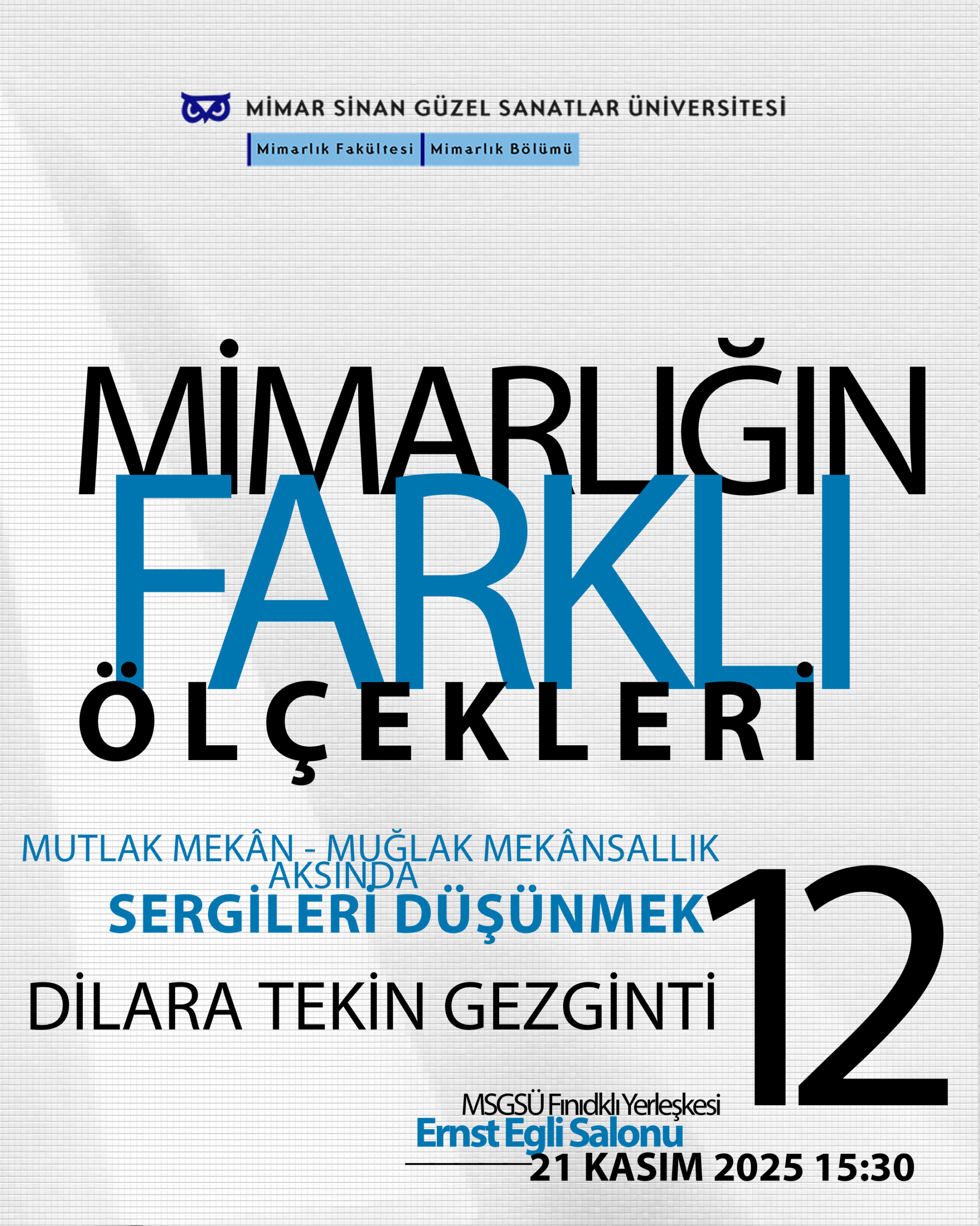 Mimar Sinan Güzel Sanatlar Üniversitesi Mimarlık Bölümü tarafından iki yıldır düzenlenen “Mimarlığın Farklı Ölçekleri” etkinlik dizisinin 2025-2026 Güz yarıyılındaki üçüncüsünde, Dilara Tekin Gezginti “Mutlak Mekan – Muğlak Mekansallık Aksında Sergileri Düşünmek” başlıklı bir konuşma yapacak. Etkinlik 21 Kasım 2025 Cuma günü, saat 15:30’da Mimar Sinan Güzel Sanatlar Üniversitesi Fındıklı Yerleşkesi Ernst Egli Konferans Salonu’nda gerçekleştirilecek ve herkese açık olacak.
