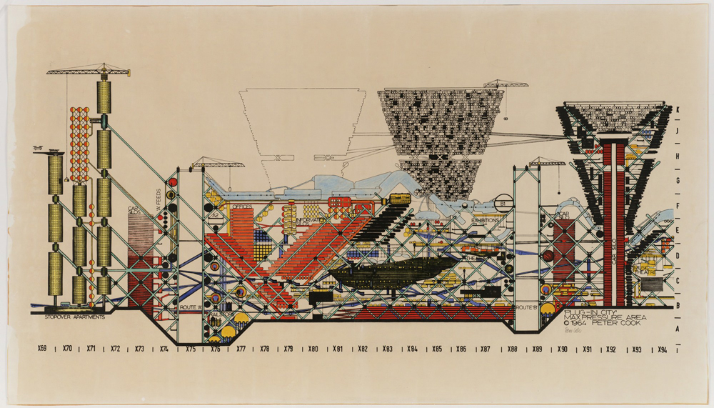 Archigram’ın kurucu üyelerinden biri olan Peter Cook, 1960’ların Britanya alt-kültürünün gelişmesinde önemli bir rol oynadı. Cook, kendisinden önceki modernist dönemin işlevci mimarisinin artık yıprandığını savunuyordu. Ona göre çözüm, Plug-in City adını verdiği vizyoner bir kentsel mega-yapıydı. Bu yapı, içinde barınma birimlerini, ulaşım ağlarını ve sakinler için gerekli temel hizmetleri barındıracaktı. Eskimeyle birlikte ortaya çıkan değişimlere uyum sağlamak üzere tasarlanan bu sistemde, farklı ömürlere sahip yapı düğümleri (evler, ofisler, süpermarketler, üniversiteler) ana “vinç hattına” takılıp çıkarılabilecekti. Sadece kırk yıl dayanması öngörülen bu ana omurga da dahil olmak üzere, tüm yapının esnek ve geçici formu, sakinlerin ihtiyaçlarını ve kolektif iradesini yansıtacaktı (1).