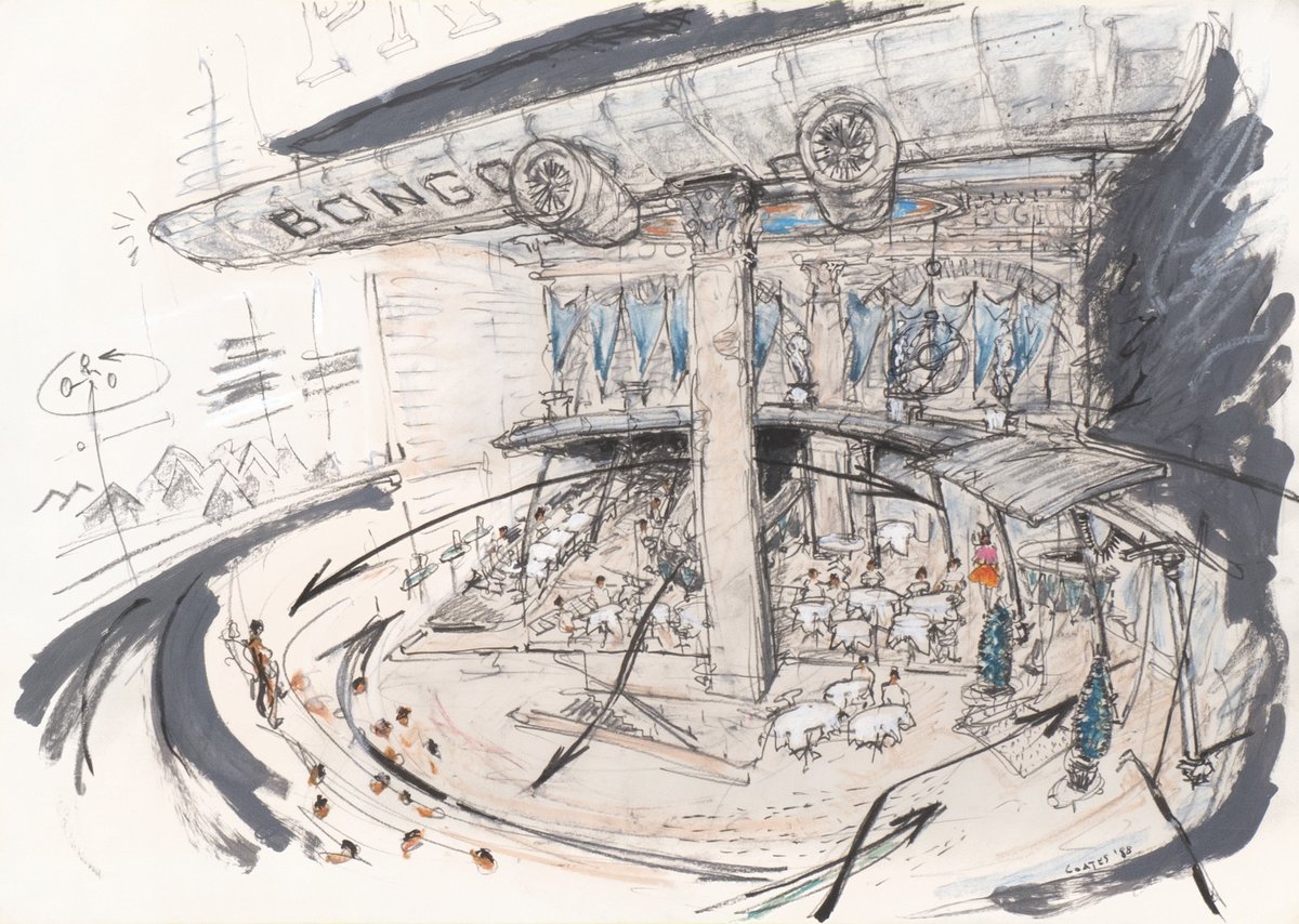 “Narrative Architecture”, Coates’in yayımladığı kitabın adında da kendisini somutlaştıran bir mimari yaklaşım. Kitap, zamandan antik çağlara uzanan yapıların “anlatı” ile nasıl yorumlanabileceğini araştırıyor. Bu yaklaşım, mimarlığı yalnızca biçim ya da teknolojiyle sınırlandırmamak adına insan deneyiminin dokusuna, şehrin ruhuna dokunan bir yaklaşım olarak tanımlıyor (2). 2017’de Londra Tasarım Müzesi’nde düzenlenen “Design Directions” programı kapsamında ‘’Narrative Architecture’’ üzerine konuşurken Caffe Bongo hakkında şu sözleri kullanmış: “İnşa edilmiş mekanın mimari brikolajı, akrilik boyanın serbestçe sıçratılması, kalın yağlı pastel tabakaları ve güçlü kalem vuruşlarıyla yürütülen karışık tekniklere iyi bir şekilde temsil edilmişti. O dönemde bu teknikler, geleneksel mimari çizimin köşeli ve dik açılı geometrisinden ziyade güzel sanatlar pratiğine daha yakındı. Projenin kendisi, dev sütun ya da uçak kanadı gibi klasik referansları, arka duvarlara inşa edilmiş birikmiş atıklarla özgürce harmanlıyordu. Mekan Piranesivari idi, ama anlatısı ve detayları daha çok Mad Max’i andırıyordu”(3).