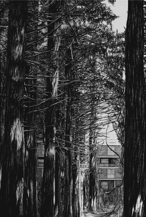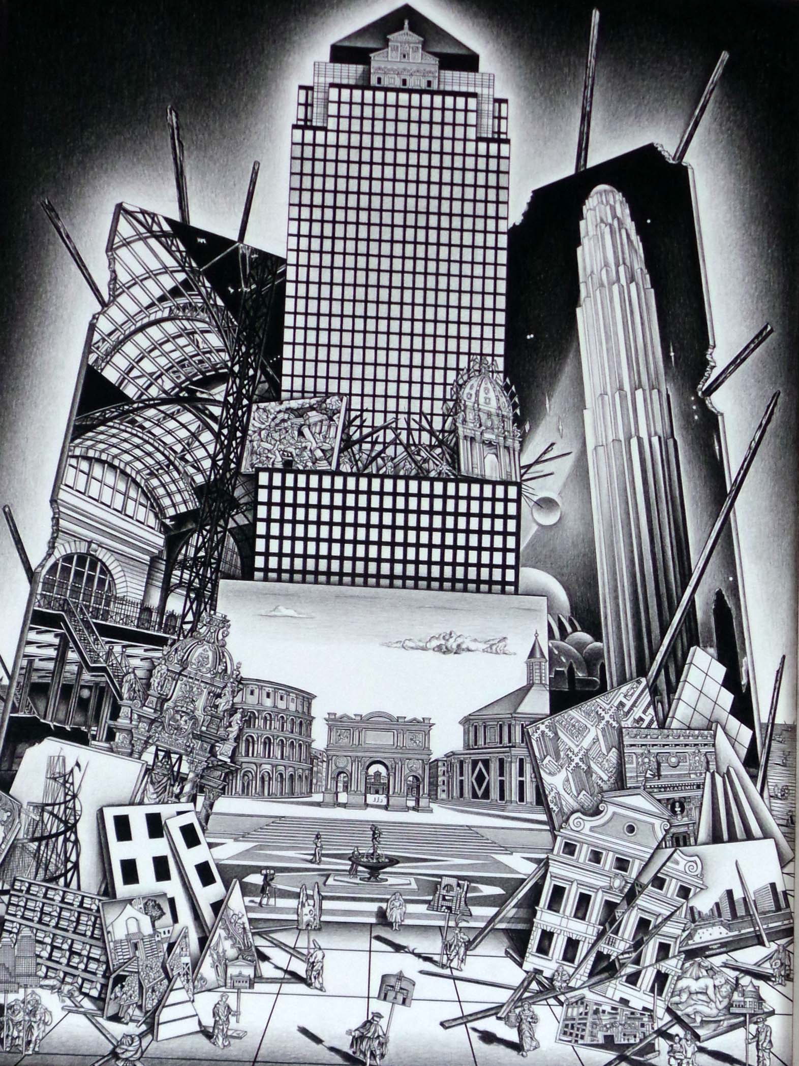 “In Limbo” adlı eser, Amerikalı sanatçı Nancy Wolf’un ürettiği, conte carbon tekniğiyle bezeli bir tablo. Çalışma, 1989 yılına tarihlenmiş, yaklaşık yetmiş altıya, elli altı santimetrelik bir çizimi barındırıyor (1). Wolf’un üslubu, resim ile mimari çizim arasında bir sınırda yer alıyor. Çizgileri bir mimarın perspektif eskizini çağrıştıracak kadar titiz ve ayrıntılı olsa da yalnızca oran ve ölçü arayışıyla sınırlı kalmayıp dramatik yoğunluk, gölge oyunları ve dokusal zenginlik aracılığıyla bir “şehir düşü” yaratmış.
