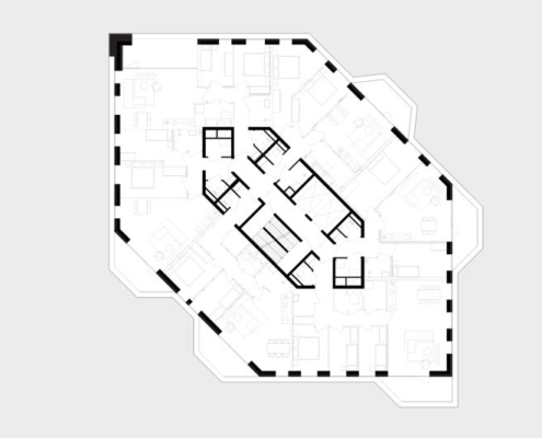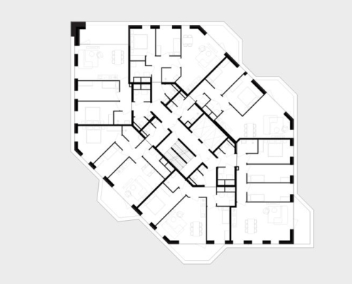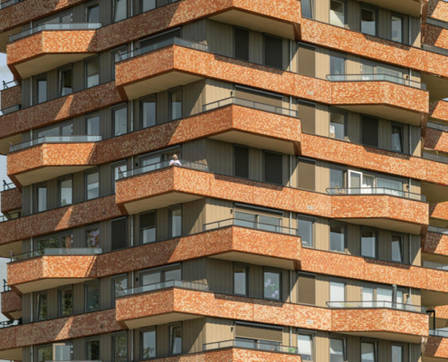 Bu dinamik balkon düzeni, kat planlarının çeşitlendirilmesiyle mümkün kılınmış. Elmas biçimli taşıyıcı çekirdek, yük taşıyan cephe ile yansıtmalı olarak tasarlanmış; çekirdek ile cephe arasındaki alan ise tamamen esnek kurgulanmış ve ilerideki ihtiyaçlara göre yeniden düzenlenebilir biçimde düşünülmüş. Esneklik, tasarımın temel ilkelerinden biri olurken, tüm dairelerde yaşam alanlarına doğrudan açılan balkonlar gibi nitelikli planlamadan da ödün verilmemiş. 93 daireden oluşan kulede, alt katlarda uygun fiyatlı konutlar yer alırken, üst katlarda açık planlı çatı katı daireleri bulunuyor. NELSON’un cephesi, nehir kıyısından çıkarılan yerel kil ile üretilmiş tuğlalarla kaplı. Böylece yapı, bulunduğu peyzaja fiziksel olarak da kökleniyor ve yerel kimliğini pekiştiriyor. Cephede kullanılan renk paleti, ovacık boyunca yer alan diğer yapılarla uyum içinde; fakat sıcak ve parıltılı tonlarla yaratılan vurgu alanları sayesinde NELSON kendi karakterini özgün biçimde ortaya koyuyor. Yapı aynı zamanda set yüksekliğine de duyarlı: temel kotunda, yükseltilmiş set ve ona bitişik düşük zemin arasında bağlantı kurarak topografyaya adapte oluyor. NELSON, aynı zamanda uyarlanabilir yaşam biçimleri için esnek planlama, farklı gelir gruplarına hitap eden kapsayıcı konut programı ve nitelikli malzeme kullanımı ile öne çıkıyor.