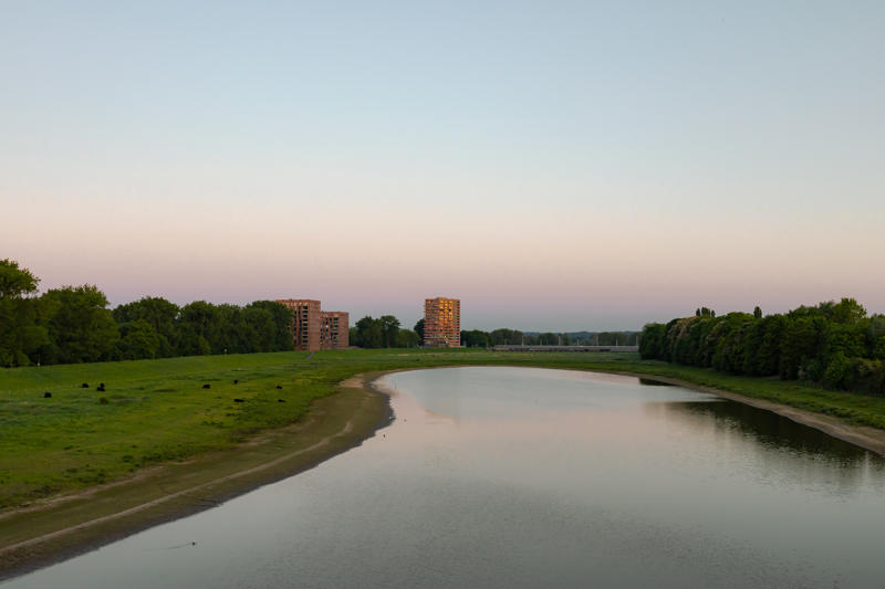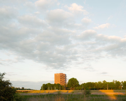 Powerhouse Company tarafından Arnhem şehir merkezinde tasarlanan NELSON, sel ovacığı boyunca bir “inci kolyesi” gibi dizilen yapıların son halkası olarak peyzajı tamamlıyor. Dikkat çekici formu ve belirgin görüş akslarıyla NELSON, çevresine yön veren bir odak noktası ve kentsel silüette tanımlayıcı bir simge işlevi görüyor. Altıgen plan şemasına sahip NELSON, keskin eğimli cephe düzlemleri sayesinde her balkonun nehir, kent veya çevredeki peyzaja yönelmesini mümkün kılıyor. Dikey olarak uzanan keskin köşesi, kentsel ulaşım için önemli bir bağlantı olan Mandela Köprüsü’ne yöneliyor. Cephede dalgalanma etkisi yaratan balkonlar, yapının her açıdan farklı görünmesini sağlıyor.