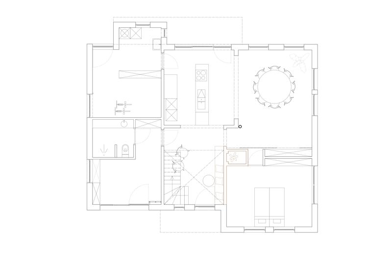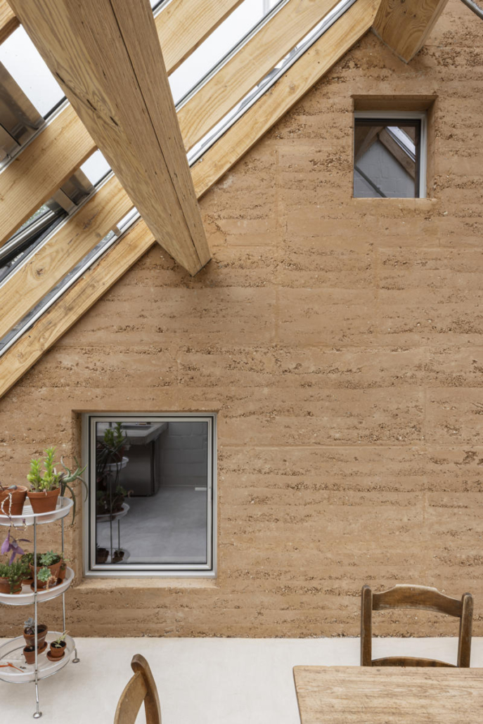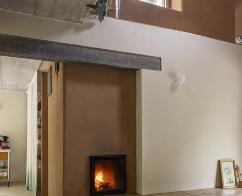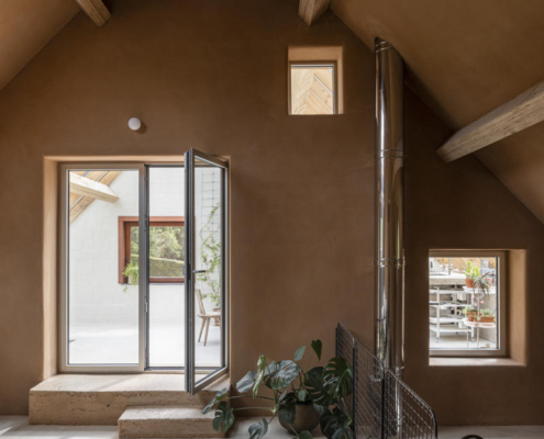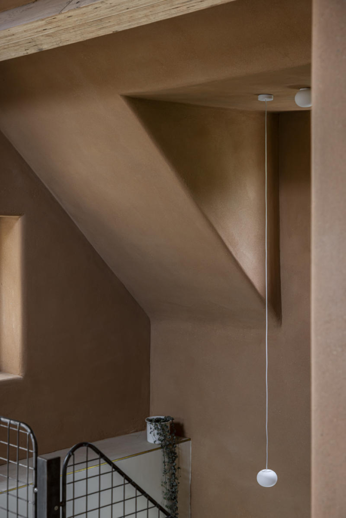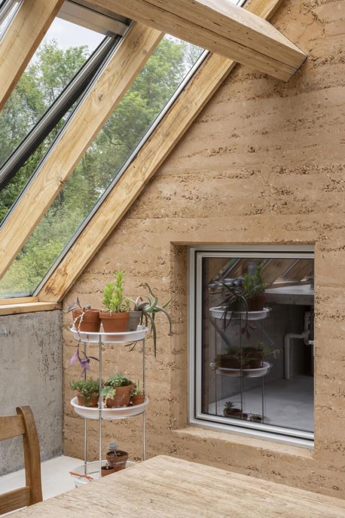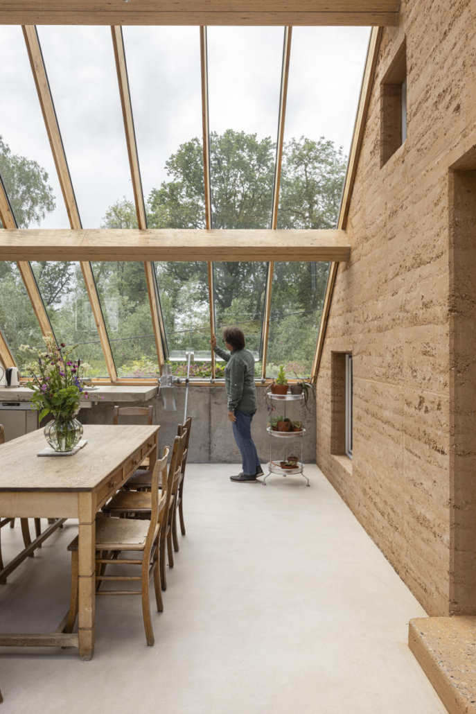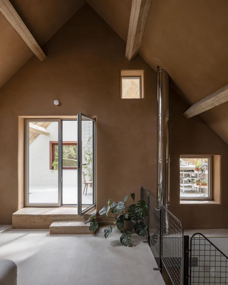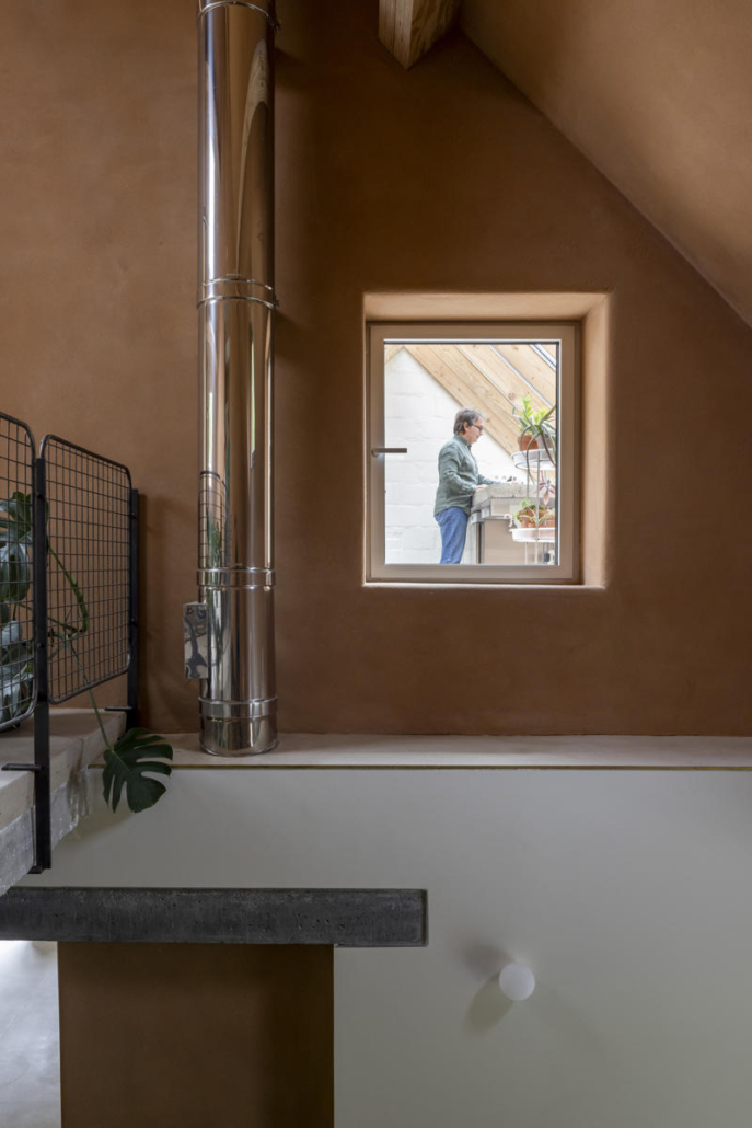 Eski koridor ve çalışma odası, artık kış bahçesine açılan yeni bir oturma odasına dönüşmüş. Geniş ve önceki işlevsiz giriş holü ise, merkezi konumda yer alan ve eski yakıt kazanının yerini alan toprak sobanın yanında samimi bir oturma alanına çevrilmiş. Eski garaj artık evin ana girişini oluşturuyor; iç duvarlar ise beyaz yerine kırmızı kil sıva ile kaplanmış. Zemin katta yer alan ferah bir yatak odası ve kompakt bir banyo sayesinde, ev ömür boyu yaşanabilir hale getirilmiş.