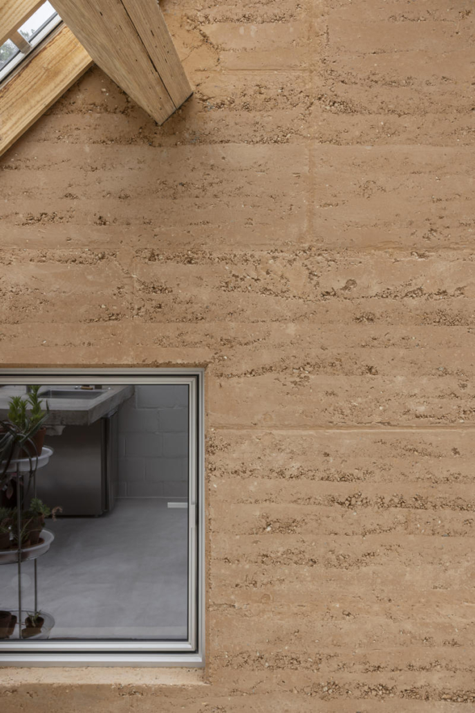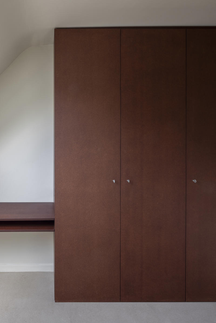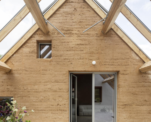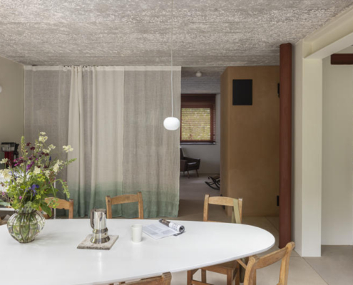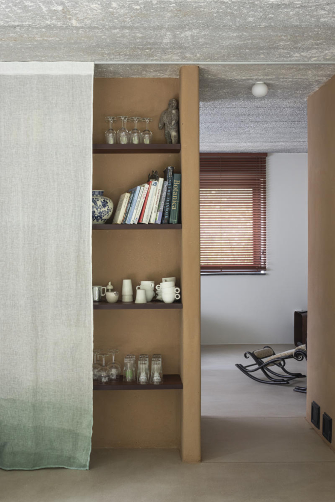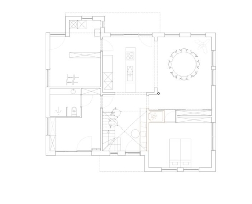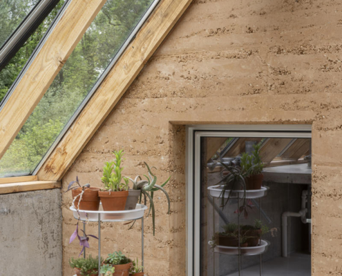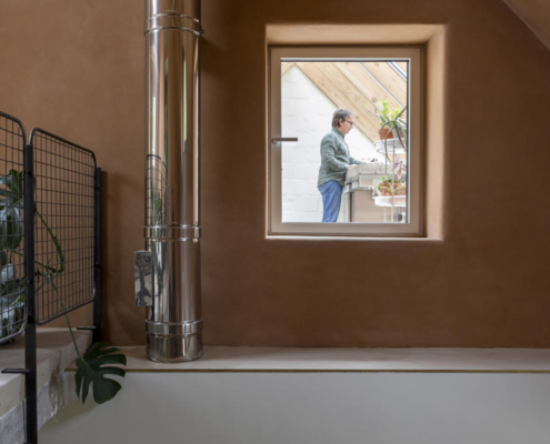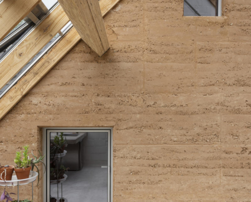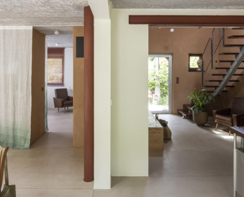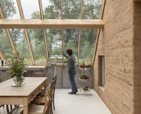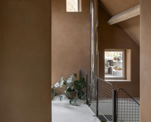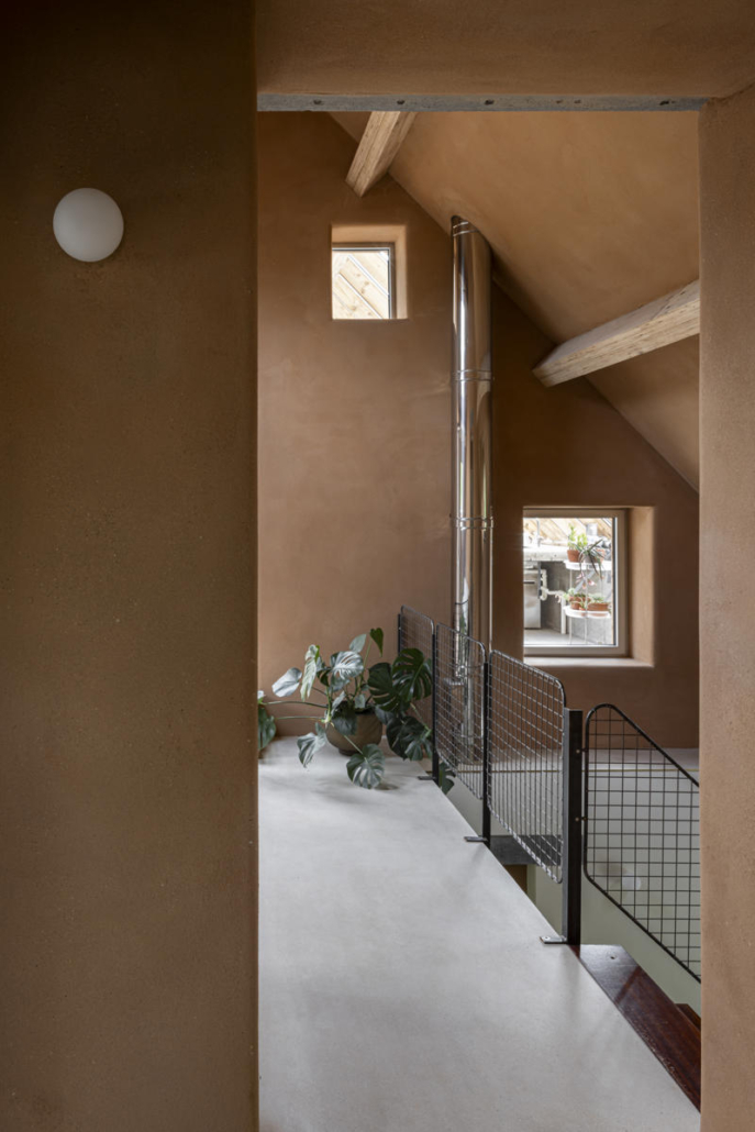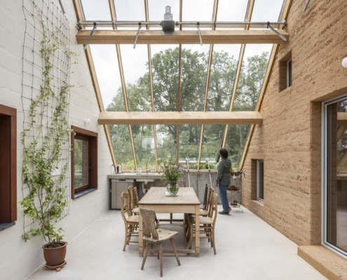 Eski koridor ve çalışma odası, artık kış bahçesine açılan yeni bir oturma odasına dönüşmüş. Geniş ve önceki işlevsiz giriş holü ise, merkezi konumda yer alan ve eski yakıt kazanının yerini alan toprak sobanın yanında samimi bir oturma alanına çevrilmiş. Eski garaj artık evin ana girişini oluşturuyor; iç duvarlar ise beyaz yerine kırmızı kil sıva ile kaplanmış. Zemin katta yer alan ferah bir yatak odası ve kompakt bir banyo sayesinde, ev ömür boyu yaşanabilir hale getirilmiş.