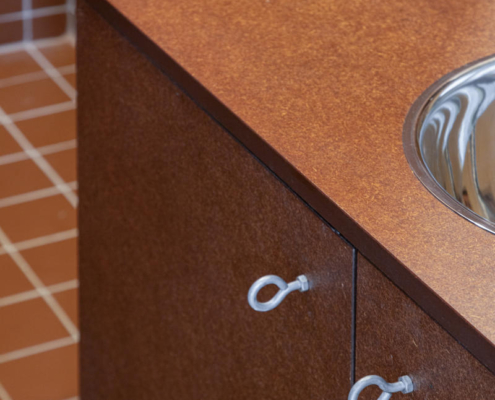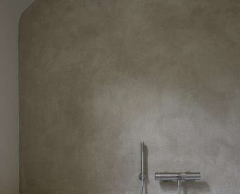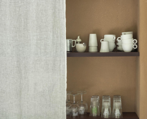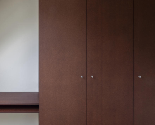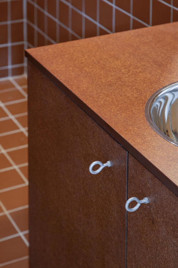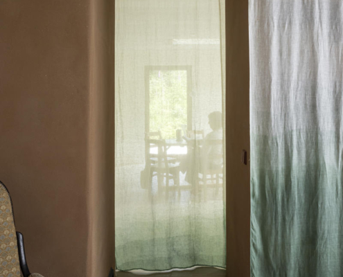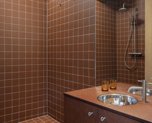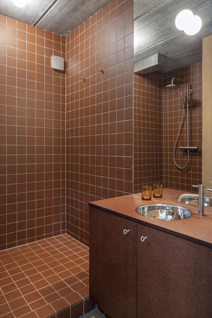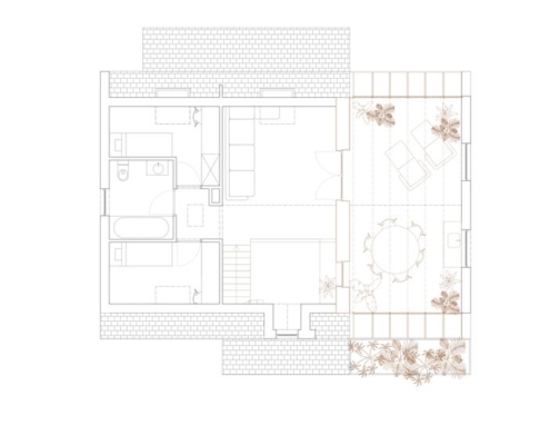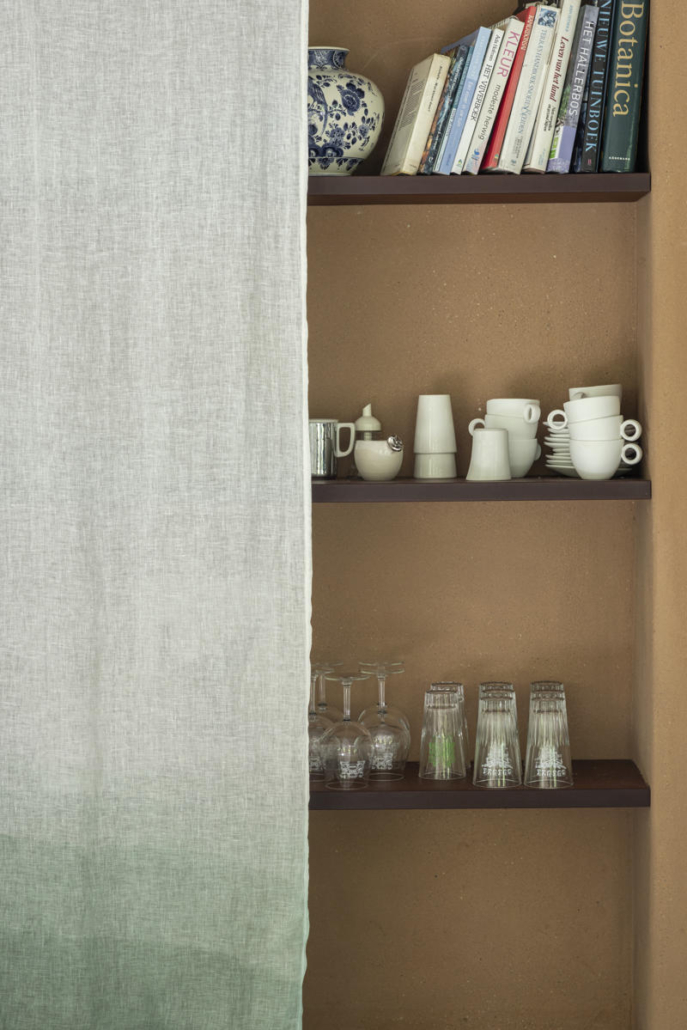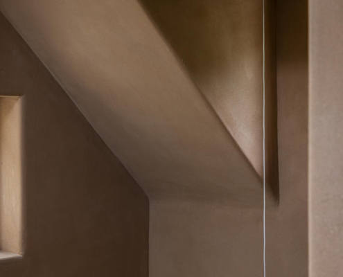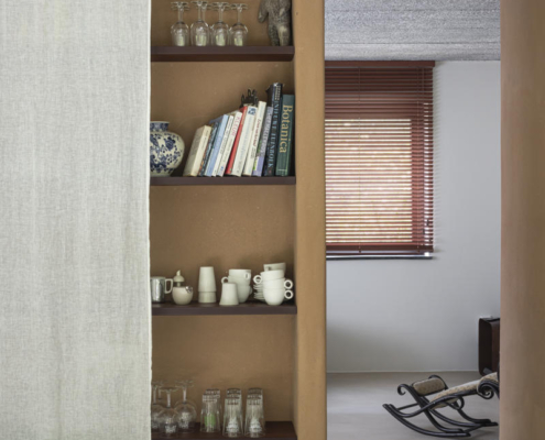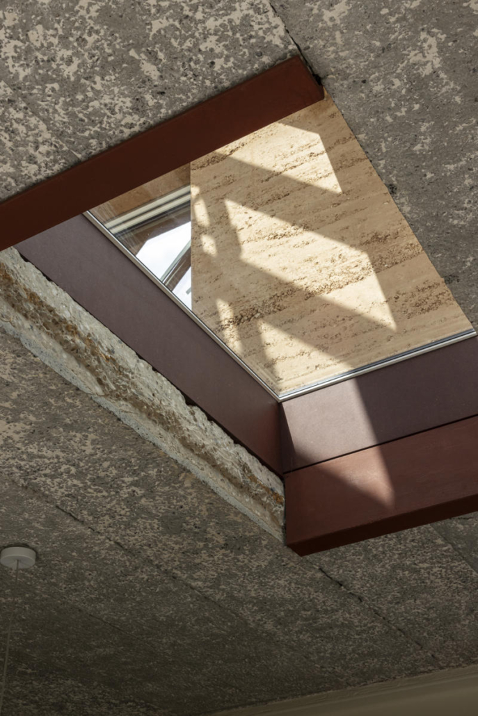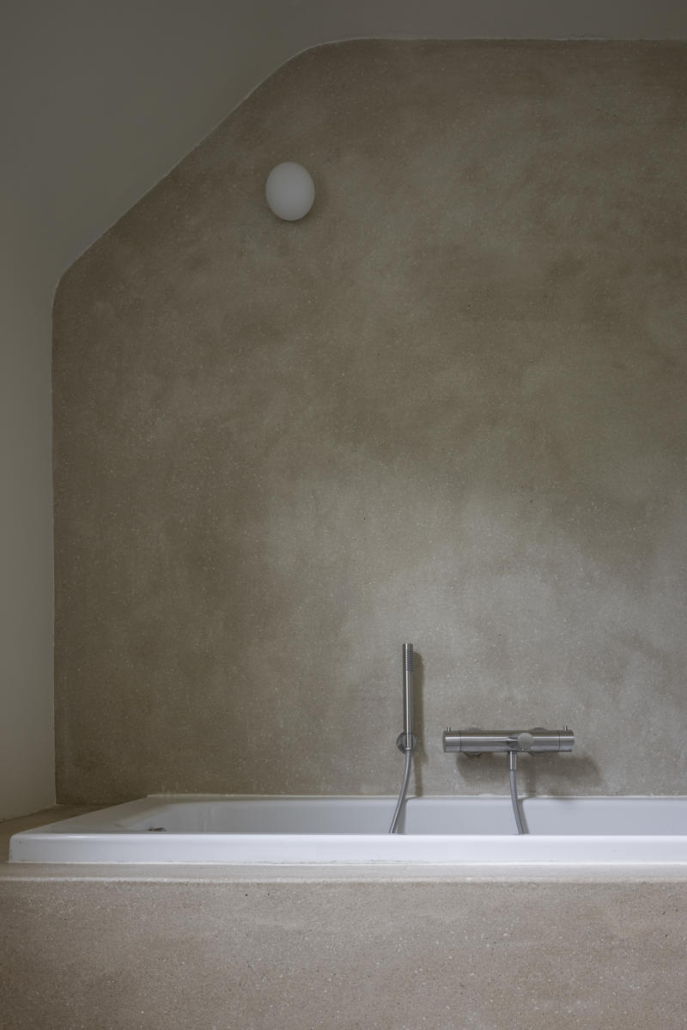Eski koridor ve çalışma odası, artık kış bahçesine açılan yeni bir oturma odasına dönüşmüş. Geniş ve önceki işlevsiz giriş holü ise, merkezi konumda yer alan ve eski yakıt kazanının yerini alan toprak sobanın yanında samimi bir oturma alanına çevrilmiş. Eski garaj artık evin ana girişini oluşturuyor; iç duvarlar ise beyaz yerine kırmızı kil sıva ile kaplanmış. Zemin katta yer alan ferah bir yatak odası ve kompakt bir banyo sayesinde, ev ömür boyu yaşanabilir hale getirilmiş.