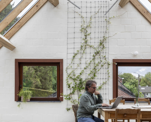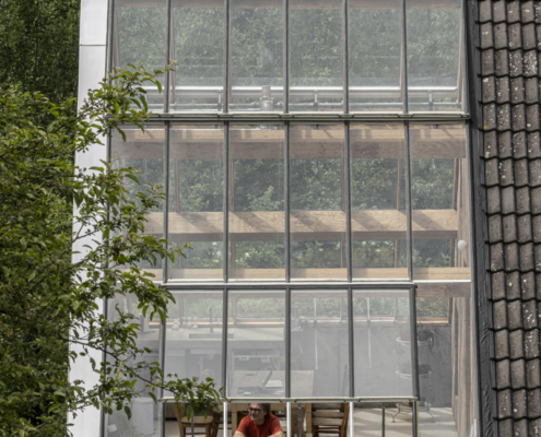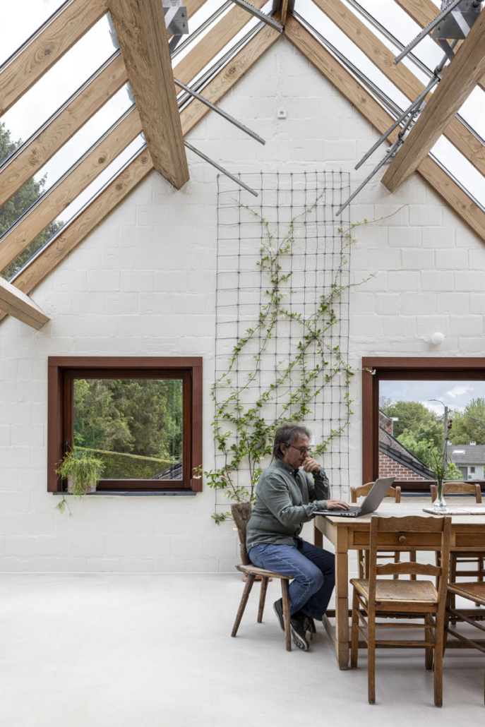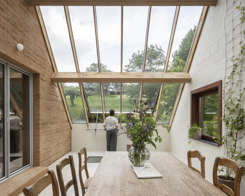 Omloop Farmhouse projesinin dönüşüm hikayesi, Marc ve Ann çiftinin 1990’larda satın aldıkları çiftlik evini çağdaş sürdürülebilirlik standartlarına uygun olarak yenileme kararı ile başlamış. He! Arkitektuur tarafından gerçekleştirilen yenileme projesinde, hem evin hem de bulunduğu yerin evin sakinleri için taşıdığı duygusal anlam tasarıma yön veren unsurlar arasında yer alıyor. Amaçları, evin çevresi ile kaybolan doğa bağlantısını yeniden kurmak olarak ifade ediliyor. Açık planlı, merkeze sıkıştırılmış toprak sobanın yer aldığı bir ev hayal eden aile üyeleri, dostları ile birlikte yenileme sürecine aktif olarak katkıda bulunmuş. İlk bakışta, standart bir Flaman “fermette”yi yenilemek Hé! için sıradan bir iş gibi görünüyormuş. Bu tür evler bölgede yaygın olmakla birlikte, çağdaş enerji standartlarını karşılamıyor ve genellikle mimari olarak değerli görülmüyor. Ancak Hé!, kısa sürede bu tip konutların gelecekte neye evrilebileceği sorusuyla ilgilenmeye başlamış.