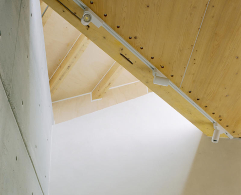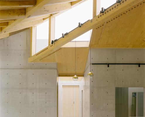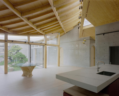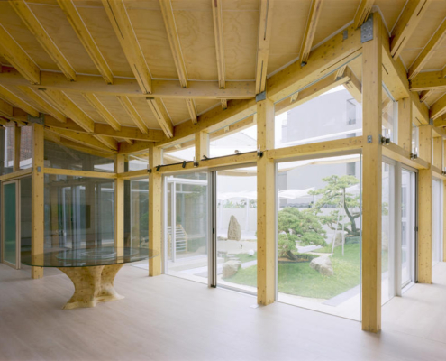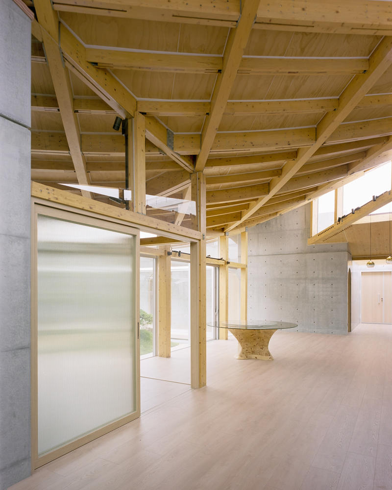 Bu proje, CLT ve GLT (Yapısal Lamine Ahşap) gibi yeni malzemeleri ve yeni inşaat yöntemlerini kullanarak, saçak boyutunun uzatılmasına ve çatının eğriliğinin artırılmasına olanak sağlamış. Böylece on altı metre genişliğinde ve on sekiz metre uzunluğunda büyük bir çatı oluşturulmuş, geleneksel ahşap yapı formlarının ötesine geçilerek bir yaşam alanı yaratılmış.