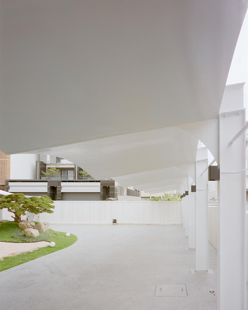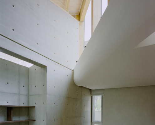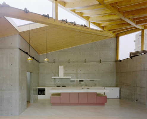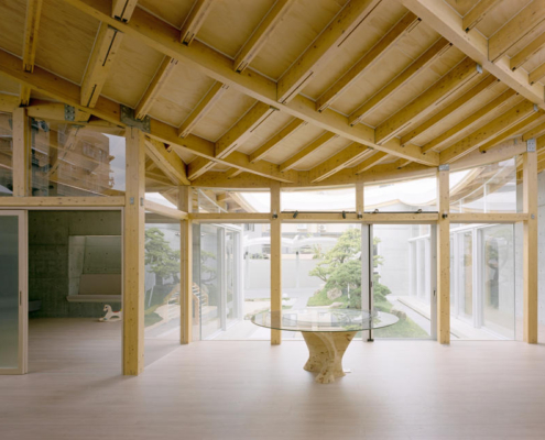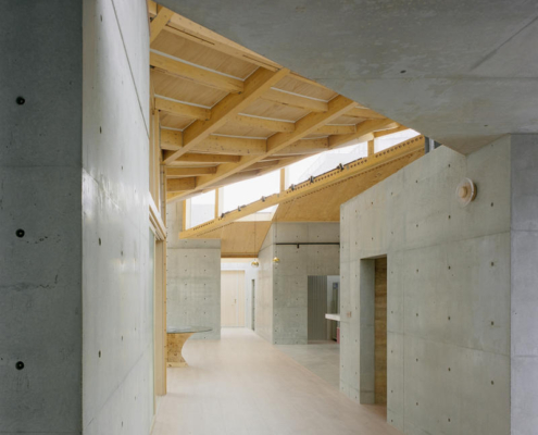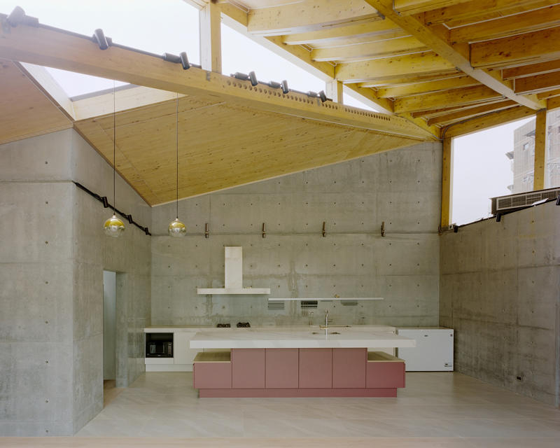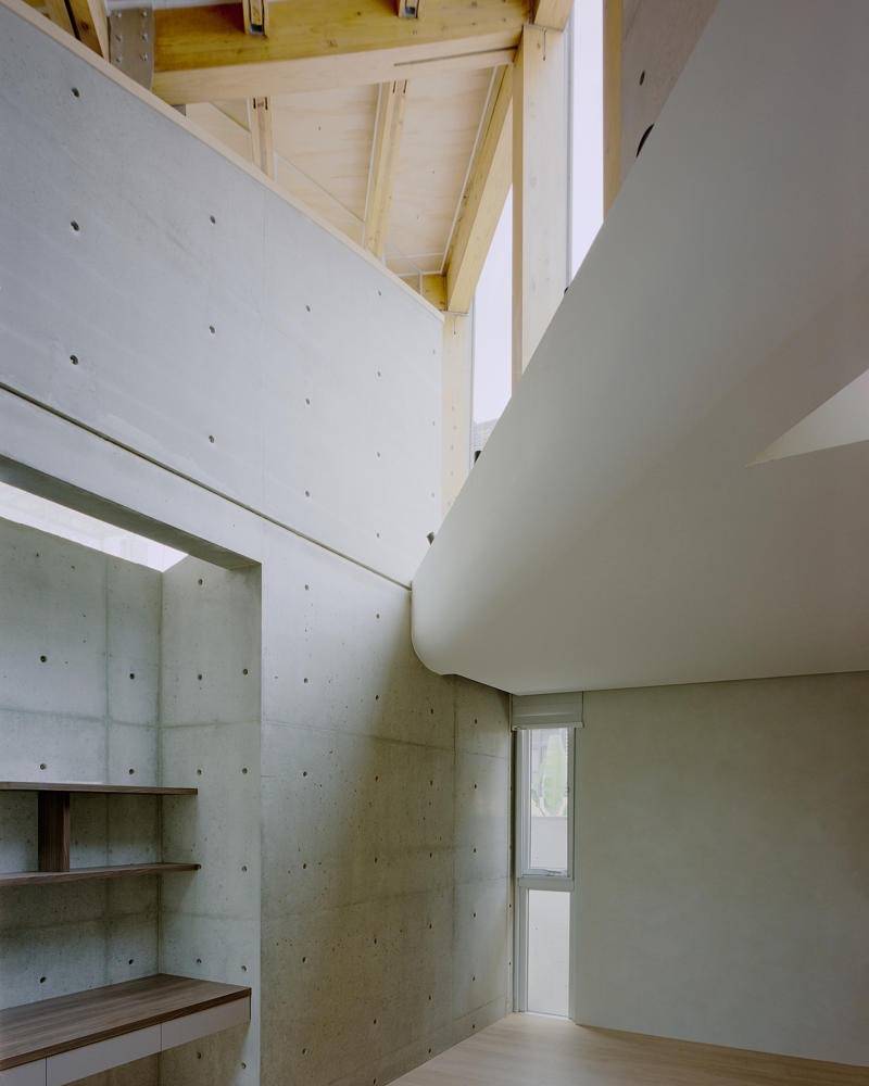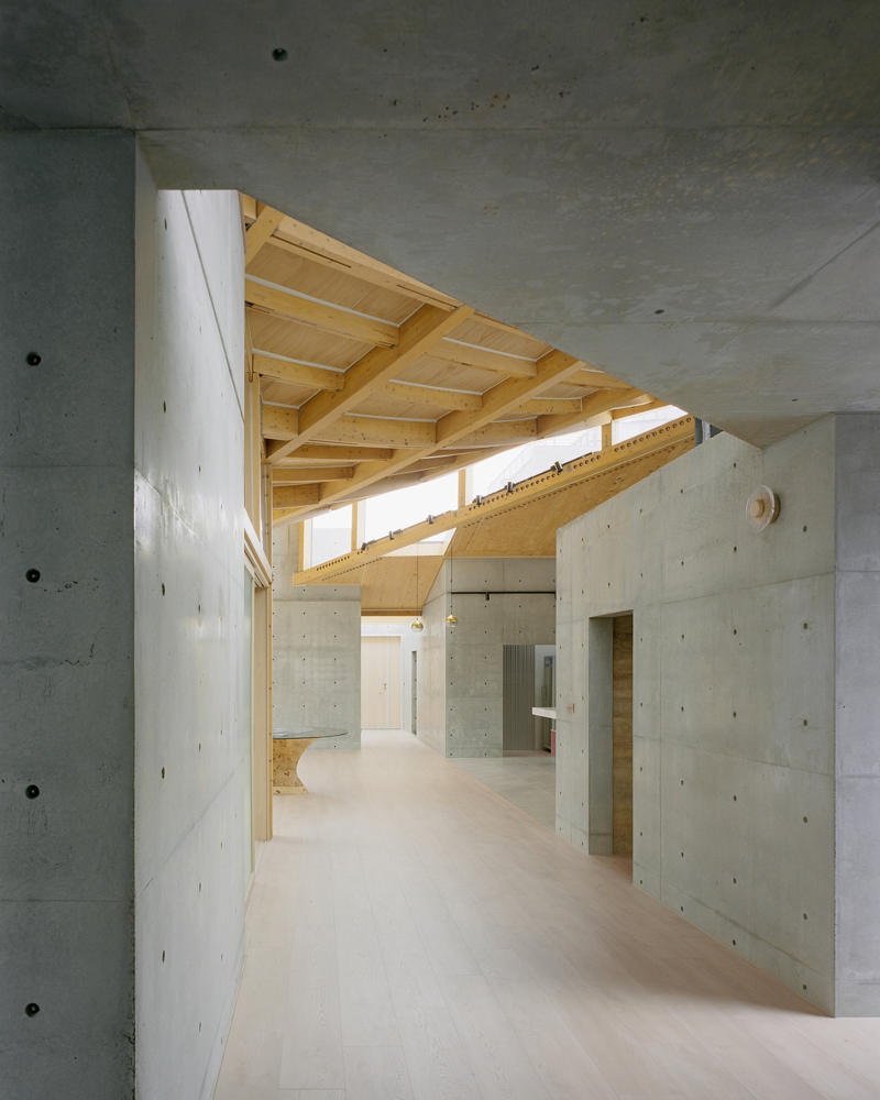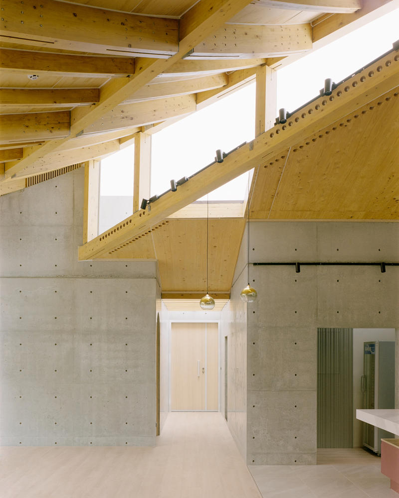Zemin kattaki tek katlı yapı, çevredeki diğer evlere göre biraz daha alçak görünmekte. Bu nedenle çatı yüksekliği 5.8 metreye çıkarılmış, farklı yüksekliklerde farklı çatı formları tasarlanarak saçaklarda yükseklik ve katman hissi artırılmış. Böylece yapı, olduğundan daha yüksek görünmekte. Çatının yükseltilmesi, ahşap taşıyıcı sistemin görünmesini sağlamış.