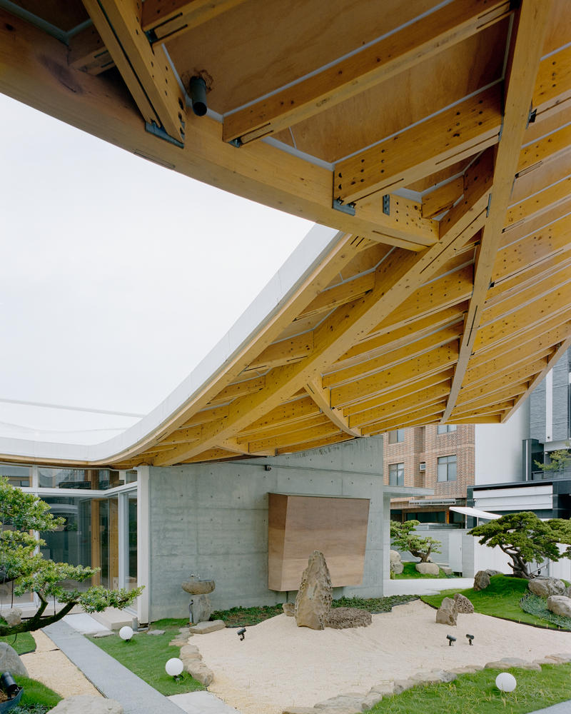 Kavisli çatı ve eğimli çatının birlikte oluşturduğu karmaşık mekan algısı nedeniyle tasarım ve üretim süreci boyunca BIM ve Rhino yazılımları kullanılmış. Demir bağlantı parçalarının şekli, gizli sürtünmeli civatalar şeklinde tasarlanmış; bu da inşaatın zorluğunu oldukça artırmış. Her bir kolon sabit noktalı ışık dalgalarıyla taranmış. Japonya ve Tayvan arasındaki bu uyumlu iş birliği, geleneksel ahşap yapılarla ilgili genel geçer kalıpları yıkıyor.