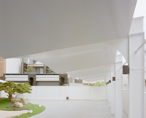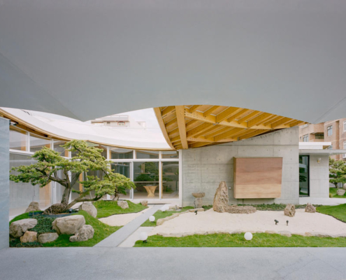 Kırk beş derece döndürülmüş büyük hiperbolik çatı (GLT), binanın fark edilirliğini artırırken birden fazla gölgeli mekan oluşturmuş. Her bir mekanda, büyük çatının dik açılı düzlemle oluşturduğu eğik boşluklar görülüyor ve bu da her mekanda farklı ışık ve gölge deneyimleri sunuyor. Selvi ağacından yapılan bu büyük çatı çeşitli mekanları birbirine bağlıyor.