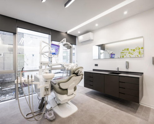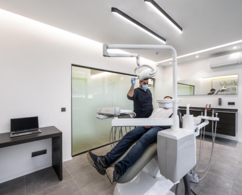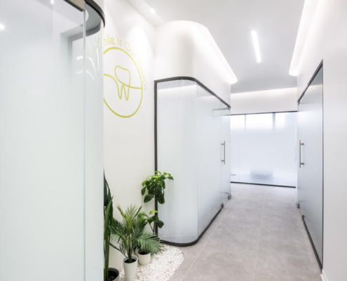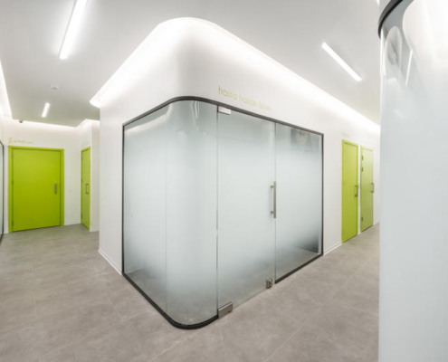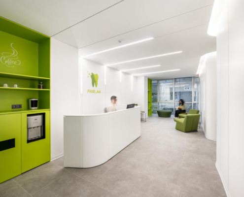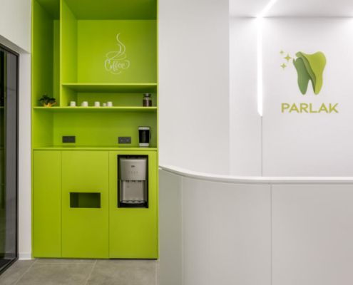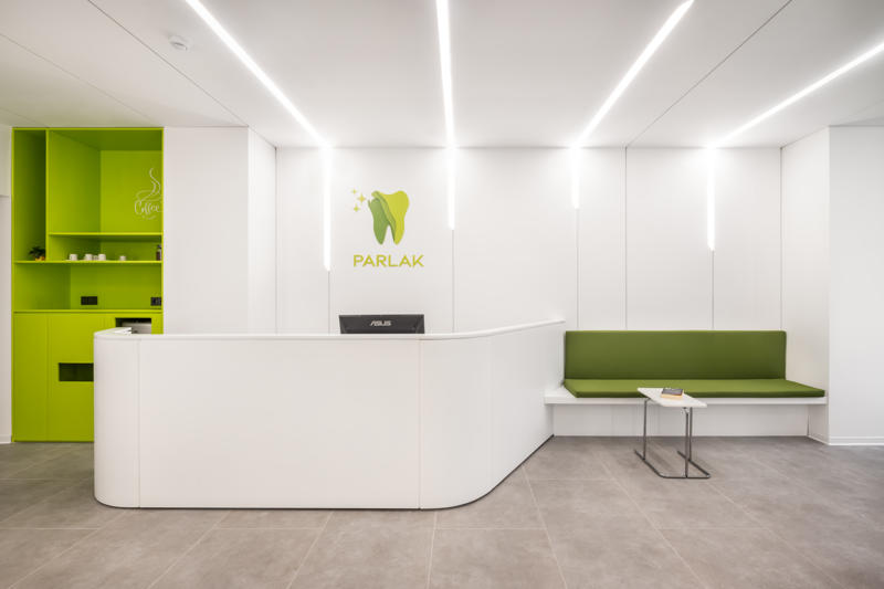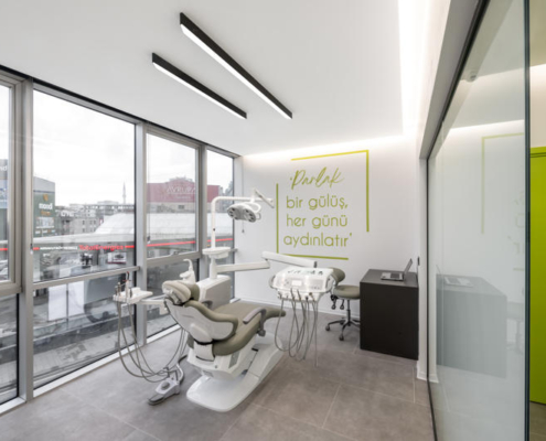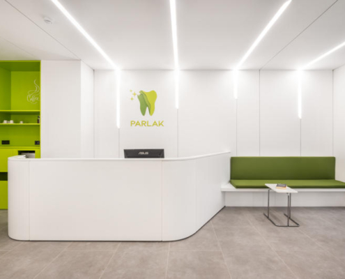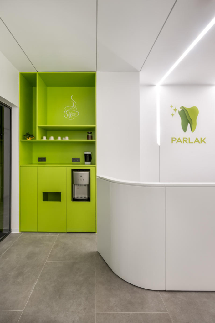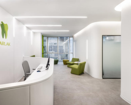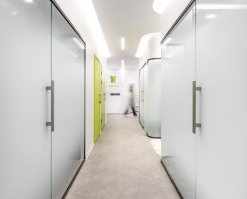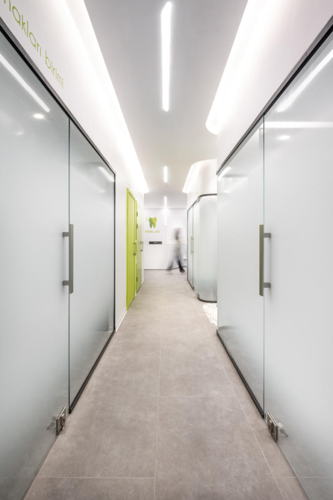 İstanbul Arnavutköy’de yer alan Parlak Diş Polikliniği, yüz altmış beş metrekarelik bir alanda estetik ve işlevselliği bir araya getirecek şekilde tasarlanmış. Yuvarlatılmış duvarlar ve onları takip eden aydınlatmalar, girişten muayene odalarına kadar kesintisiz bir dolaşım ve güçlü perspektifler sağlıyor. Bu kıvrımlı yüzeyler, hem mekanın sınırlarını bulanıklaştırıp hem de ziyaretçiyi doğal bir şekilde sirkülasyon akslarına yönlendiriyor.