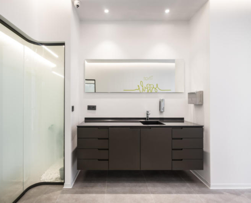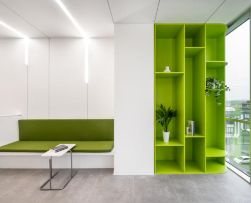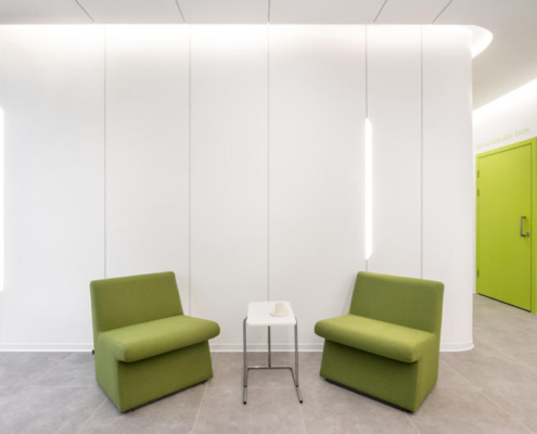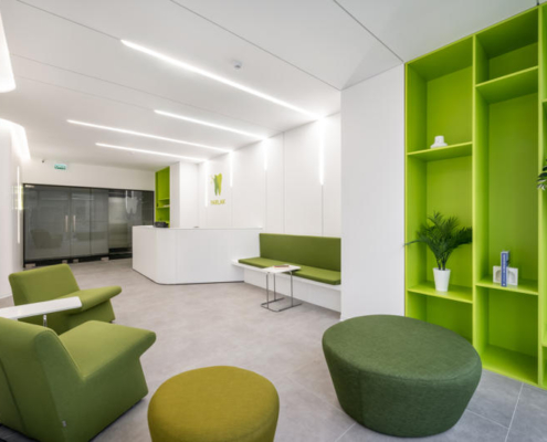 Mobilyalar, yerden ve yan duvarlardan hafifçe ayrılmış olarak tasarlanmış. Klinik alanlarını ferah ve düzenli kılarken estetik bir zarafet de sunuyor. Banko ve bekleme alanındaki oturma birimleri, kıvrımlı form diliyle bütünleşerek mekanın karakterini pekiştiriyor ve minimum metrekarede maksimum konfor sağlıyor.