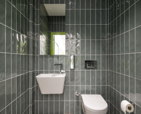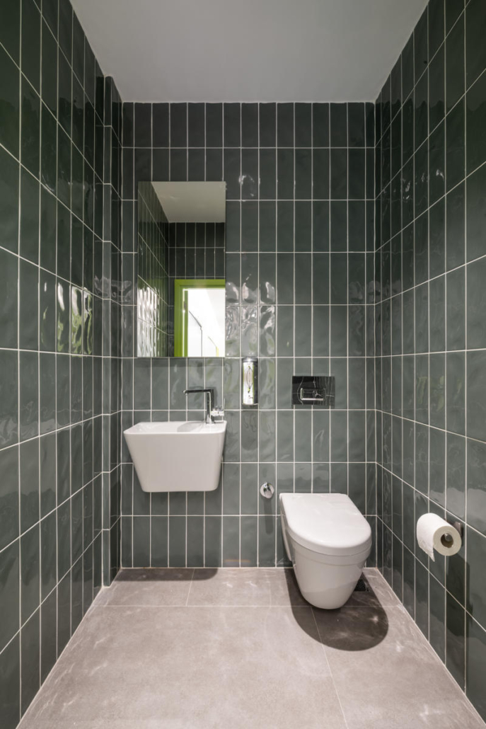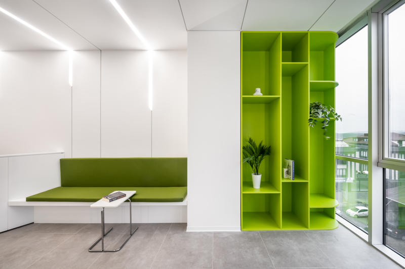 Yeşil tonları, klinik içindeki görsel hiyerarşiyi belirleyen ana unsurlardan biri olarak öne çıkıyor. Bekleme ve dolaşım alanlarında kullanılan farklı yeşil tonları, mekanın sakinleştirici etkisini pekiştirirken aynı zamanda kullanıcıya alanın işlevselliğini sezdiriyor.