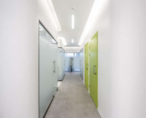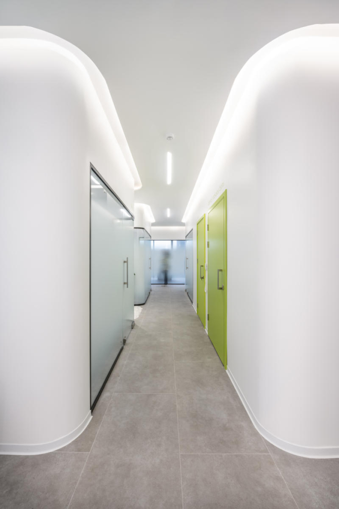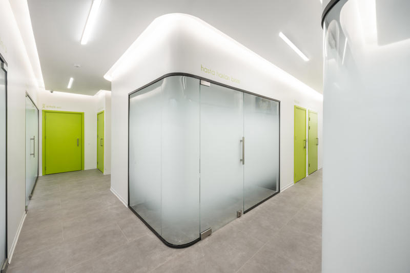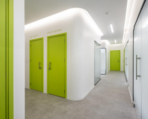 Klinikteki aydınlatma tasarımı, yalnızca fonksiyonel bir ihtiyaç olarak değil, aynı zamanda tavan tasarımı ile bütünleşerek mekansal yönlendirme aracı olarak kurgulanmış. Gizli aydınlatmalar ve özel tavan tasarımı, sirkülasyon aksları boyunca kullanıcıyı doğal bir biçimde yönlendiriyor ve mekanın perspektifini güçlendiriyor. Beyaz duvarlar ve lake kapılar, steril ve nitelikli bir algı yaratırken, tavan ve döşemeden koparılmış elemanlar mekanı tanımlayarak kullanıcı kullanımı kolaylaştırıyor.