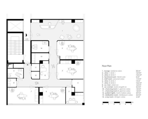 Muayene odaları cephe tarafına konumlandırılmış; doğal ışık ve havalandırmadan maksimum düzeyde faydalanacak şekilde tasarlanmış. Sterilizasyon odası, röntgen odası ve personel alanları ise muayene odalarının karşısına yerleştirilerek mahremiyet ve işlevsellik önceliklendirilmiş.