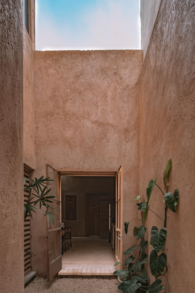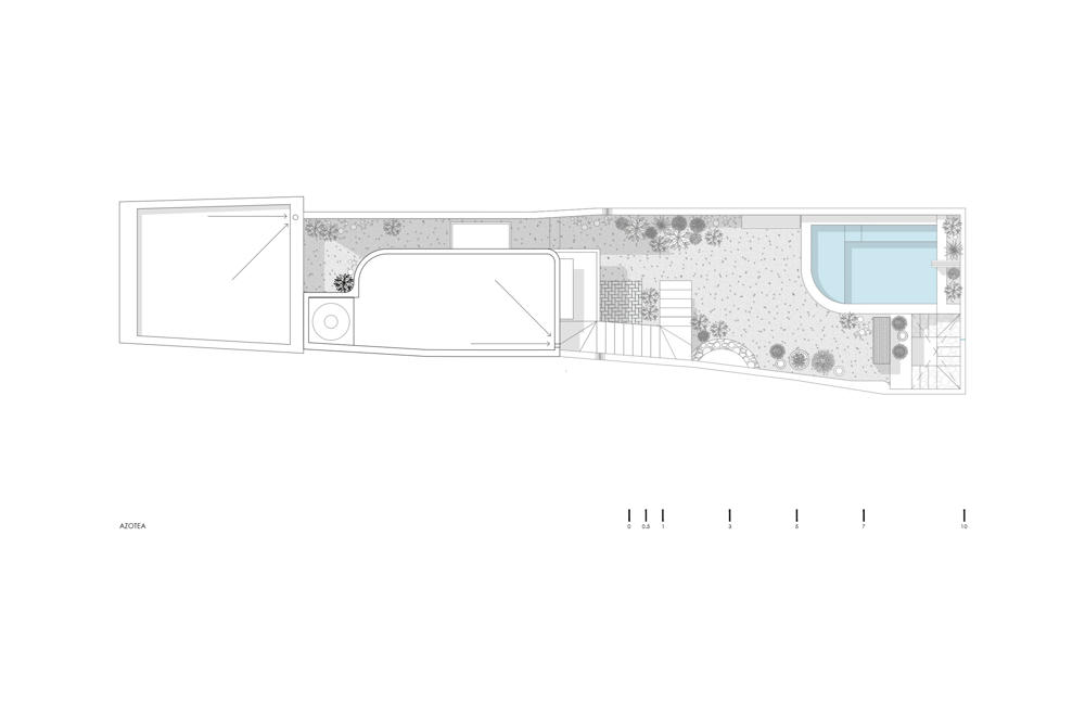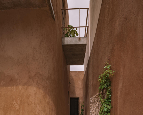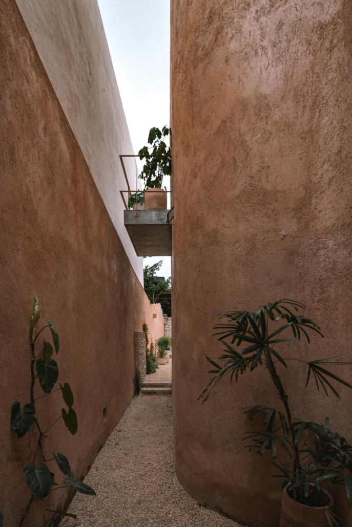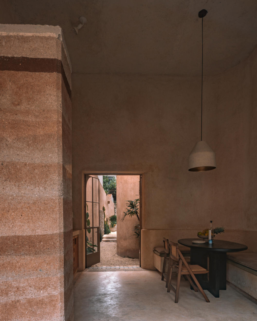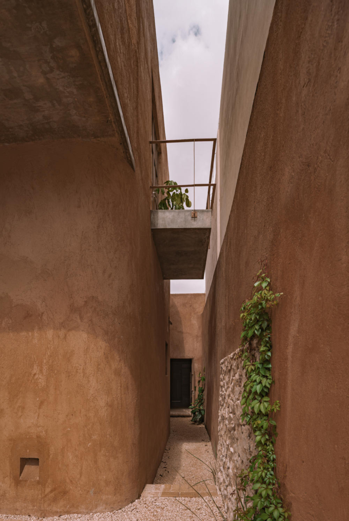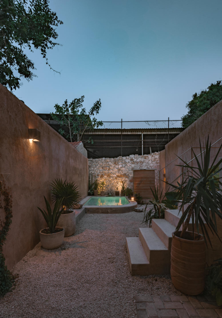 Oturma alanından çıkınca, yeni hacimle birleştiği noktadan dar bir koridor uzanıyor. Yol önce daralıyor, sıkışıyor ve ardından aniden tamamen açılarak arka avluya çıkıyor. Buradan havuz görünüyor; yer altı seviyesine geçmeden önce bir görsel filtre işlevi gören ikinci bir sıkıştırılmış toprak duvar tarafından çerçeveleniyor.