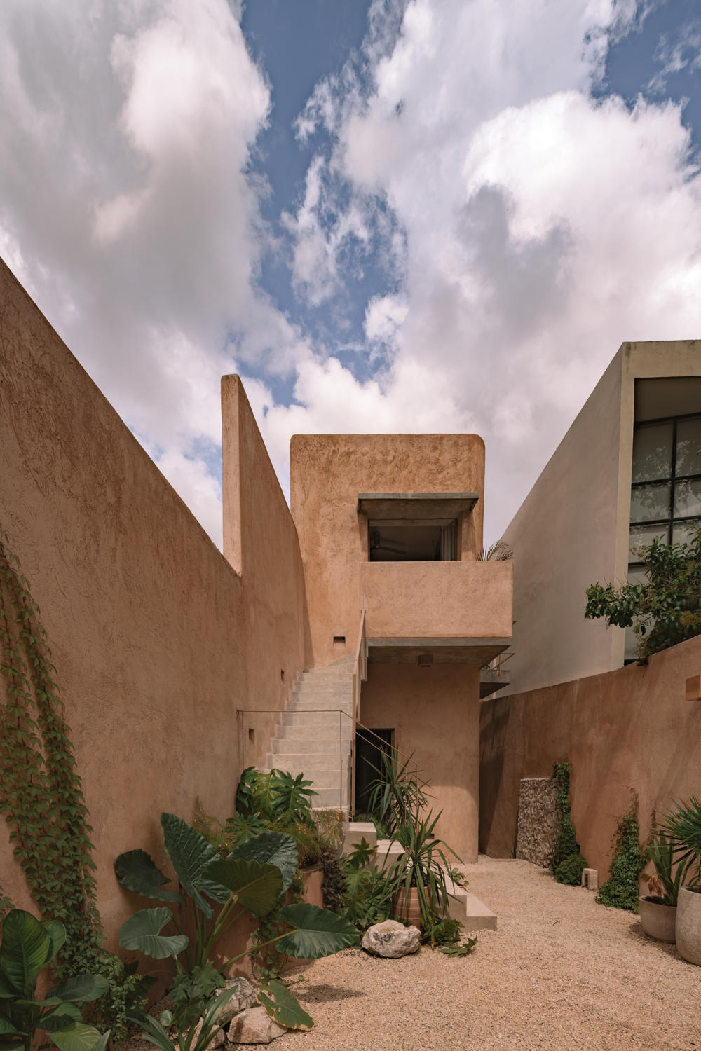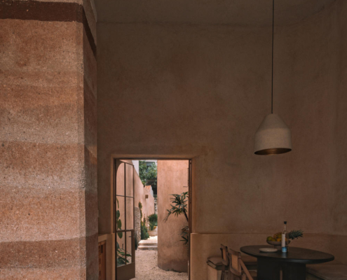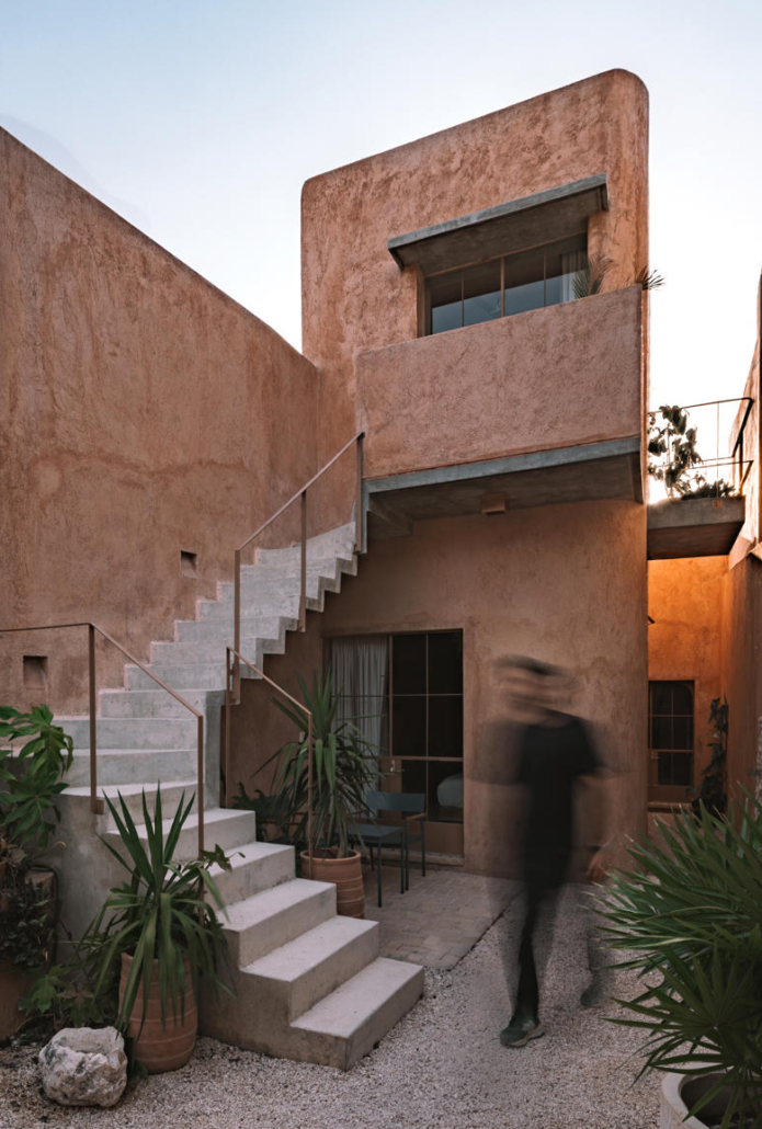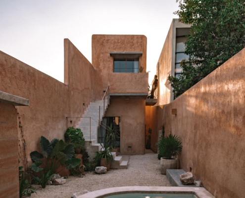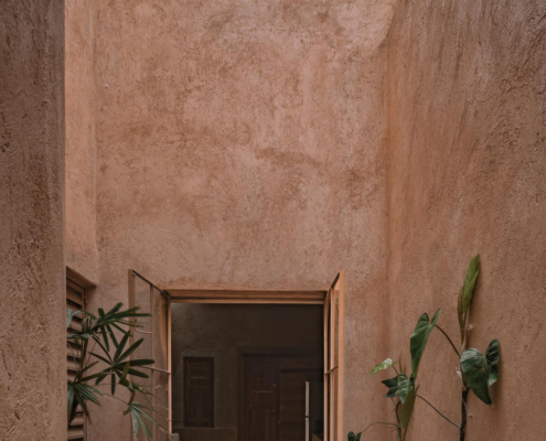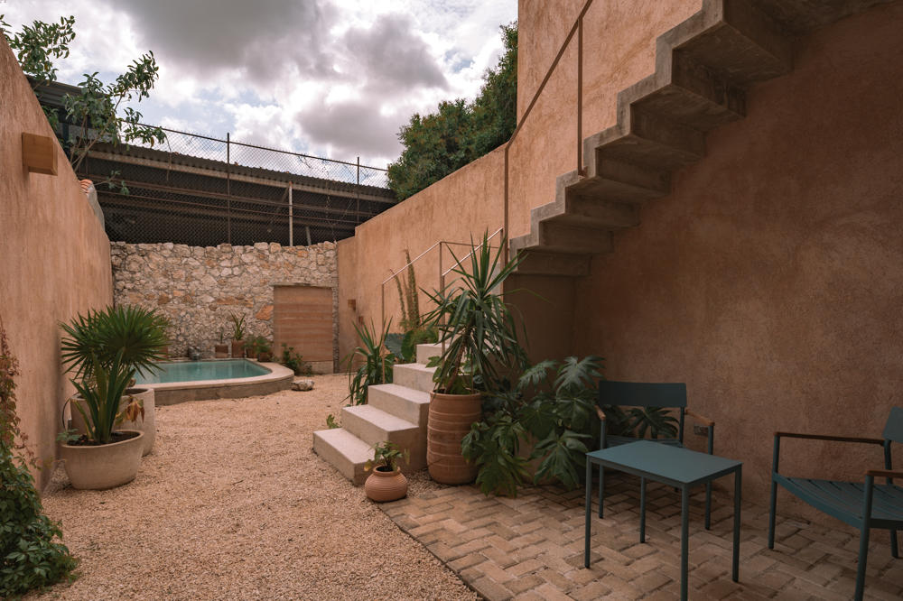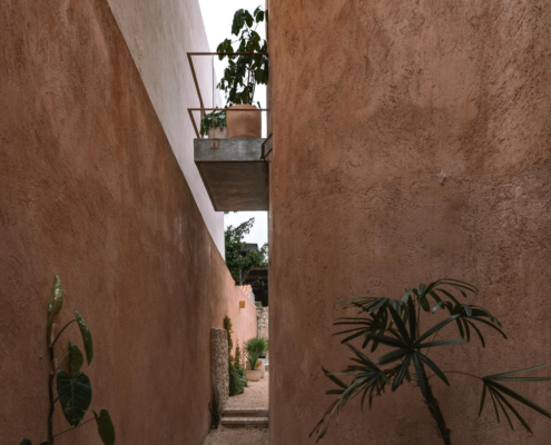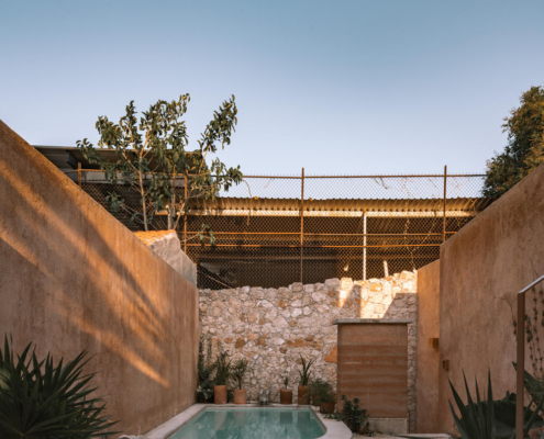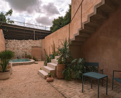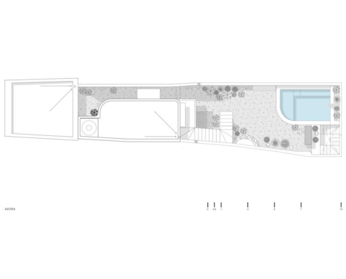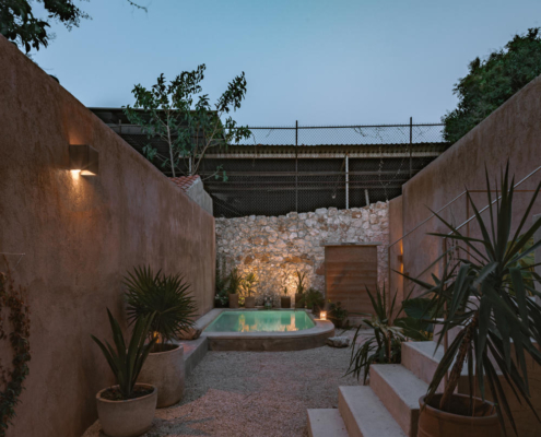 Oturma alanından çıkınca, yeni hacimle birleştiği noktadan dar bir koridor uzanıyor. Yol önce daralıyor, sıkışıyor ve ardından aniden tamamen açılarak arka avluya çıkıyor. Buradan havuz görünüyor; yer altı seviyesine geçmeden önce bir görsel filtre işlevi gören ikinci bir sıkıştırılmış toprak duvar tarafından çerçeveleniyor.