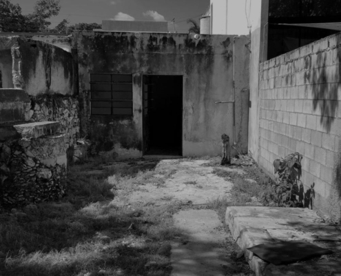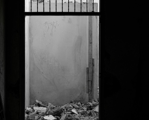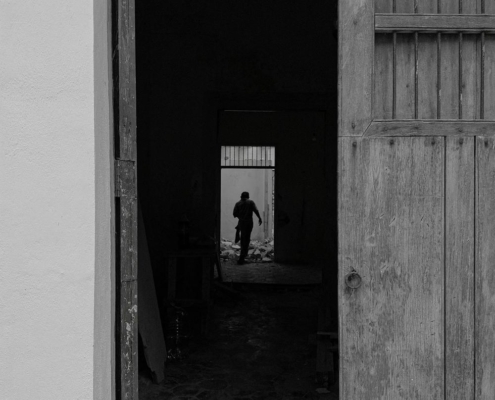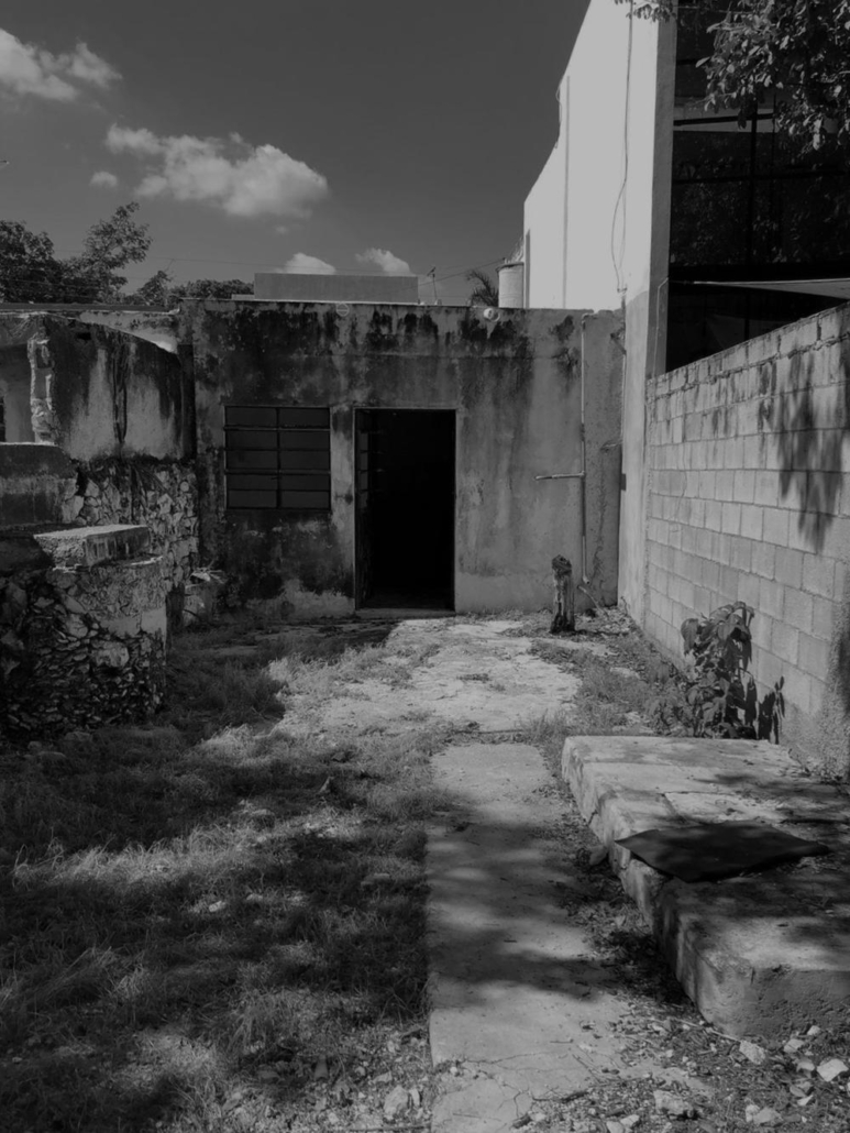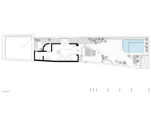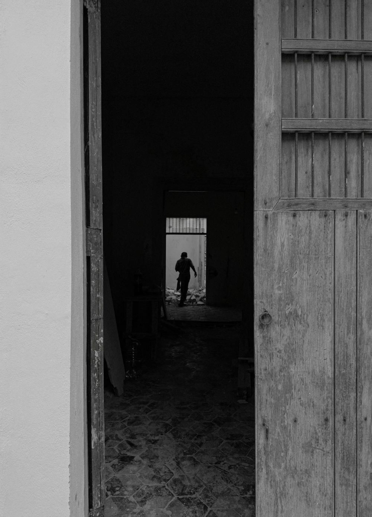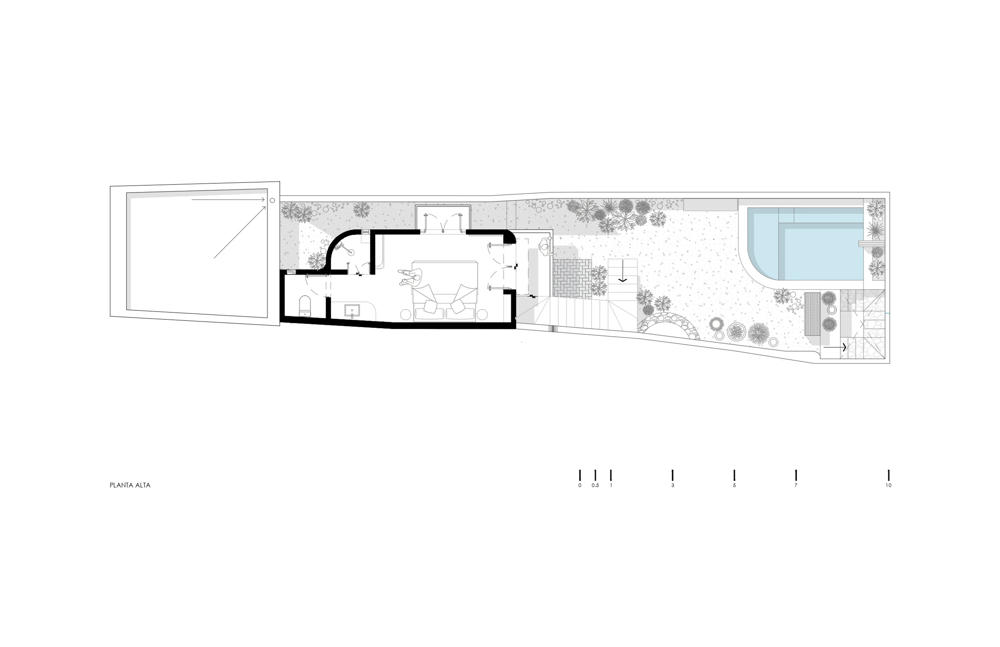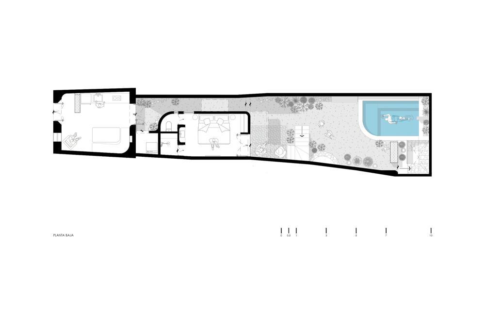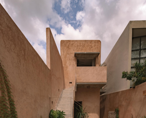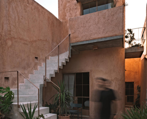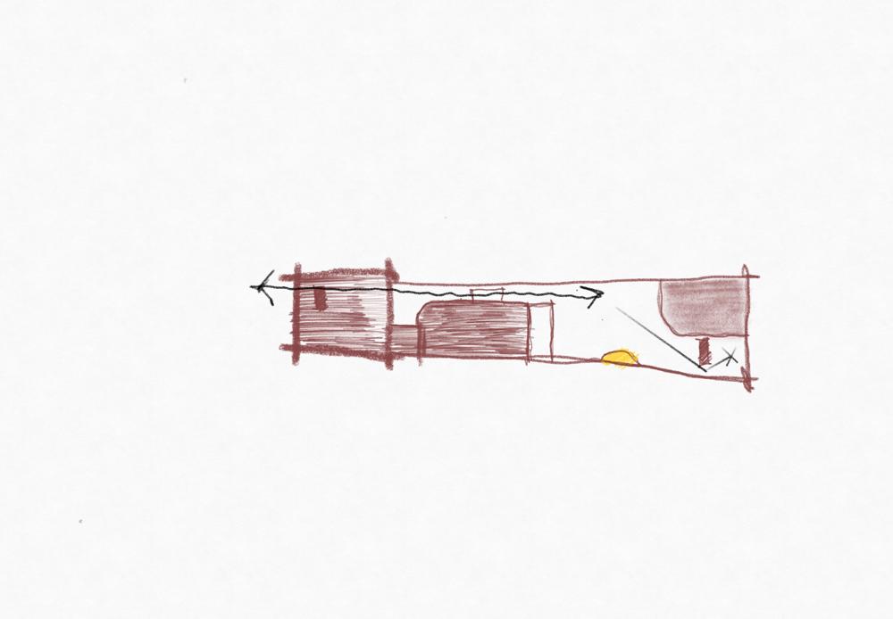 Oturma alanından çıkınca, yeni hacimle birleştiği noktadan dar bir koridor uzanıyor. Yol önce daralıyor, sıkışıyor ve ardından aniden tamamen açılarak arka avluya çıkıyor. Buradan havuz görünüyor; yer altı seviyesine geçmeden önce bir görsel filtre işlevi gören ikinci bir sıkıştırılmış toprak duvar tarafından çerçeveleniyor.