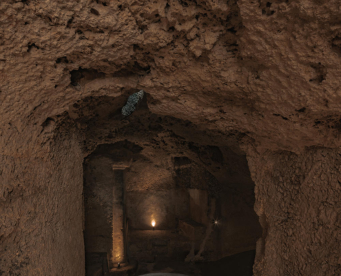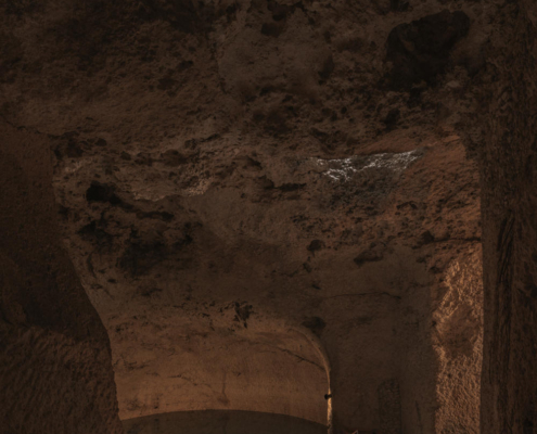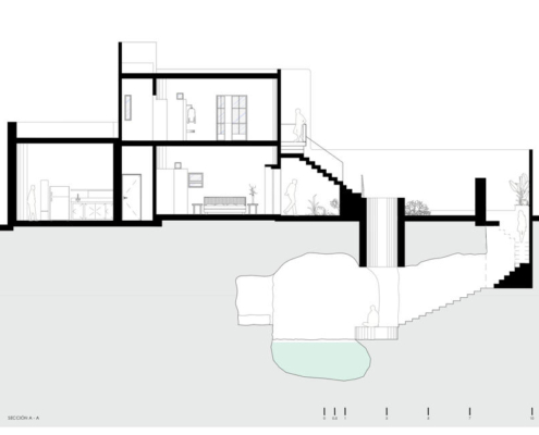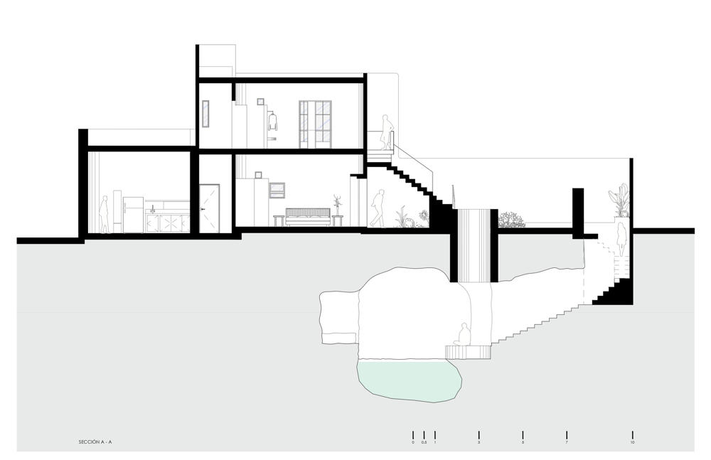 Ev bir sıralı bir düzen ile kullanıcılara açılıyor: ilk olarak, mutfak köşesini, oturma ve yemek alanlarını barındıran orijinal kısım; ardından biri yukarıda, biri aşağıda yer alan, yalnızca mağaranın başladığı sınıra kadar uzanan, iki yatak odalı yeni bir hacim yer alıyor. Bu doğal sınır, projenin ölçeğini ve boyutlarını tanımlıyor.
