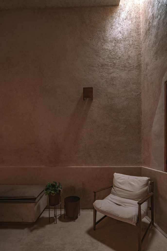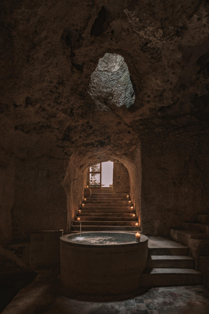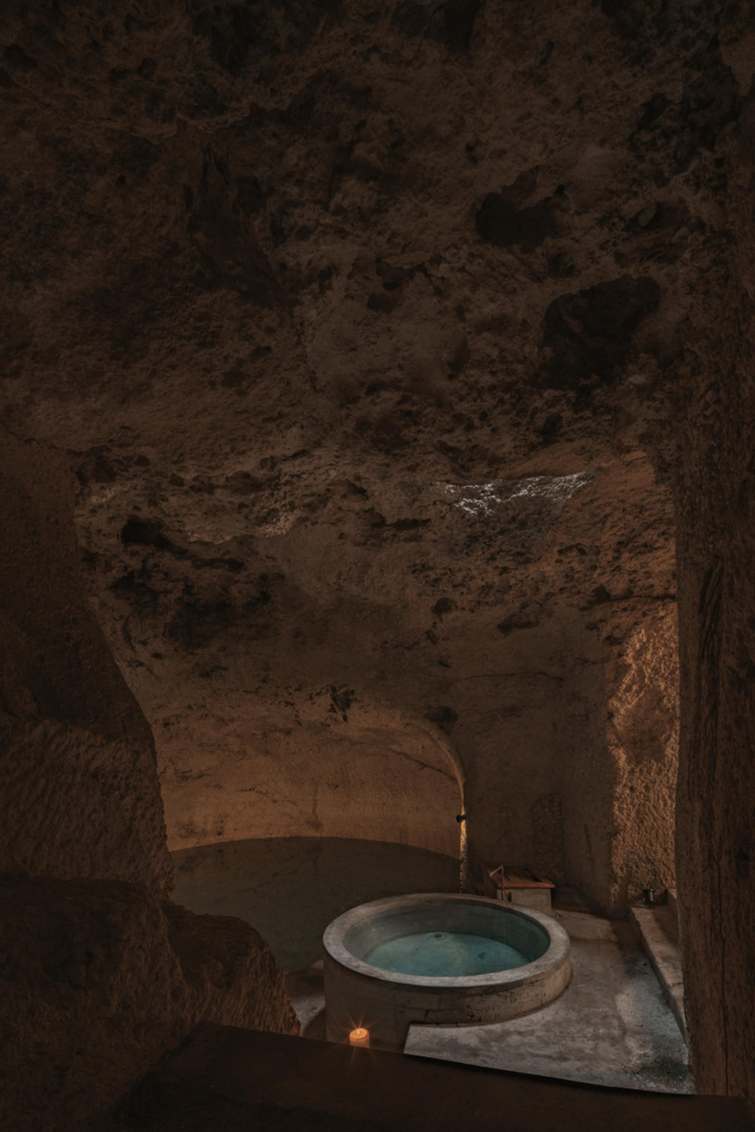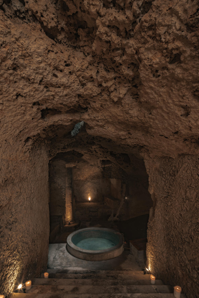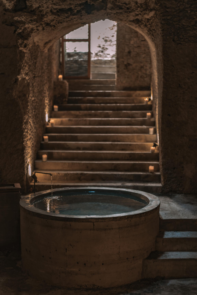 Havuzun yanında, orijinal kuyunun tam altına yerleştirilmiş yapay bir küvetin bulunduğu alt seviyeye inen bir merdiven bulunuyor. Doğal ışık, kuyu boşluğundan süzülerek suya ulaşıyor. Ortaya çıkan ortam nemli, mahrem ve sessiz; şaşkınlıktan önce gelen bir durak gibi davranıyor.