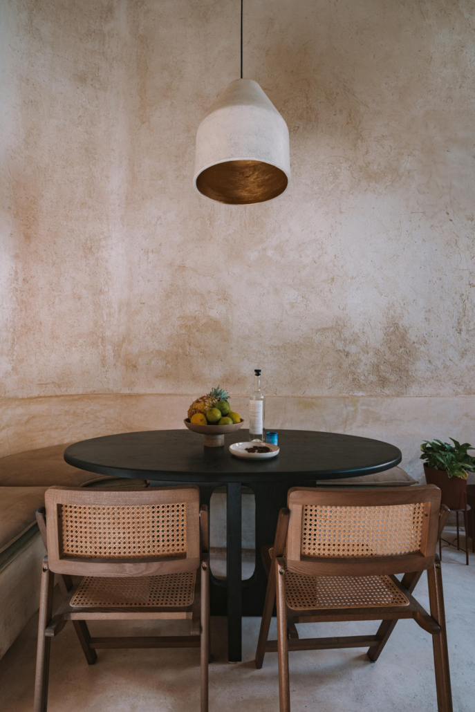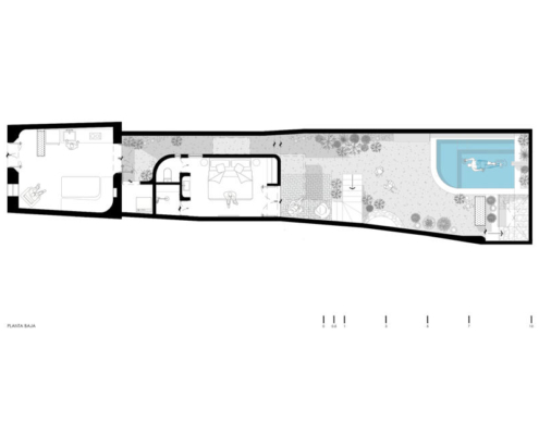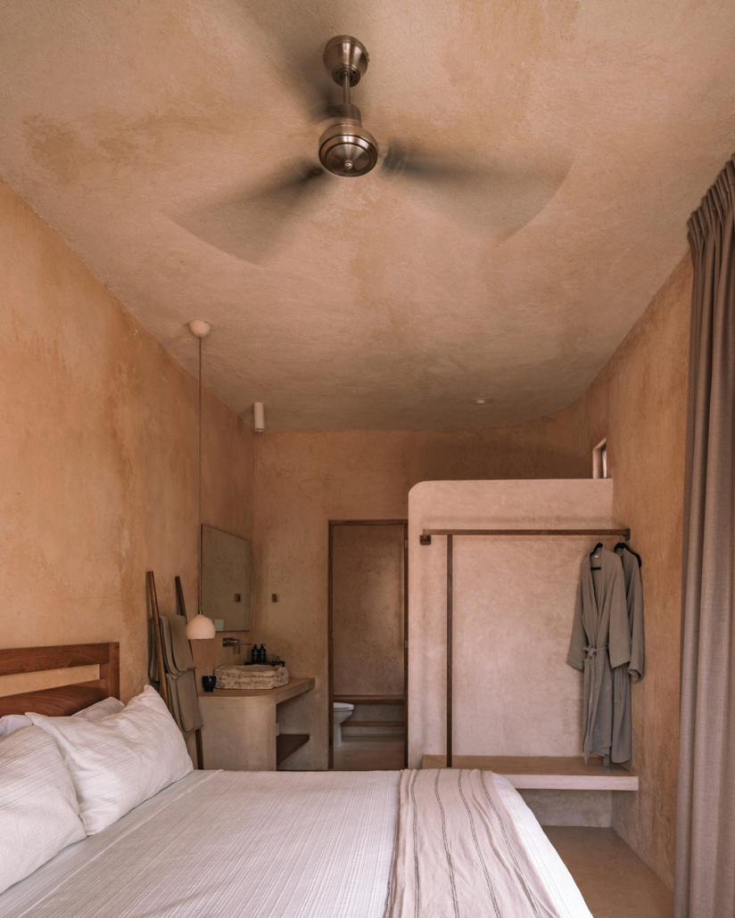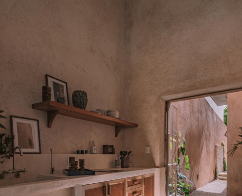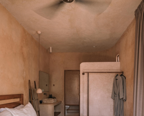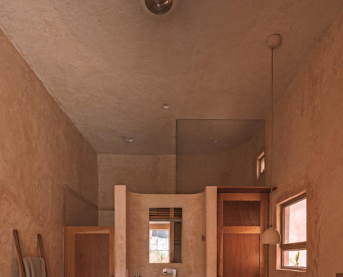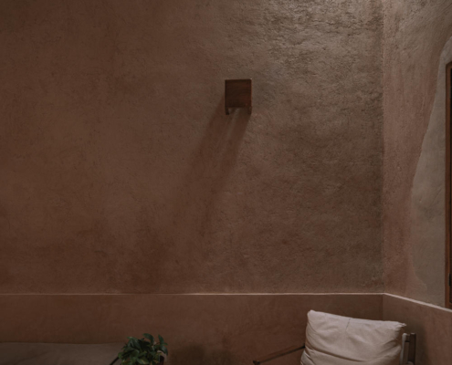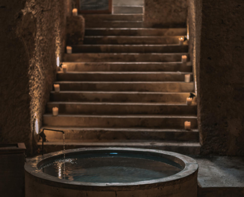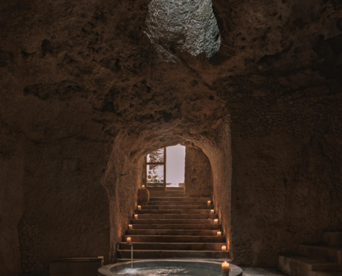 Havuzun yanında, orijinal kuyunun tam altına yerleştirilmiş yapay bir küvetin bulunduğu alt seviyeye inen bir merdiven bulunuyor. Doğal ışık, kuyu boşluğundan süzülerek suya ulaşıyor. Ortaya çıkan ortam nemli, mahrem ve sessiz; şaşkınlıktan önce gelen bir durak gibi davranıyor.