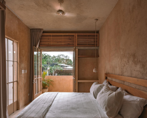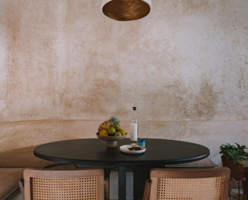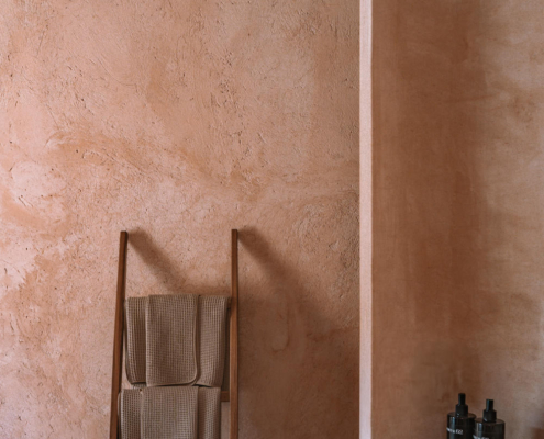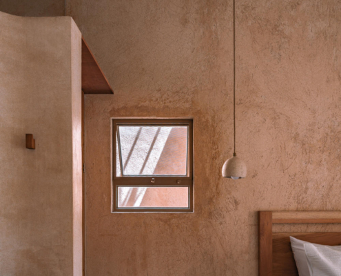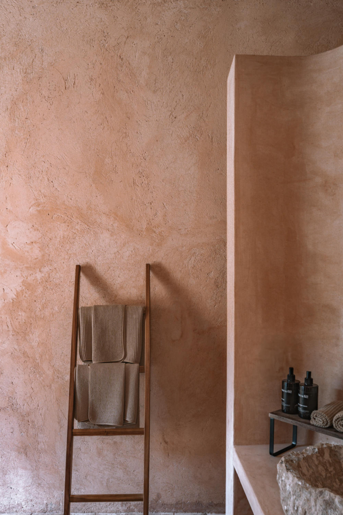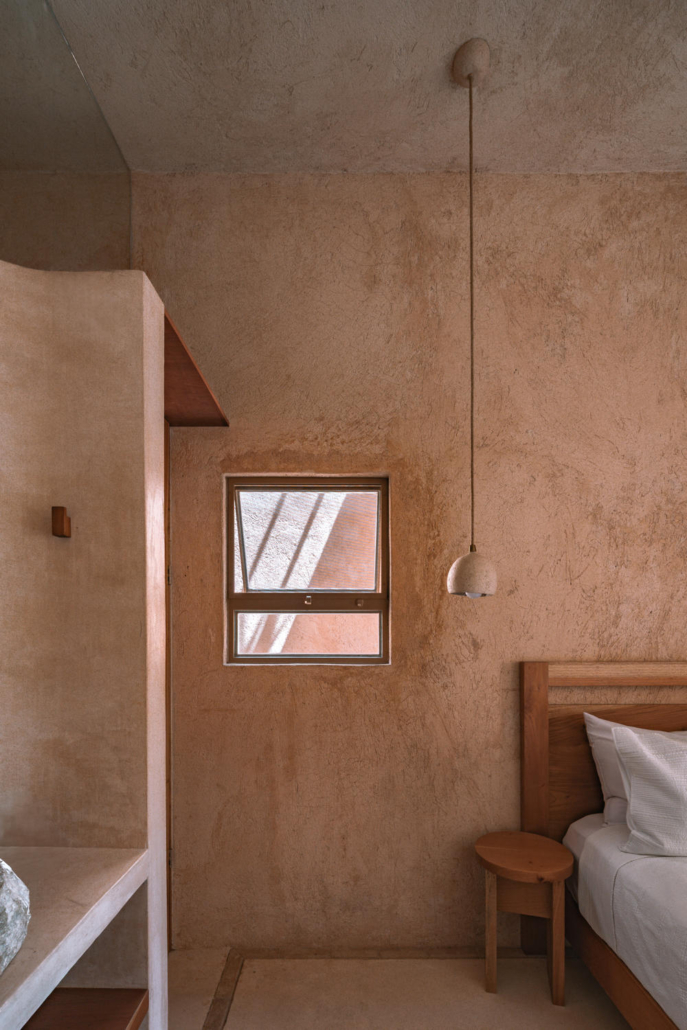Malzemeler, araziyle yakın bir diyalog içinde seçilmiş. Dış cephedeki yama görünümü, yerel toprakla karıştırılarak, tüm hacmi tanımlayan terracotta tonunda duvarlar elde edilmiş. Gömme mobilyalar ve marangozluk işleri masif sedir ağacından yapılmış; bu da dokusal bir bütünlük ve devamlılık sağlamış. Projede sade bir renk paleti tercih edilmiş, hiçbir şeyin gerekenden fazla olmamasına özen gösterilmiş.