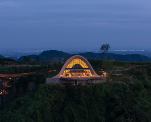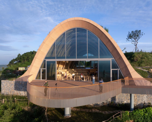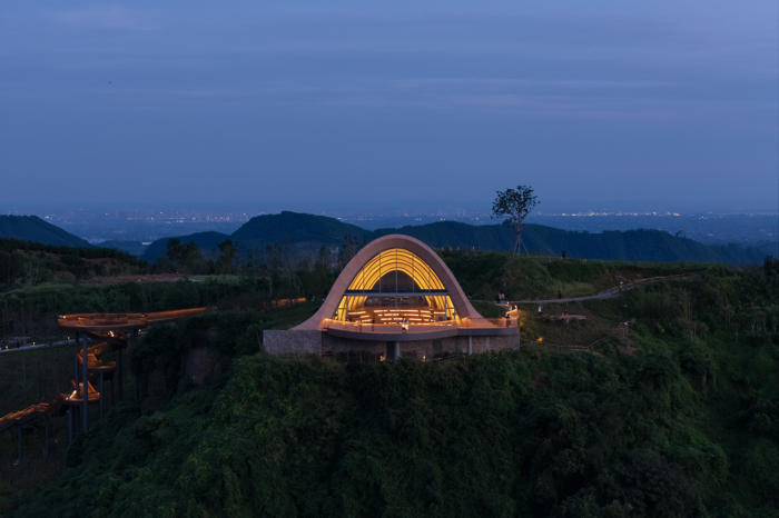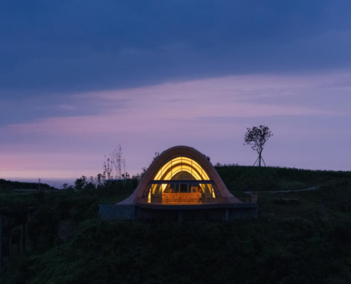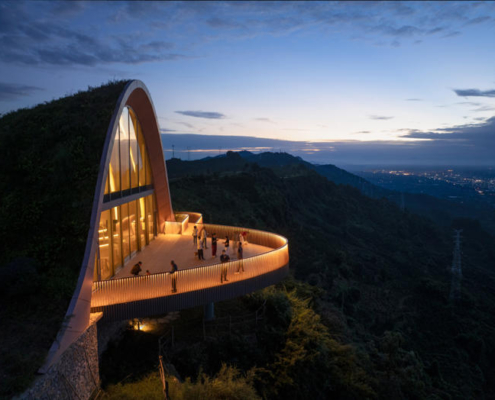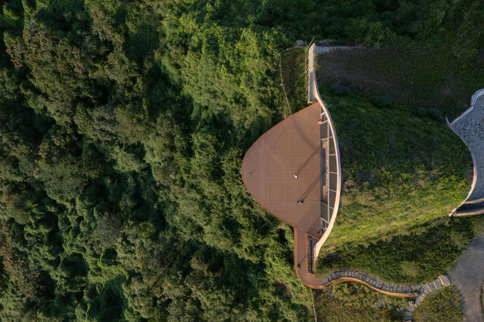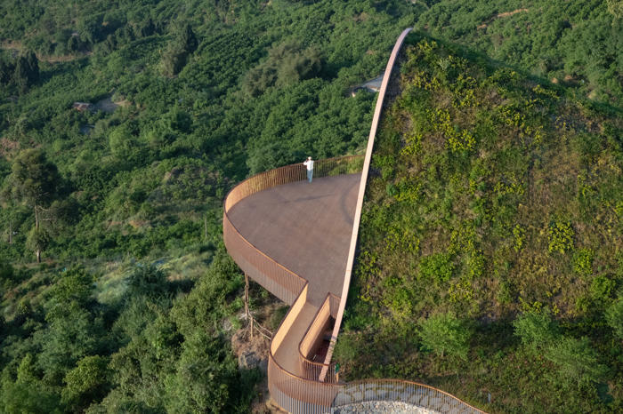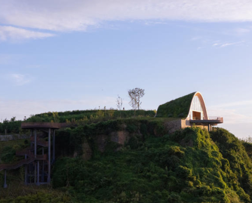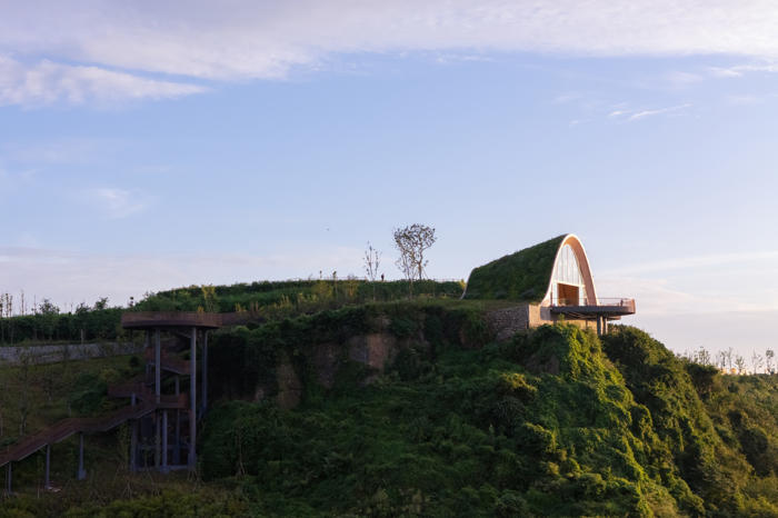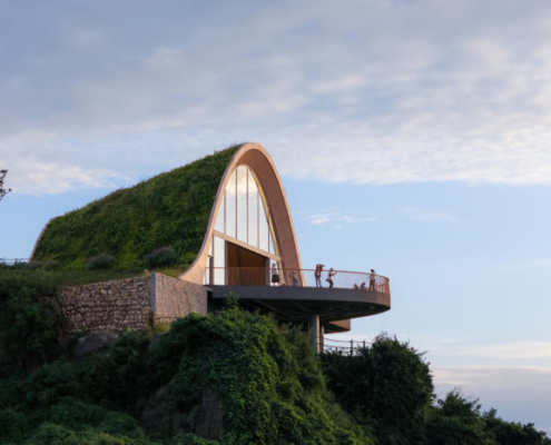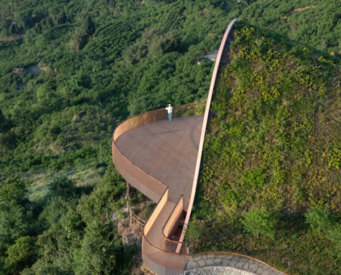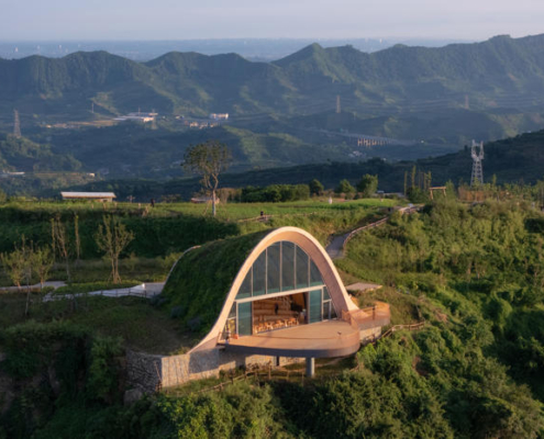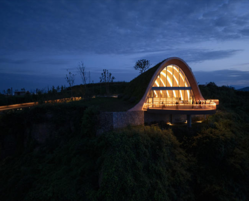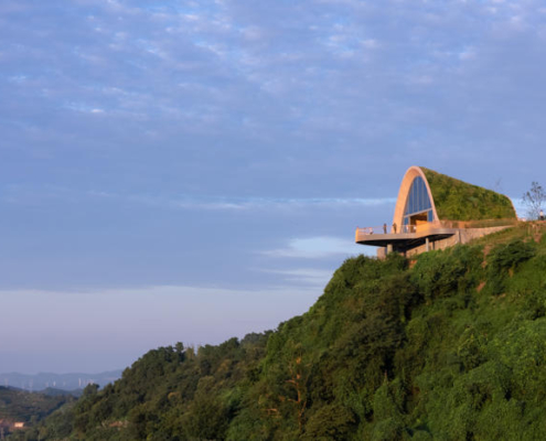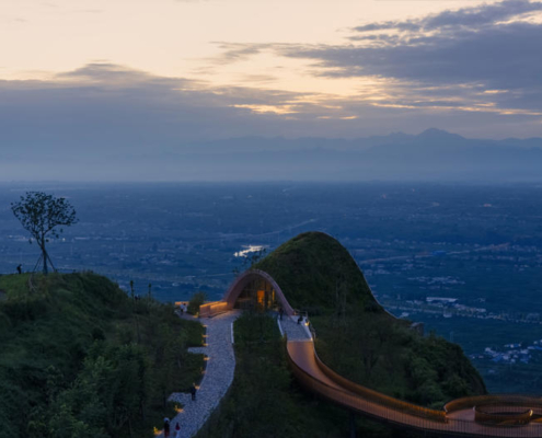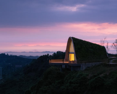 MVRDV, Chengdu’nun güneyinde yer alan tepeler arasında konumlanan, kemerli ve toprakla örtülü ahşap bir pavyondan oluşan Pujiang Platform’un inşaatını tamamladı. Proje, hem bir ziyaret noktası hem de etkinlik mekanı olarak kurgulanırken, Orta Çin’in etkileyici doğal peyzajından en üst düzeyde yararlanmayı amaçlıyor. Doğayla bütünleşirken aynı zamanda aşağıdaki düzlüklerden bakıldığında bir odak noktası olarak algılanması hedeflenen yapı, teleskopik bir biçimde dizilmiş toprak örtülü ahşap kemerlerden oluşuyor ve ziyaretçileri yamaç üzerinde dışarı doğru uzanan geniş seyir penceresi ve balkona yönlendiriyor.