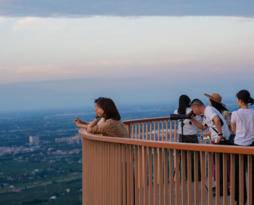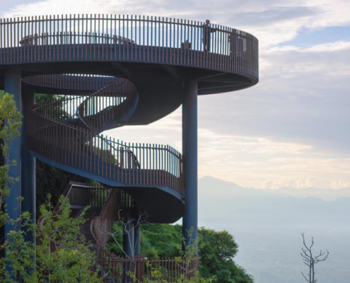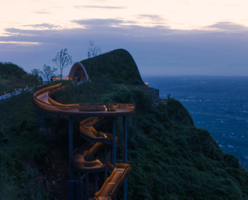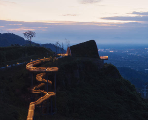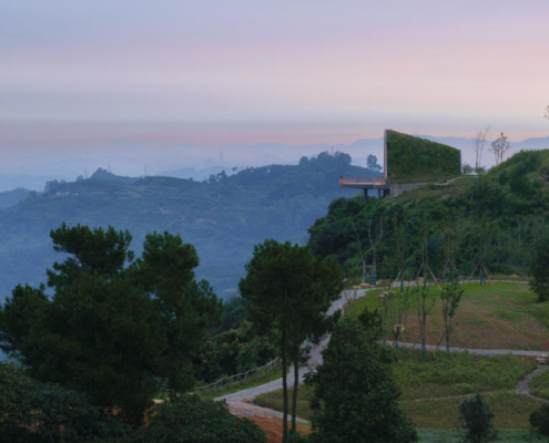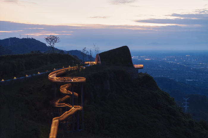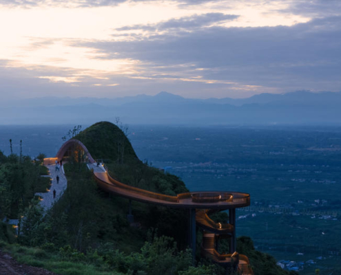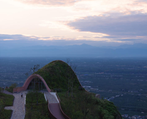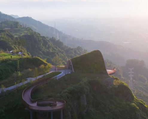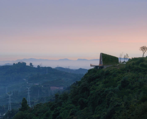 Chengdu’nun güneybatısında yer alan Pujiang, sakinlerine yüksek kaliteli ve sürdürülebilir bir yaşam sunma hedefiyle gelişmekte olan yeni bir yerleşim alanı olarak öne çıkıyor. Pujiang’ın doğusundaki tepelerde bulunan mevcut ve sade bir seyir noktası, büyüyen kente ve arkasında uzanan Qionglai Dağları silsilesine hakim bir manzara sunuyor. Pujiang İlçesi Planlama ve Doğal Kaynaklar Bürosu tarafından görevlendirilen MVRDV, bu seyir noktasını turistik bir cazibe merkezi ve düğünlerden resmi toplantılara kadar farklı etkinliklere ev sahipliği yapabilecek çok amaçlı bir mekana dönüştürdü.