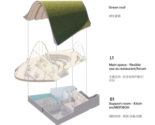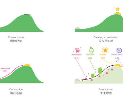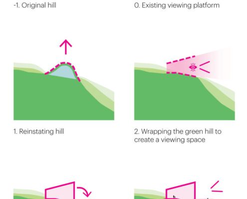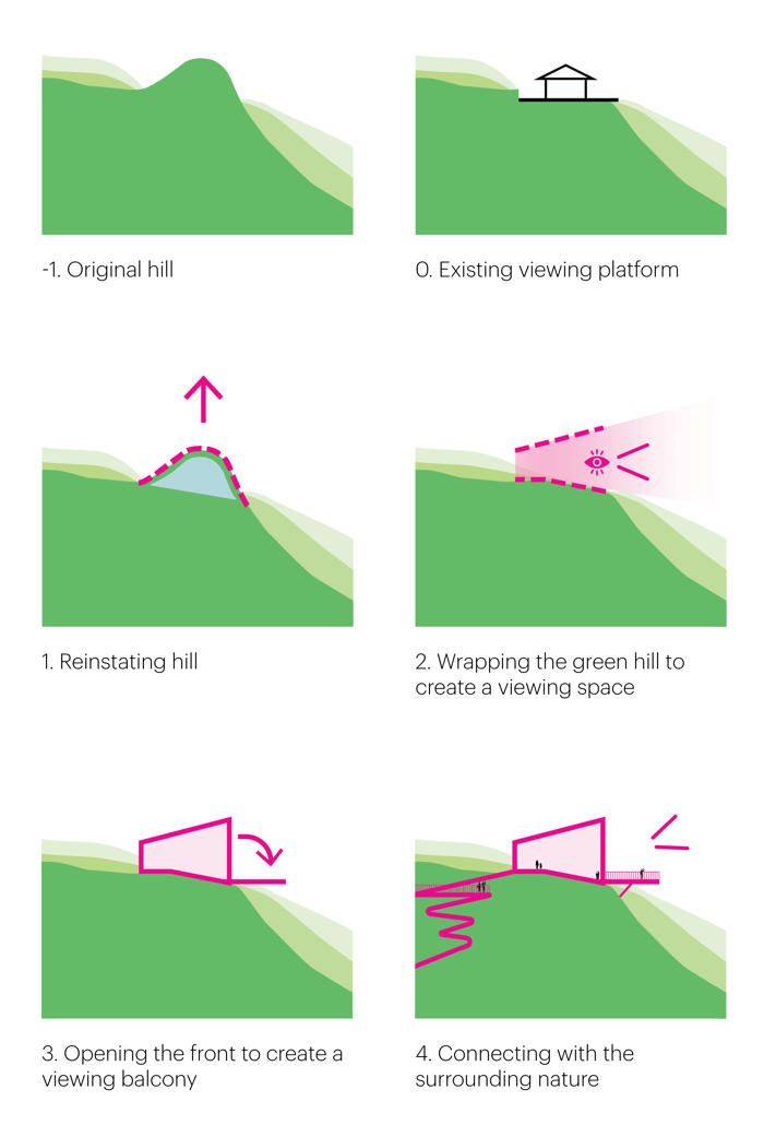 Tasarım süreci, mevcut seyir platformunun inşası sırasında tepenin düzleştirildiğinin fark edilmesiyle şekillenmiş. Toprak setiyle örtülü kemerli bir pavyon tasarlanarak, geçmişte var olan tepenin mekânsal bir yankısı yeniden üretilmiş. Proje kapsamında, mevcut patika ağı da geliştirilerek seyir noktasına ulaşım için birden fazla rota oluşturuldu. Bunlara, kıvrımlı bir merdiven yapısına entegre edilen ikincil bir seyir platformu da dahil edilmiş. Pavyonun ahşap strüktürü, karbon salımını azaltma potansiyeline rağmen Çin’de hala temkinle yaklaşılan ahşabın yapı sektöründe daha yaygın kullanılmasını teşvik etmeyi amaçlayan bir örnek olarak ele alınmış.