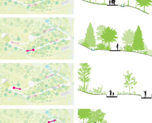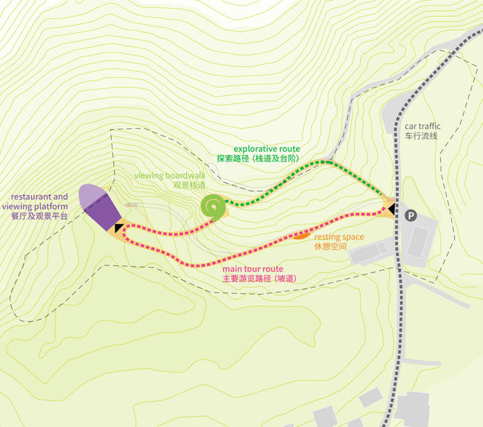 Tasarım, alandaki mevcut yaya yollarını koruyarak bunları bir döngü halinde birbirine bağlayan yeni bir merdiven ekliyor. Merdivenin üst noktasında yer alan dairesel ikincil seyir platformu, hem uzak dağ silsilesine hem de yakın çevredeki doğal peyzaja 360 derecelik bir bakış sağlıyor.