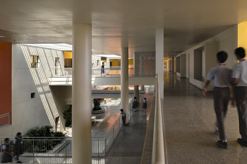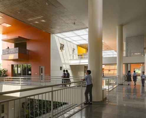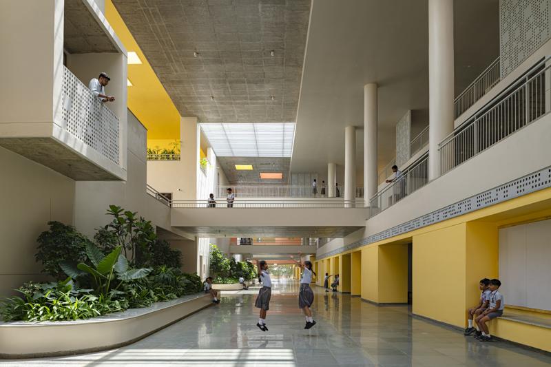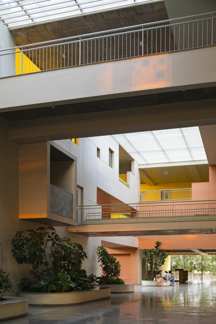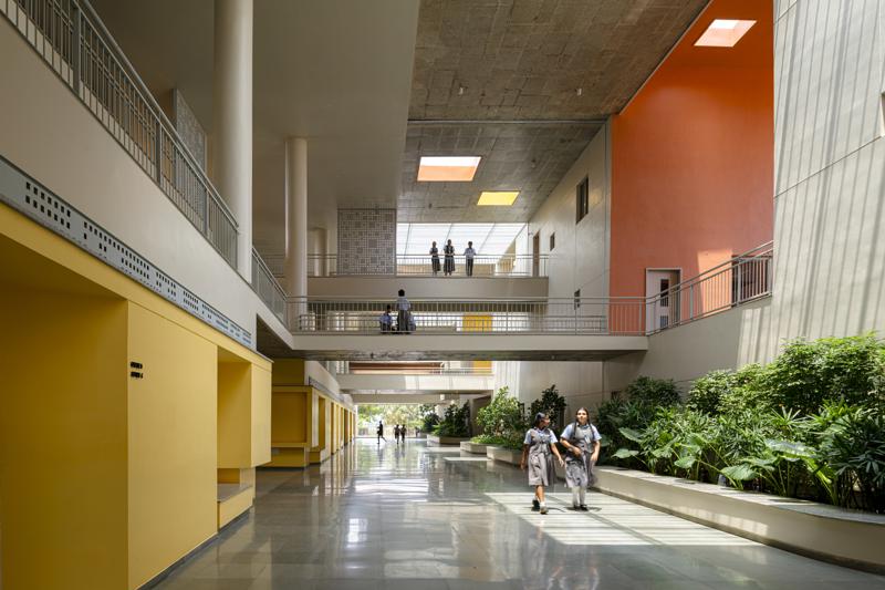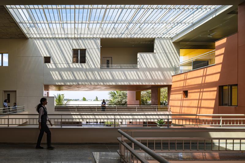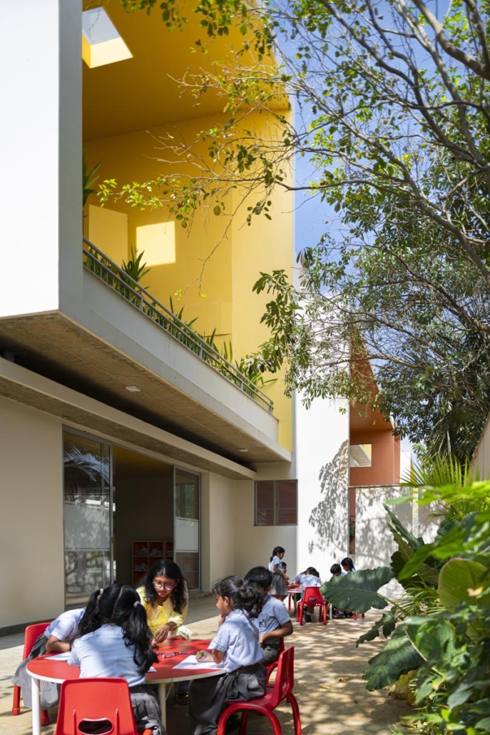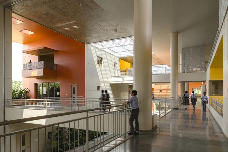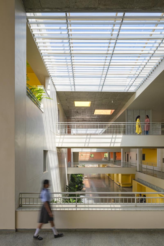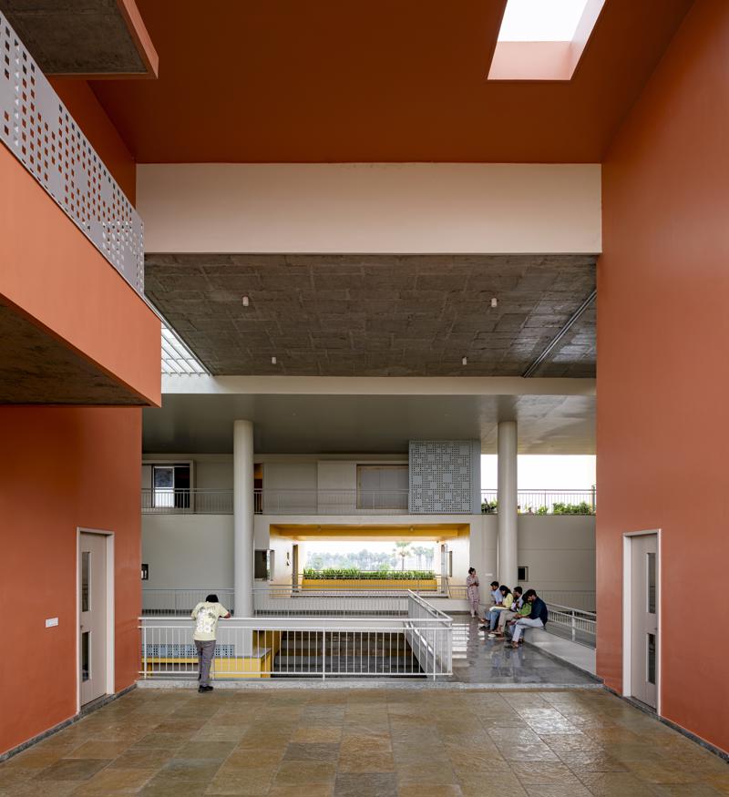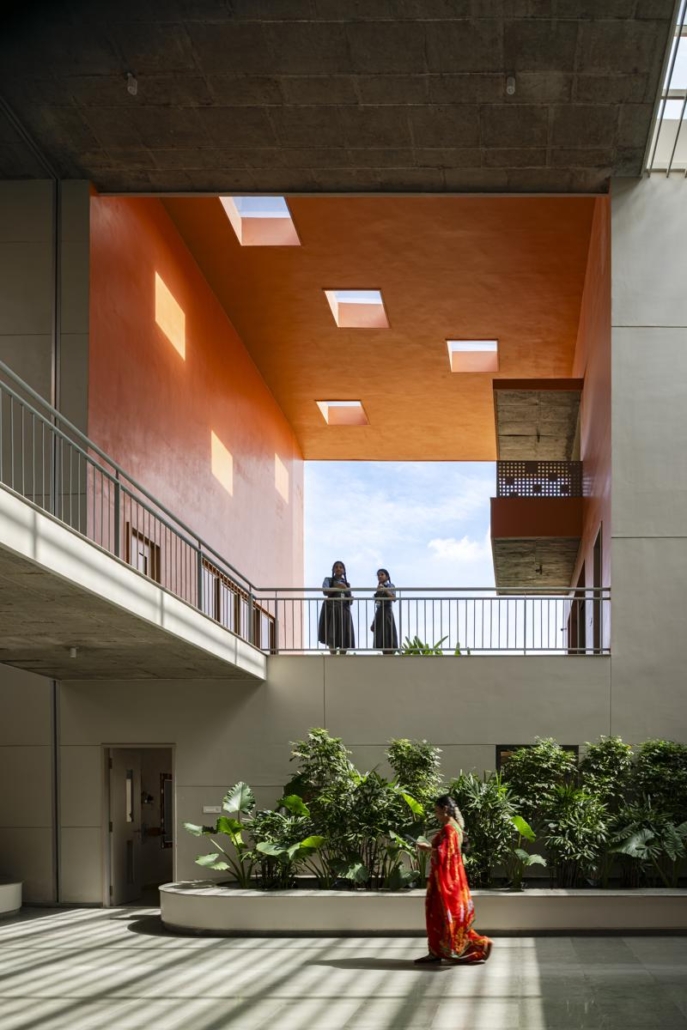 Zemin kattaki sınıflar, kuzey ve güney yönlü gölgeli avlulara açılıyor. Üst katlardaki sınıflar ise doğu ve batıya yönelmiş, çift yükseklikteki büyük avluları paylaşıyor. Bu avlular, geleneksel dört duvarlı sınıfın yarattığı sıkışmışlık hissini azaltmak ve mekanı “gurukul” modeline yaklaştırmak amacıyla duvarların ortadan kaldırıldığı bir mekansal deneme sunuyor. Yapı, öğrencilerin bireysel çalışma, grup tartışmaları, sunum ve ders anlatımı gibi öğrenme biçimleri arasında serbestçe geçiş yapabilmesini mümkün kılarak yapılandırmacı öğrenmenin gerekliliklerini mekana taşıyor.