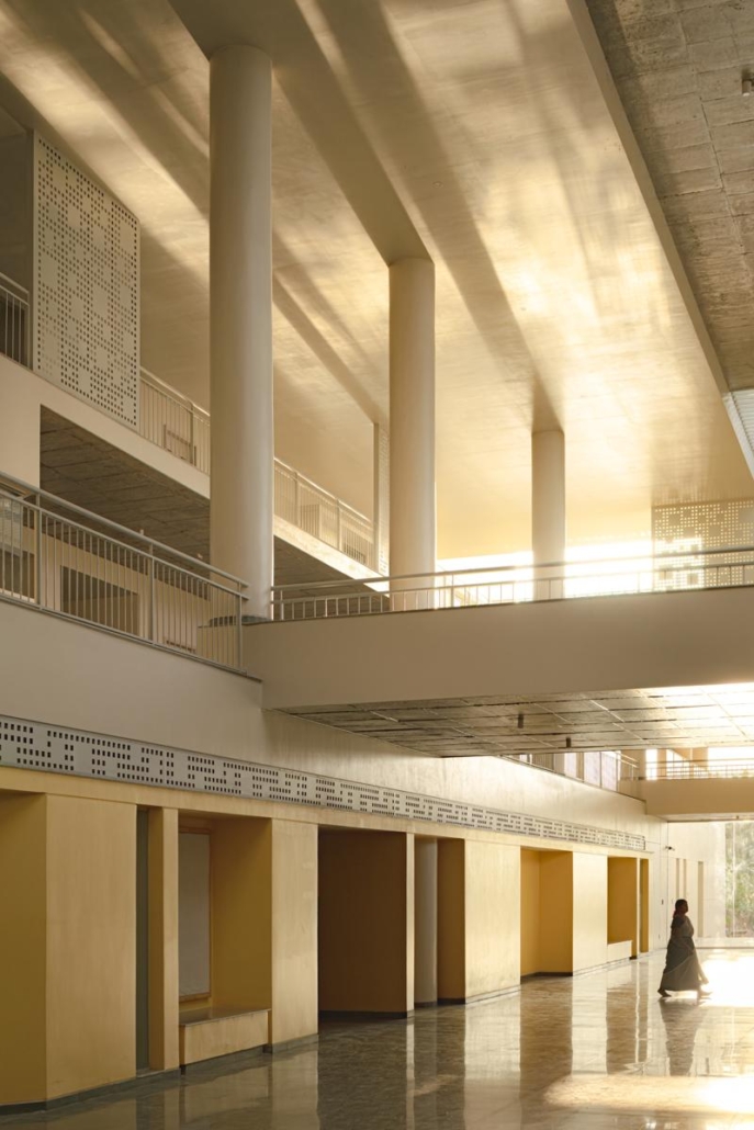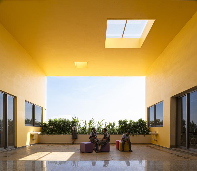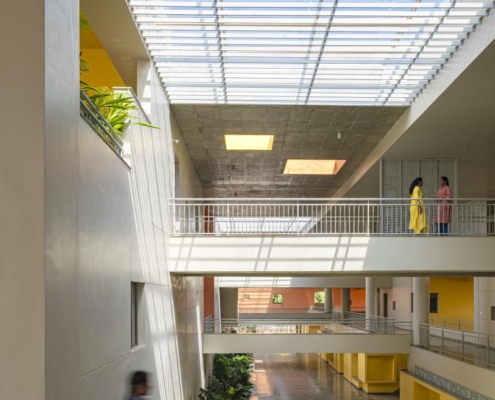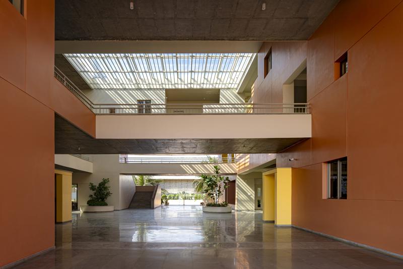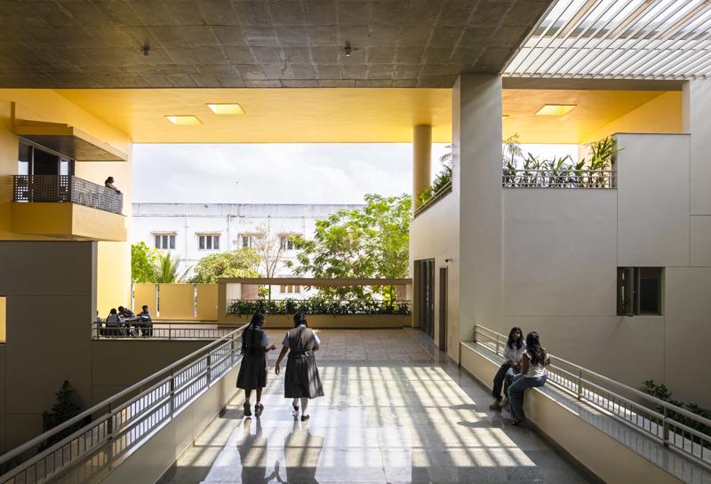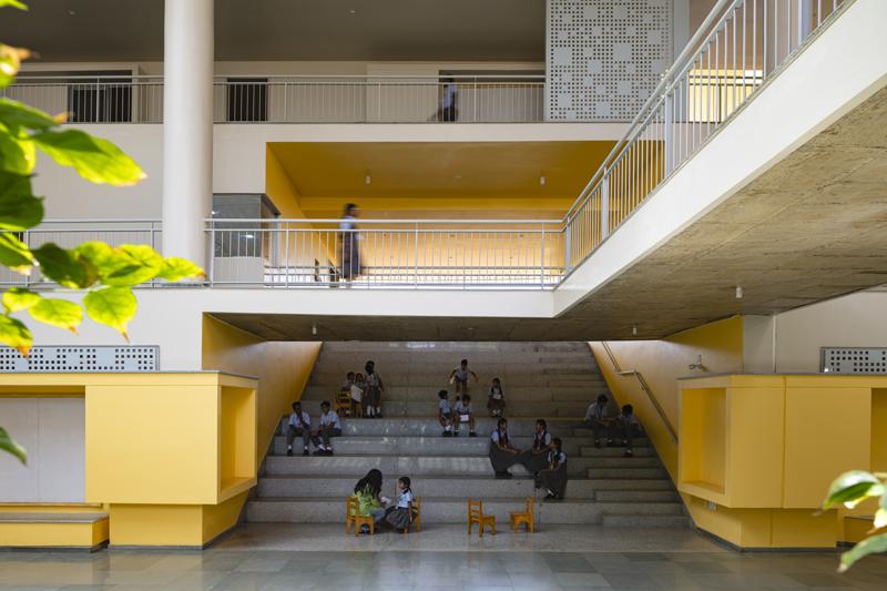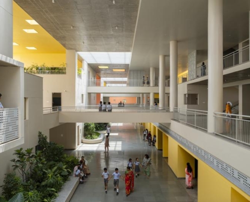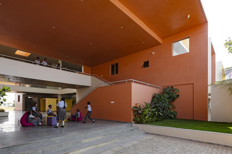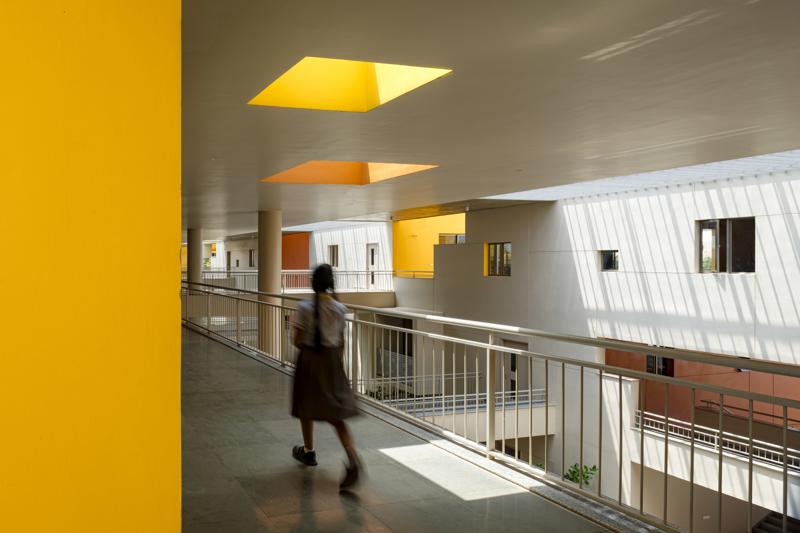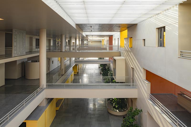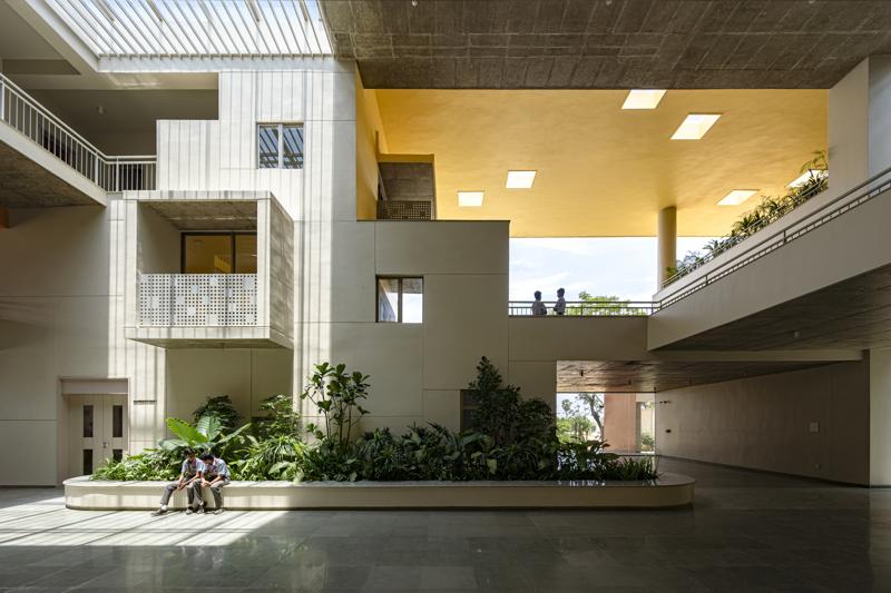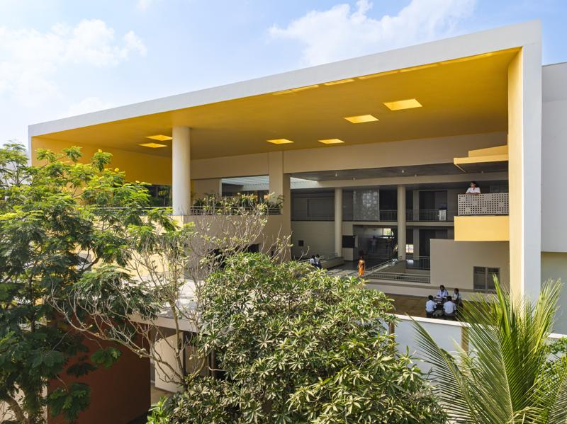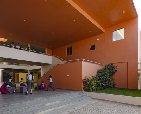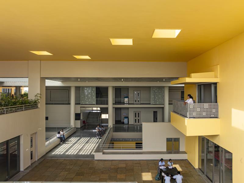 Zemin kattaki sınıflar, kuzey ve güney yönlü gölgeli avlulara açılıyor. Üst katlardaki sınıflar ise doğu ve batıya yönelmiş, çift yükseklikteki büyük avluları paylaşıyor. Bu avlular, geleneksel dört duvarlı sınıfın yarattığı sıkışmışlık hissini azaltmak ve mekanı “gurukul” modeline yaklaştırmak amacıyla duvarların ortadan kaldırıldığı bir mekansal deneme sunuyor. Yapı, öğrencilerin bireysel çalışma, grup tartışmaları, sunum ve ders anlatımı gibi öğrenme biçimleri arasında serbestçe geçiş yapabilmesini mümkün kılarak yapılandırmacı öğrenmenin gerekliliklerini mekana taşıyor.