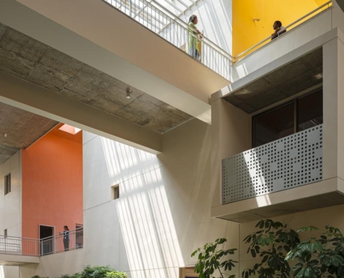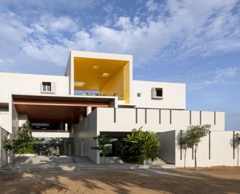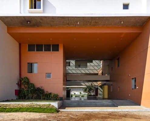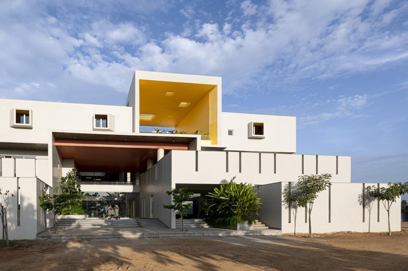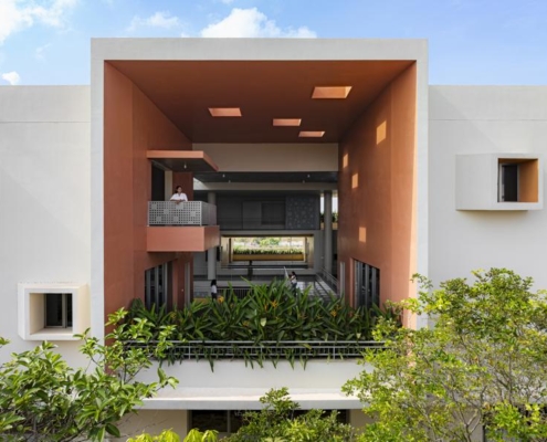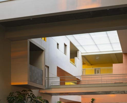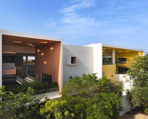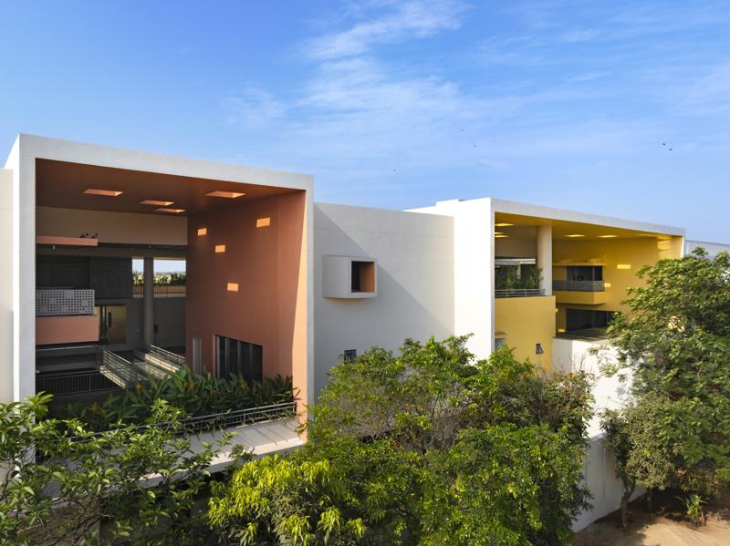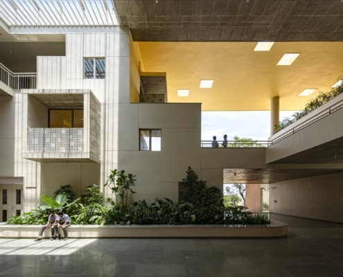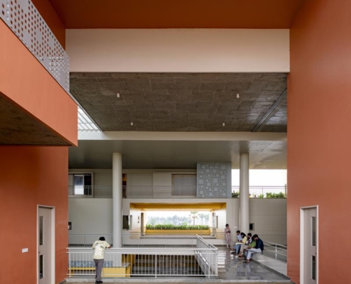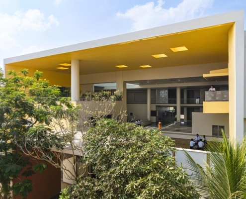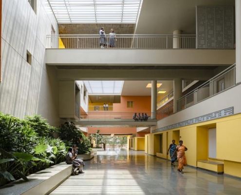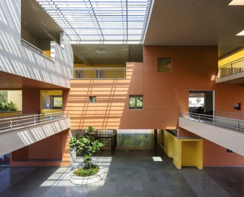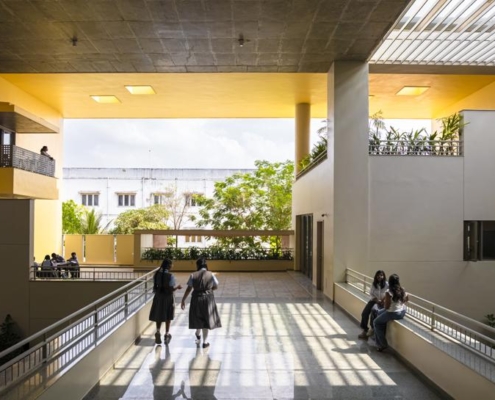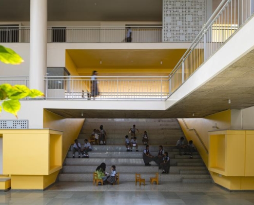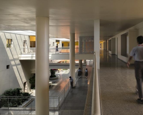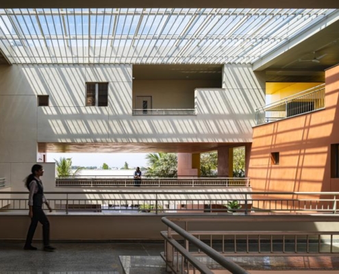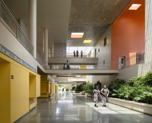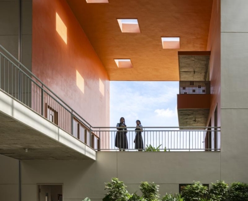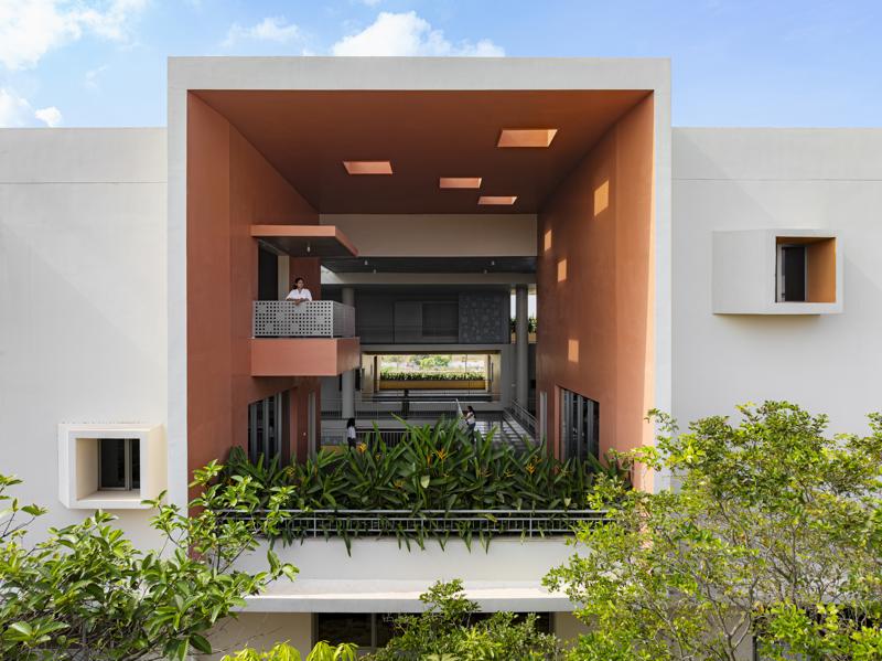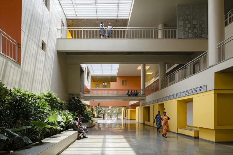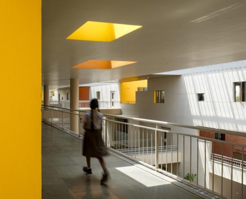 Zemin kattaki sınıflar, kuzey ve güney yönlü gölgeli avlulara açılıyor. Üst katlardaki sınıflar ise doğu ve batıya yönelmiş, çift yükseklikteki büyük avluları paylaşıyor. Bu avlular, geleneksel dört duvarlı sınıfın yarattığı sıkışmışlık hissini azaltmak ve mekanı “gurukul” modeline yaklaştırmak amacıyla duvarların ortadan kaldırıldığı bir mekansal deneme sunuyor. Yapı, öğrencilerin bireysel çalışma, grup tartışmaları, sunum ve ders anlatımı gibi öğrenme biçimleri arasında serbestçe geçiş yapabilmesini mümkün kılarak yapılandırmacı öğrenmenin gerekliliklerini mekana taşıyor.