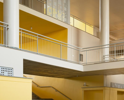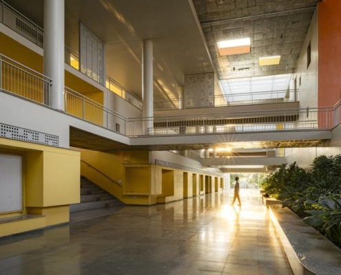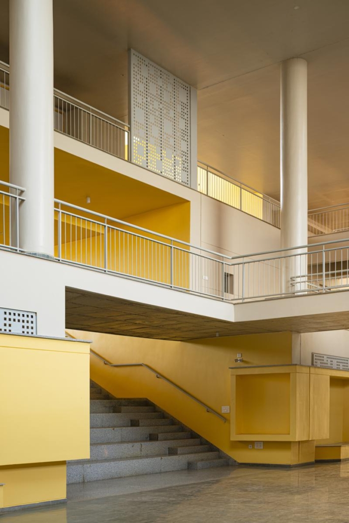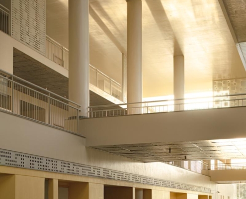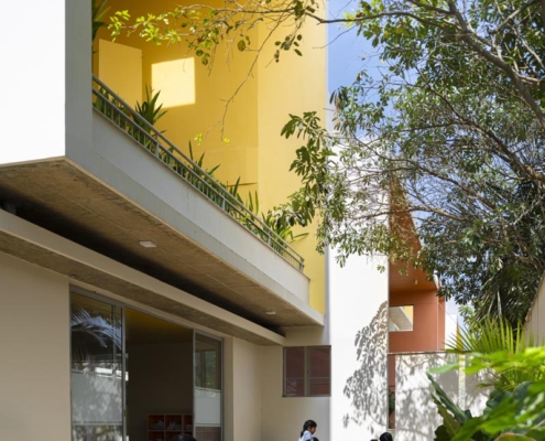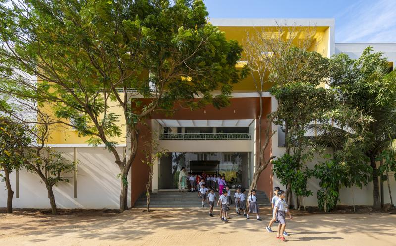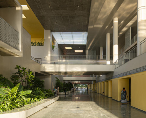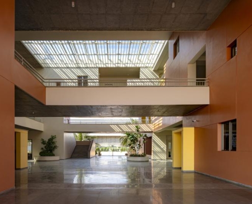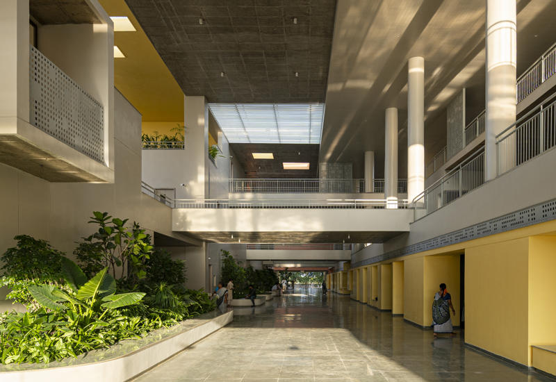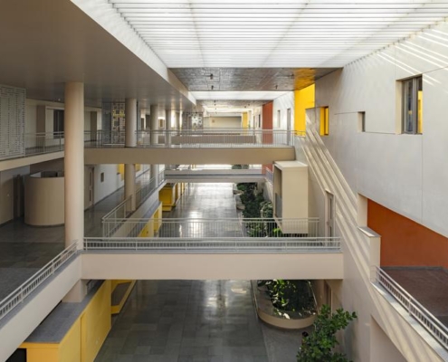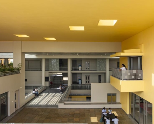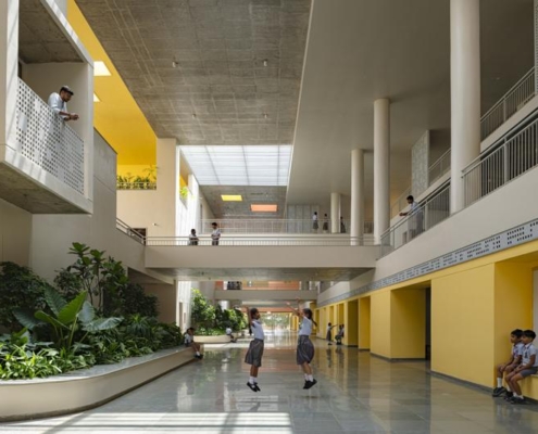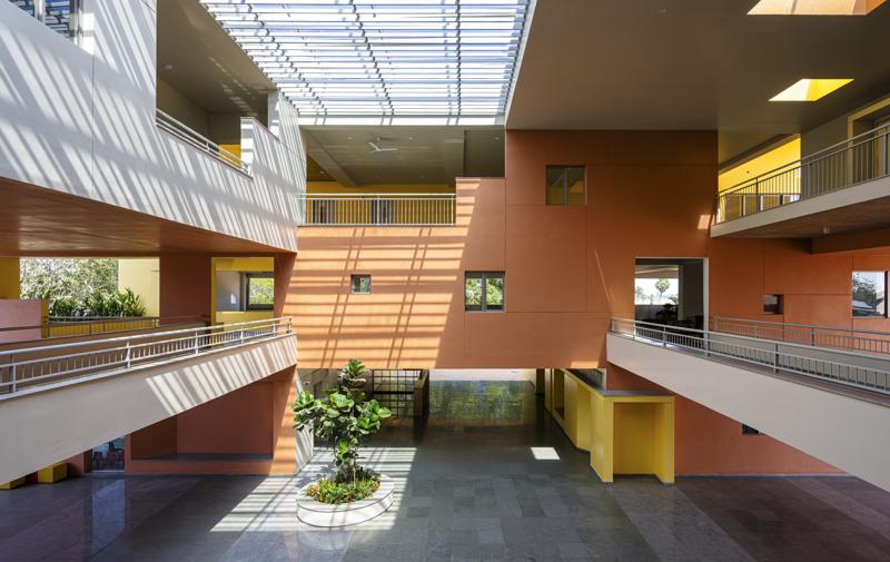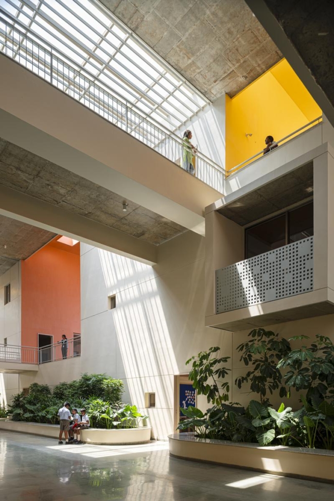 Mevcut bir kampüse ek olarak tasarlanan üç katlı yapı, doğu-batı aksında uzanıyor; uzun cephelerini kuzey ve güneye yönelterek ısı kazanımını minimize ediyor. Yapının merkezinde yer alan geniş üç kat yüksekliğindeki hacim, kuzey ve güney kanatlarını ayırıyor ve çok katlı köprülerle birbirine bağlanıyor. Bu ana mekana yukarıdan gelen gün ışığı, okul boyunca uzanan büyük tropik bitkilerle dolu saksılara ulaşıyor. Güney kanat, yüksek güneş ışığını alt katlardan koruyacak şekilde kademeli olarak geriye çekilmiş.