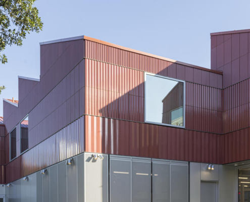 Değişken ritimlere sahip terakota cephe, çevredeki tuğla binaların dekoratif frizlerine gönderme yapıyor. Tuğlaya benzer üretim süreciyle elde edilen bu malzeme biyolojik olarak parçalanabilir ve bakım gerektirmiyor. İç mekanda yapının açıkta bırakılmış strüktürü, değişen pedagojilere uyum sağlayan ve aynı zamanda bir öğrenme aracı olarak işlev gören sağlam bir çerçeve sunuyor. Çelik elemanlar gelecekte sökülmeye olanak tanıyacak şekilde cıvatalı olarak monte edilmiş, böylece yapının yaşam döngüsüne uzun vadeli esneklik kazandırılmış.