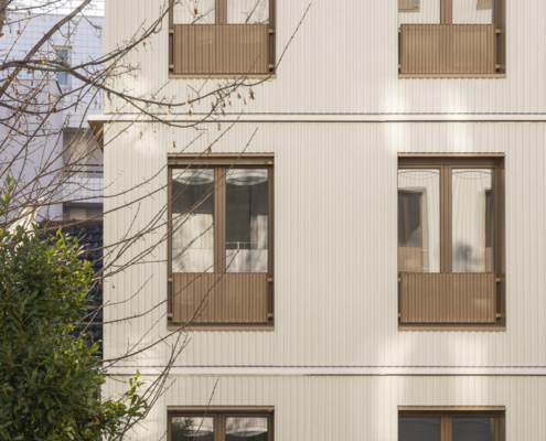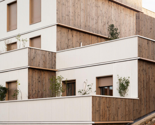 Projenin estetiği, hacimlerin ritmik ve grafiksel kompozisyonuyla temsil ediliyor. Cephelerde ahşap ve metal dönüşümlü olarak kullanılmış; ahşap güneş kırıcılar ve balkon altlıklarının ince çizgileri kütle etkisini hafifleterek gerçek bir görsel zarafet yaratıyor. Bu malzeme ve doku oyunu, yapının kentsel çevresine duyarlı bir entegrasyonunu sağlıyor. Arsanın morfolojik ve çevresel analizinden doğan bina formu, ışık ve gölgeyi en iyi şekilde yönetirken geniş bir açık mekan çeşitliliği sunuyor. Ahşap ve beton karışımı bir malzeme paletine sahip olan yapı için prefabrikasyon, kalite ve yapım bütünlüğü açısından anahtar rol oynamış. Metal kaplama, ahşap doğrama ve deflektörleri de içeren tüm ahşap cepheler atölyede tamamen üretilmiş böylece en yüksek uygulama kalitesi ve detay hassasiyeti sağlanmış. Tamamı prefabrike olarak üretilen ahşap ve metal balkonlar, kademeli kiriş yapılarına oturuyor ve cephe silüetini inceltici bir bütünlükle entegre ediliyor.
