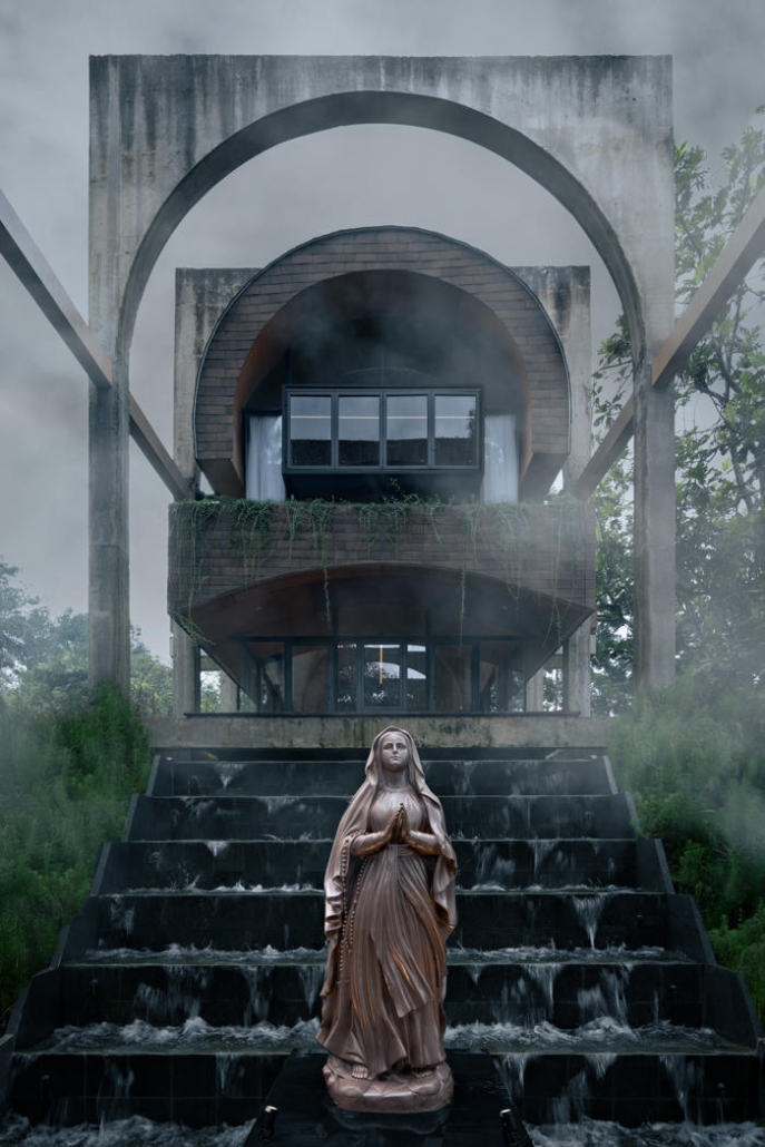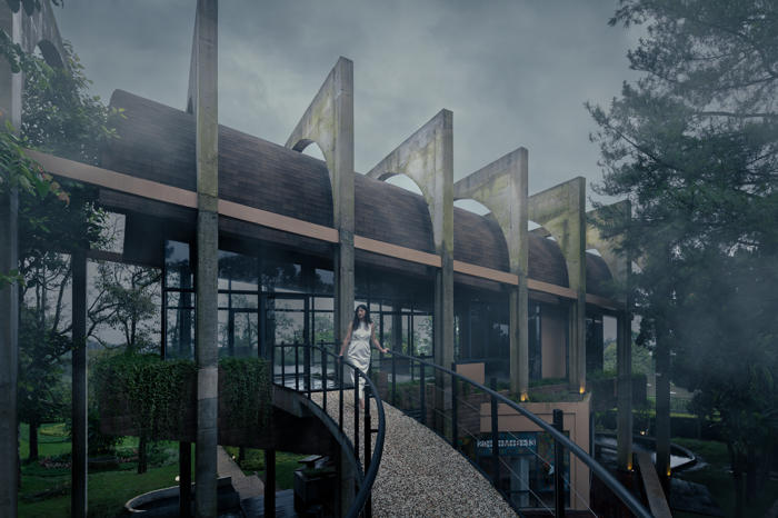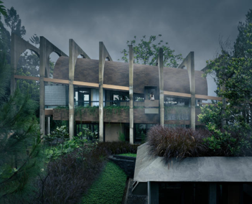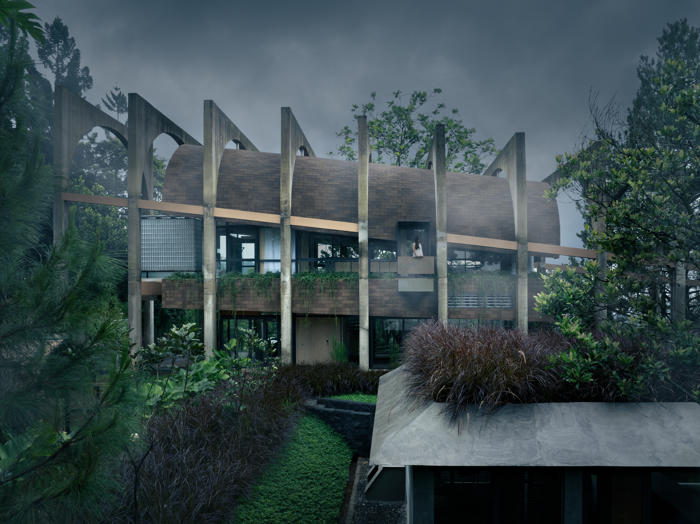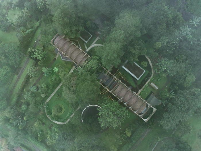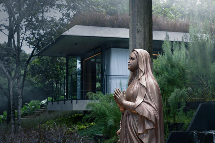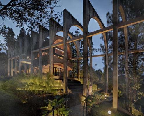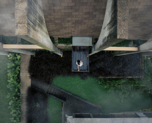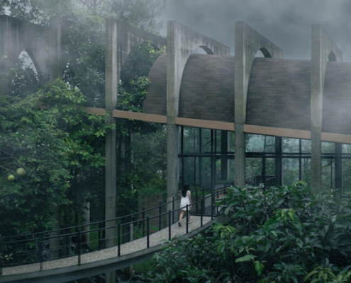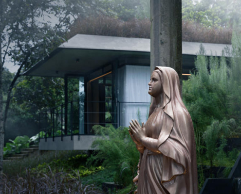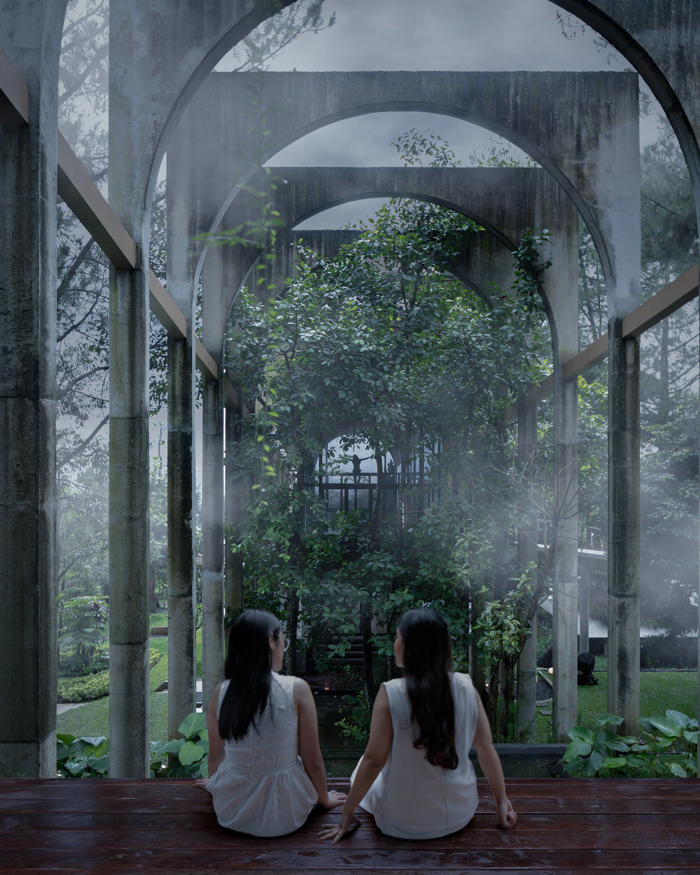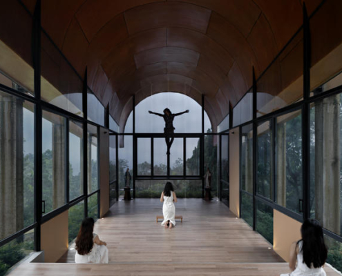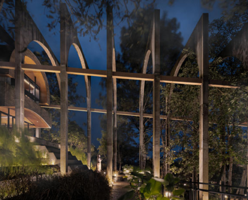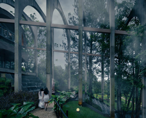 Endonezya’nın Bogor şehrinin yakınlarındaki kırsal bir arazide yer alan bu şapel, özel bir inziva alanı ve dua mekanı olarak yaptırılıyor; mimari ve etrafı çevreleyen engin doğa ile derinlikli ancak aynı zamanda incelikli bir ilişki kurması amaçlanıyor. Şapel, ziyaretçilerini sükunetin, huşunun ve zamansız bağlılığın içerisine çeken; onlara kent yaşamının yüksek temposundan kaçma fırsatı tanıyan villanın yanında, arada konumlanmış ve tersine çevrilmiş, muğlak bir tünel alanı barındırıyor. Tasarım, yamaç aşağı arkaik dış iskelet yapılarında bulunan sadeliğin bir tekrarını kullanarak kutsal alanları modernist bir mercekle yeniden tanımlıyor.