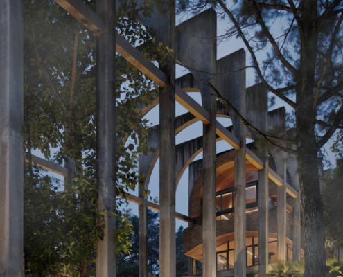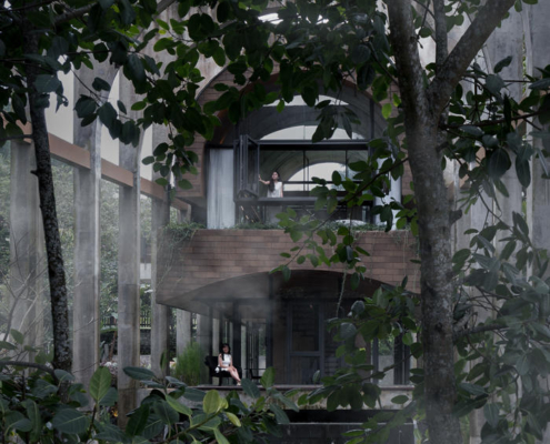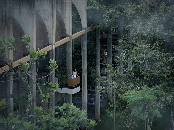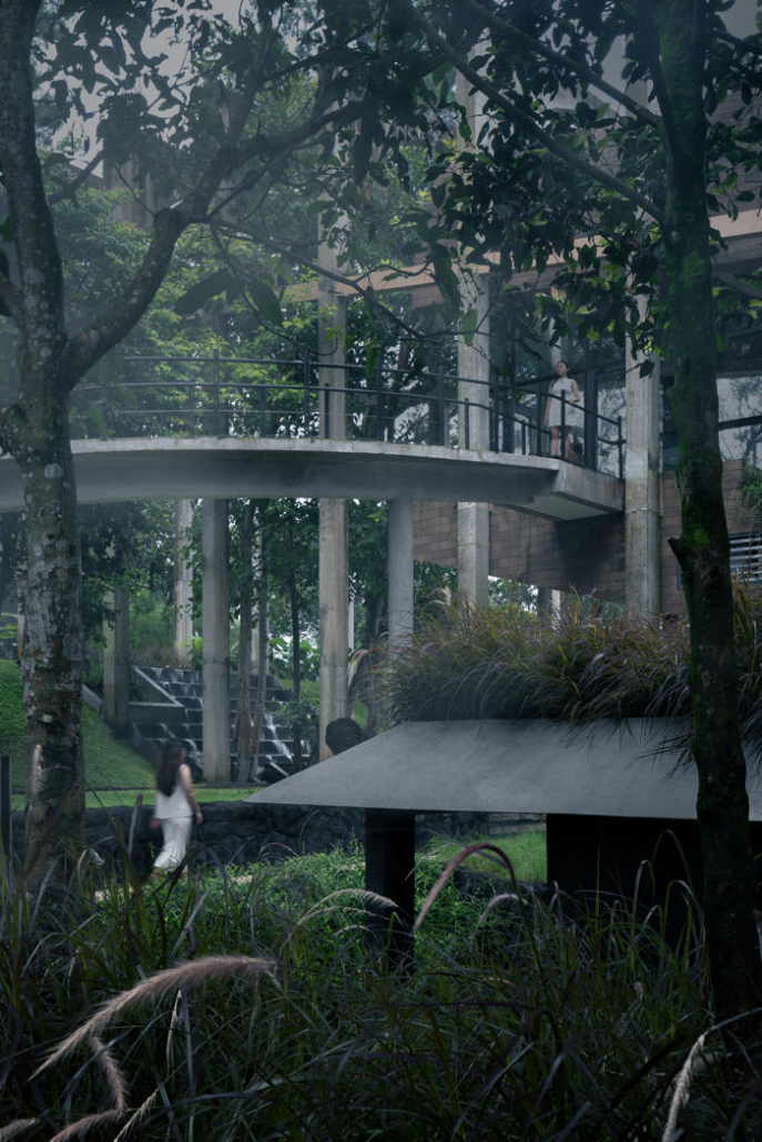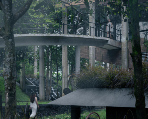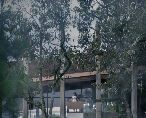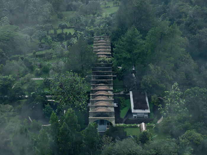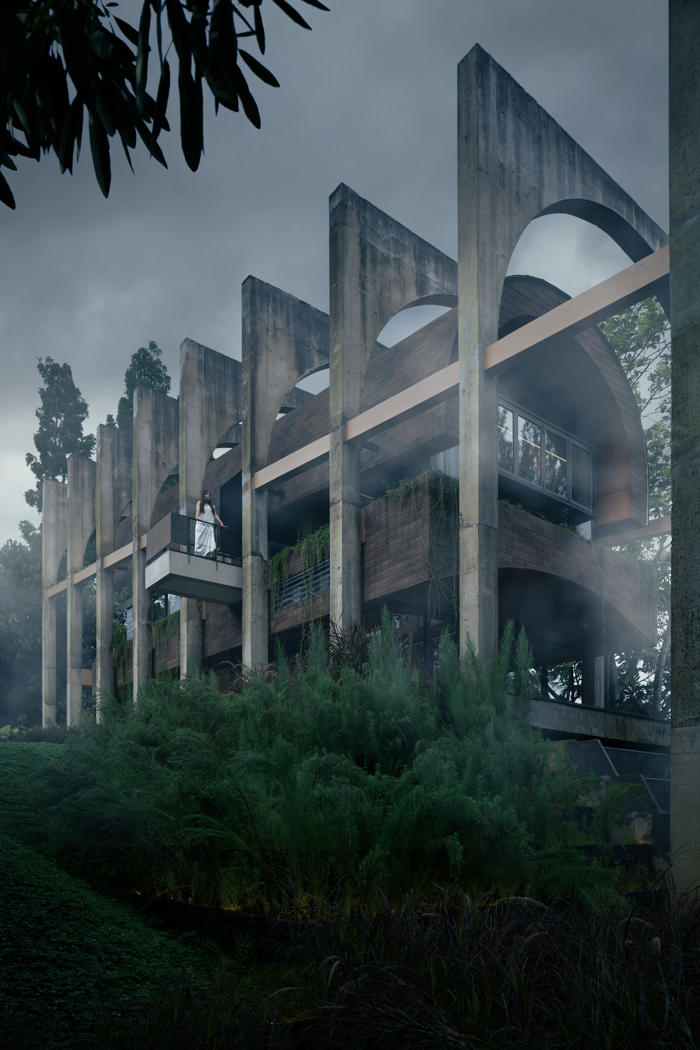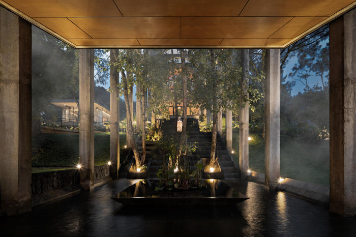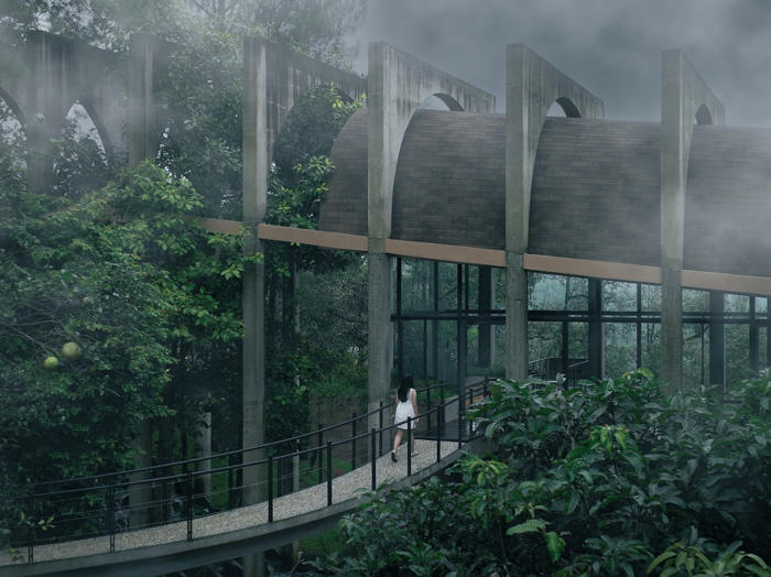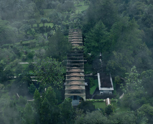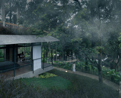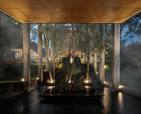 Endonezya’nın Bogor şehrinin yakınlarındaki kırsal bir arazide yer alan bu şapel, özel bir inziva alanı ve dua mekanı olarak yaptırılıyor; mimari ve etrafı çevreleyen engin doğa ile derinlikli ancak aynı zamanda incelikli bir ilişki kurması amaçlanıyor. Şapel, ziyaretçilerini sükunetin, huşunun ve zamansız bağlılığın içerisine çeken; onlara kent yaşamının yüksek temposundan kaçma fırsatı tanıyan villanın yanında, arada konumlanmış ve tersine çevrilmiş, muğlak bir tünel alanı barındırıyor. Tasarım, yamaç aşağı arkaik dış iskelet yapılarında bulunan sadeliğin bir tekrarını kullanarak kutsal alanları modernist bir mercekle yeniden tanımlıyor.