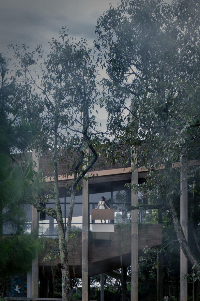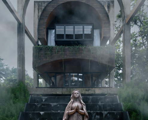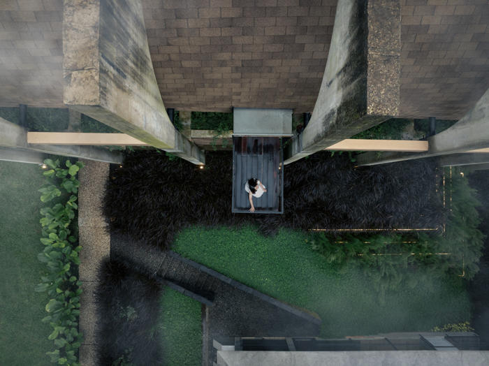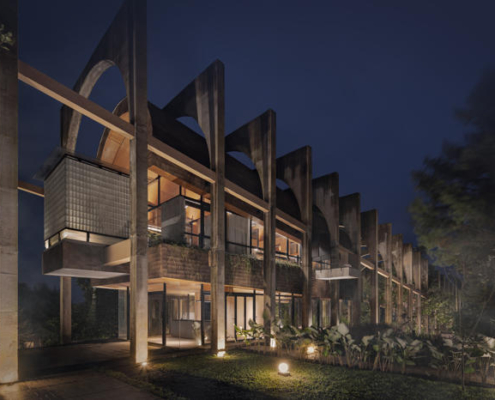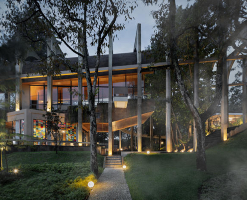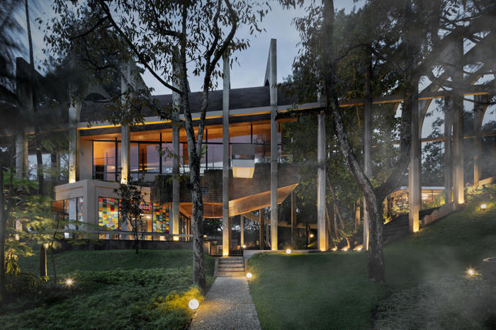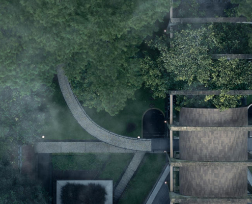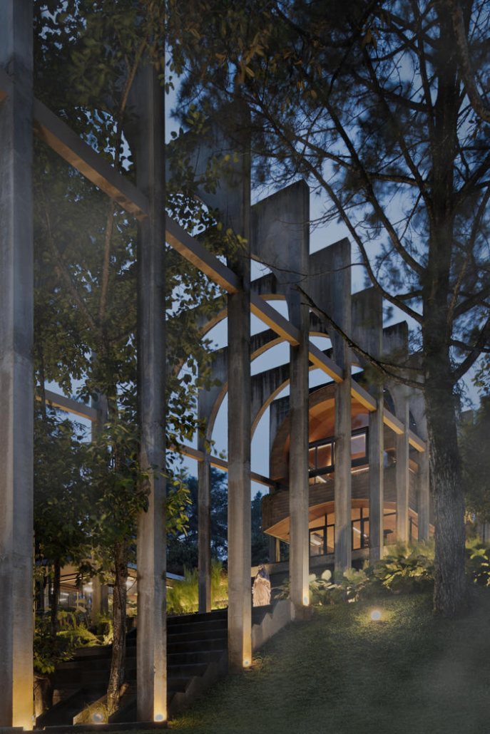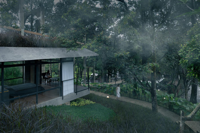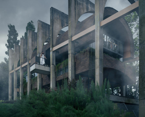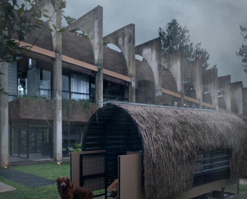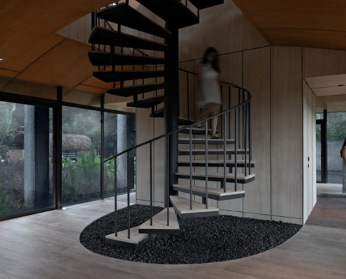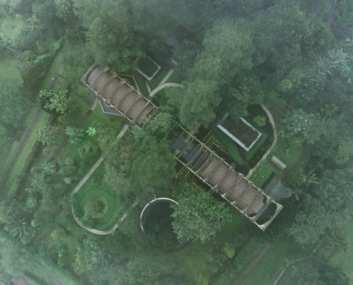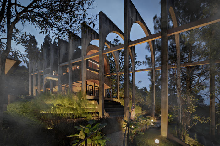 Endonezya’nın Bogor şehrinin yakınlarındaki kırsal bir arazide yer alan bu şapel, özel bir inziva alanı ve dua mekanı olarak yaptırılıyor; mimari ve etrafı çevreleyen engin doğa ile derinlikli ancak aynı zamanda incelikli bir ilişki kurması amaçlanıyor. Şapel, ziyaretçilerini sükunetin, huşunun ve zamansız bağlılığın içerisine çeken; onlara kent yaşamının yüksek temposundan kaçma fırsatı tanıyan villanın yanında, arada konumlanmış ve tersine çevrilmiş, muğlak bir tünel alanı barındırıyor. Tasarım, yamaç aşağı arkaik dış iskelet yapılarında bulunan sadeliğin bir tekrarını kullanarak kutsal alanları modernist bir mercekle yeniden tanımlıyor.