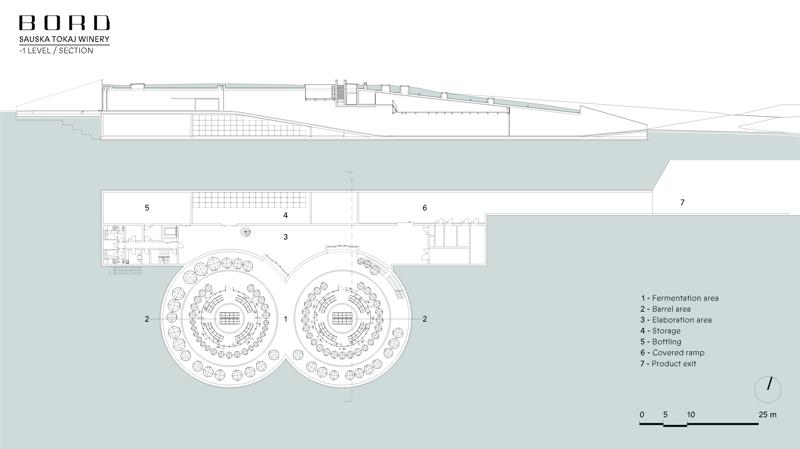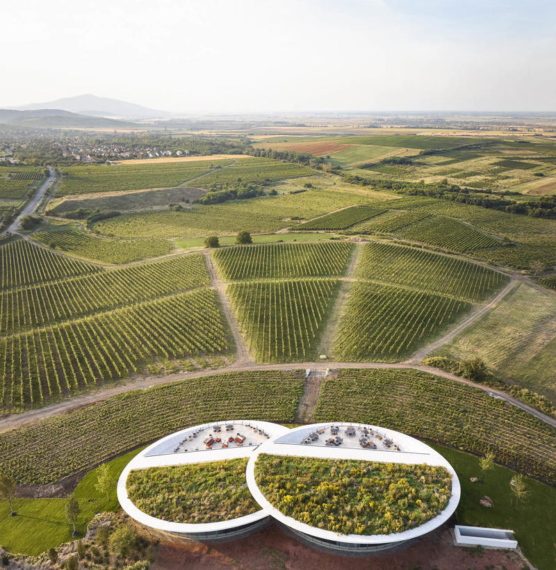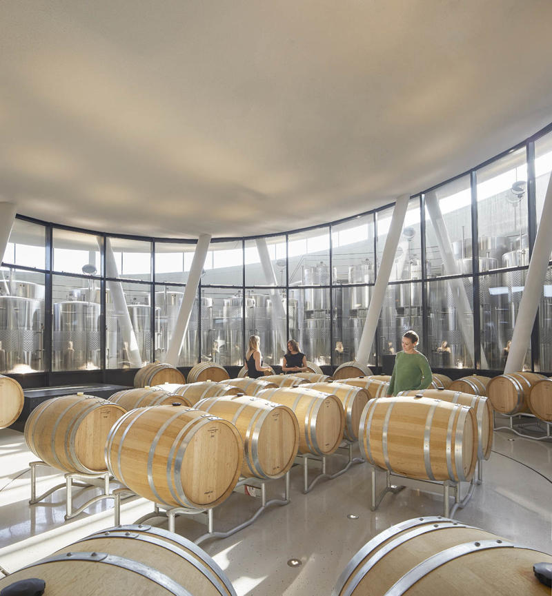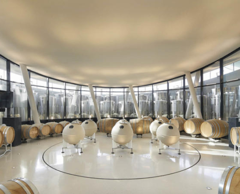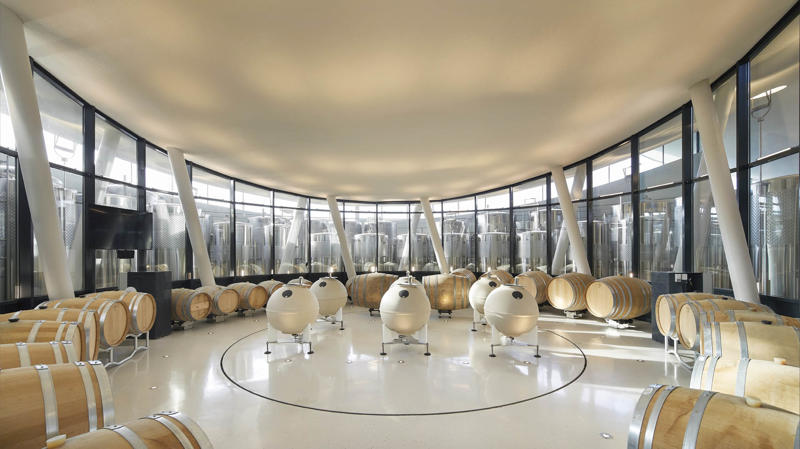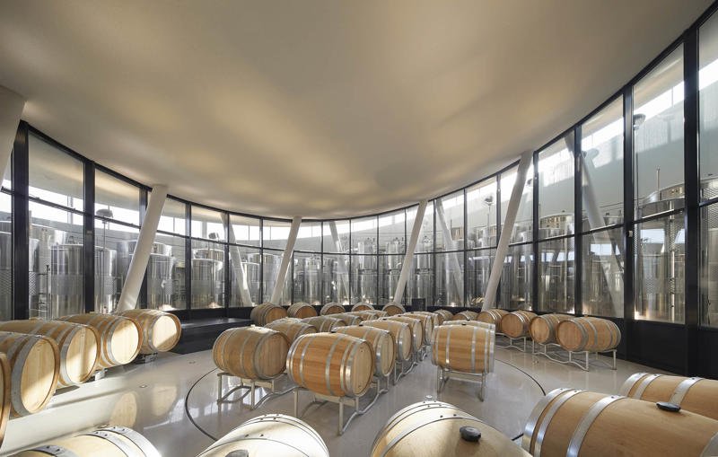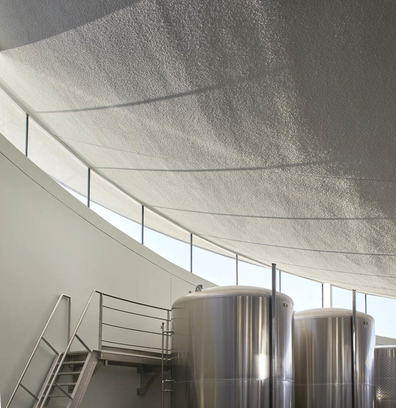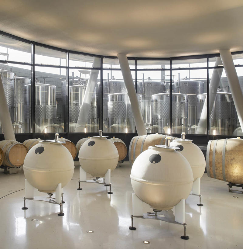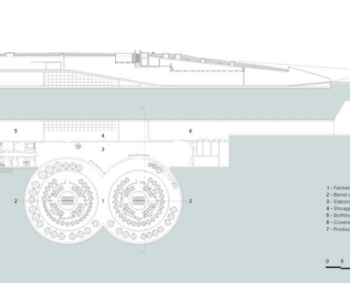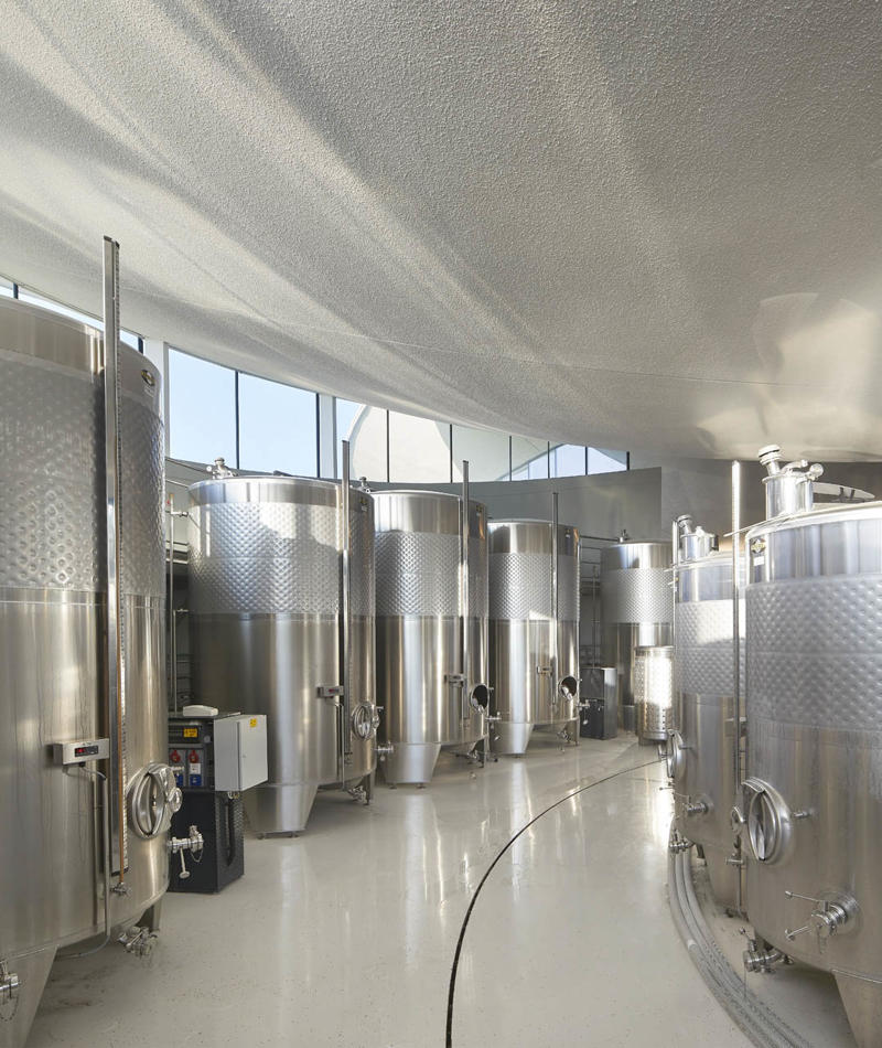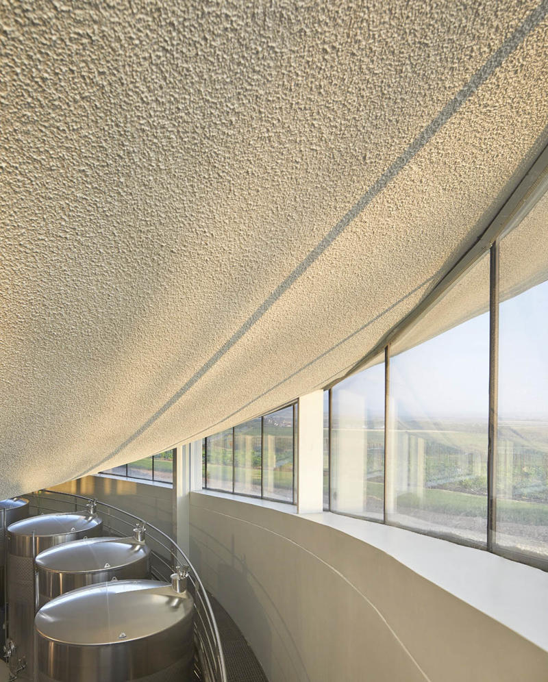 Padi Tepesi’nin güney yamaçlarında konumlanan şaraphane, birbirini kesen, 36 metre genişliğinde iki mercek biçimli kütleyle tanımlanıyor. Bu yükseltilmiş yapılar ziyaretçilere açıkken, sabit sıcaklık gerektiren işlevler (fermantasyon ve depolama) yer altına alınmış. Mahzen katındaki dramatik dairesel fermantasyon salonlarında paslanmaz çelik tanklar, ortadaki ahşap fıçı yıllandırma alanının etrafında dairesel düzende yerleşiyor. Üstte ise restoran ve bar, ince çelik kolonların taşıdığı yüzen kütlelerde konumlanıyor. Güneş ışığının kütlelerin alt yüzeyinde kayışı, yapının havada süzülme etkisini daha da artırıyor.