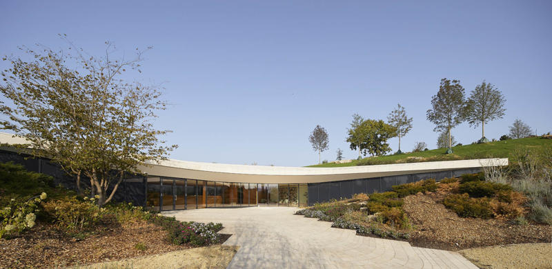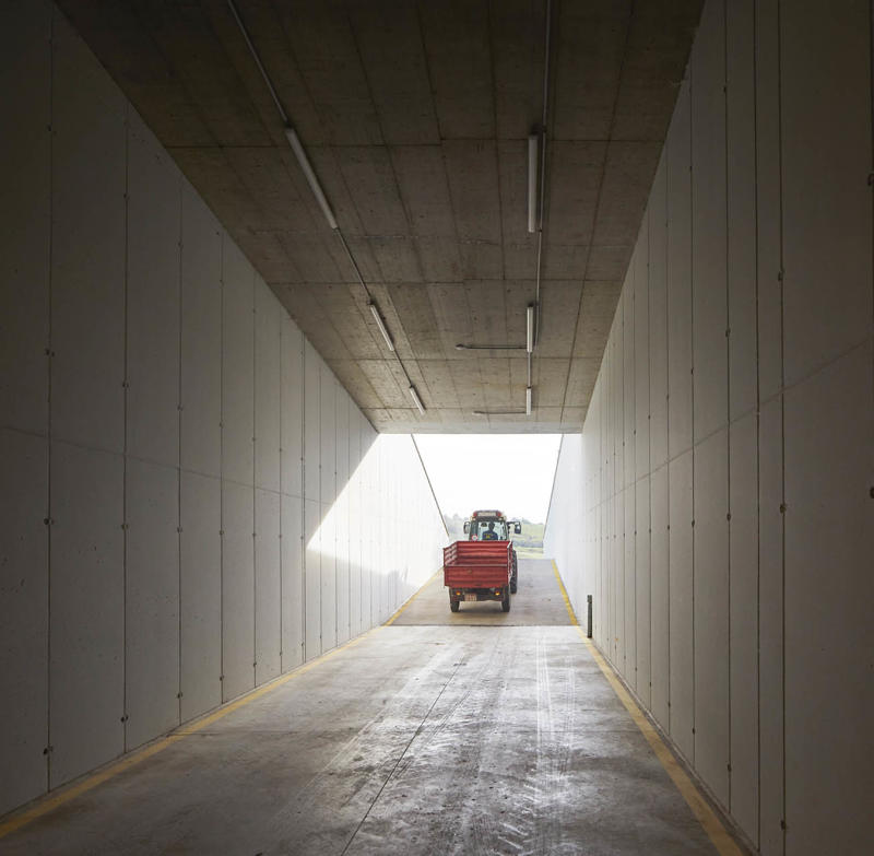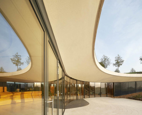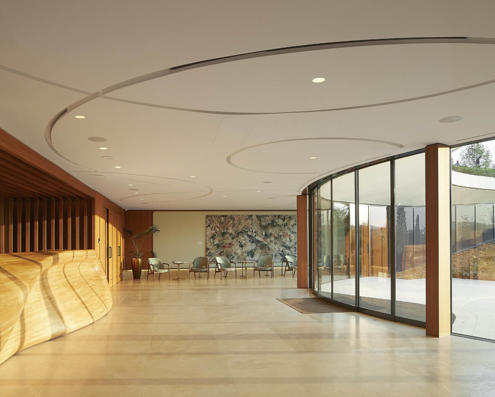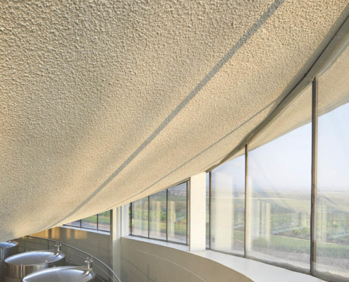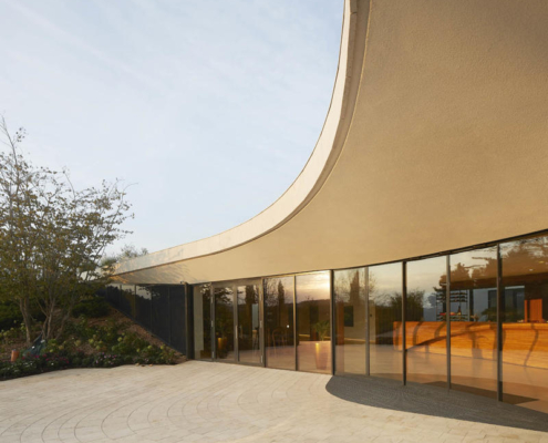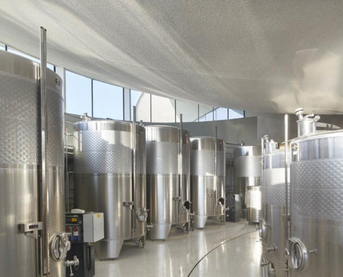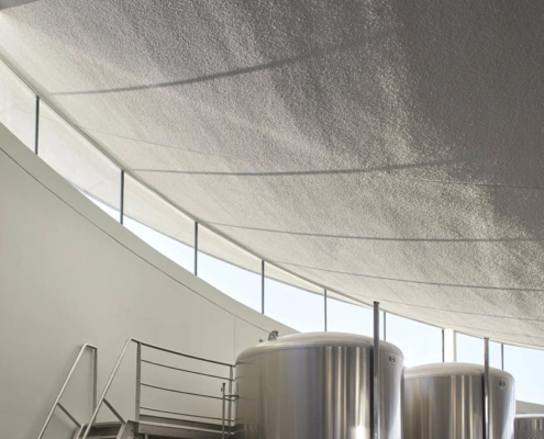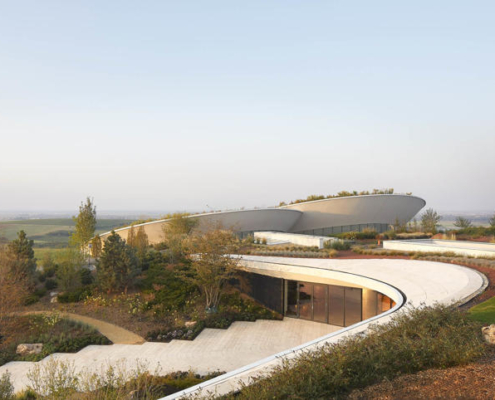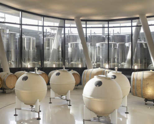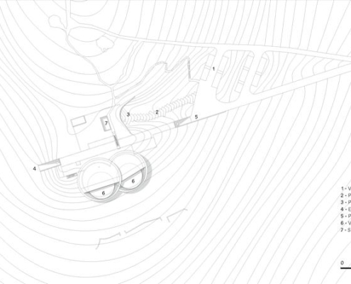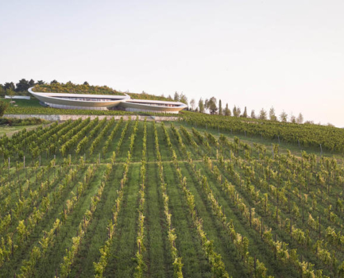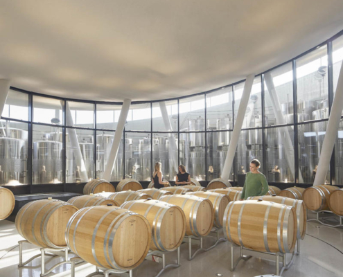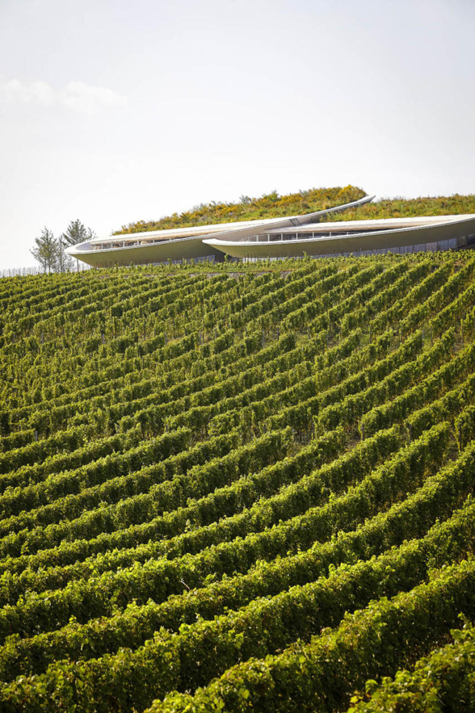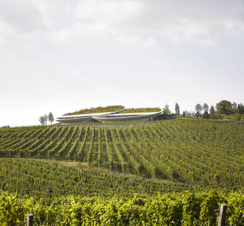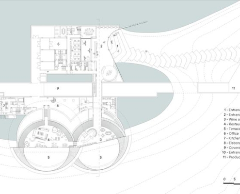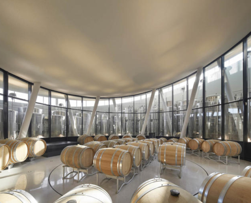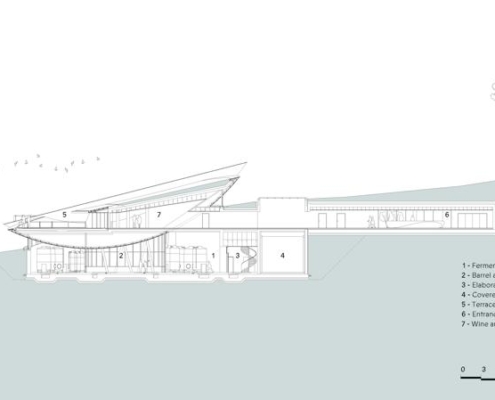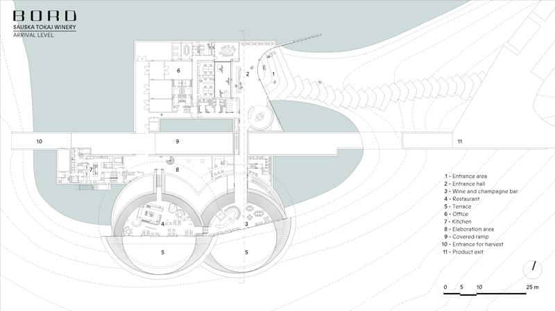 Padi Tepesi’nin güney yamaçlarında konumlanan şaraphane, birbirini kesen, 36 metre genişliğinde iki mercek biçimli kütleyle tanımlanıyor. Bu yükseltilmiş yapılar ziyaretçilere açıkken, sabit sıcaklık gerektiren işlevler (fermantasyon ve depolama) yer altına alınmış. Mahzen katındaki dramatik dairesel fermantasyon salonlarında paslanmaz çelik tanklar, ortadaki ahşap fıçı yıllandırma alanının etrafında dairesel düzende yerleşiyor. Üstte ise restoran ve bar, ince çelik kolonların taşıdığı yüzen kütlelerde konumlanıyor. Güneş ışığının kütlelerin alt yüzeyinde kayışı, yapının havada süzülme etkisini daha da artırıyor.